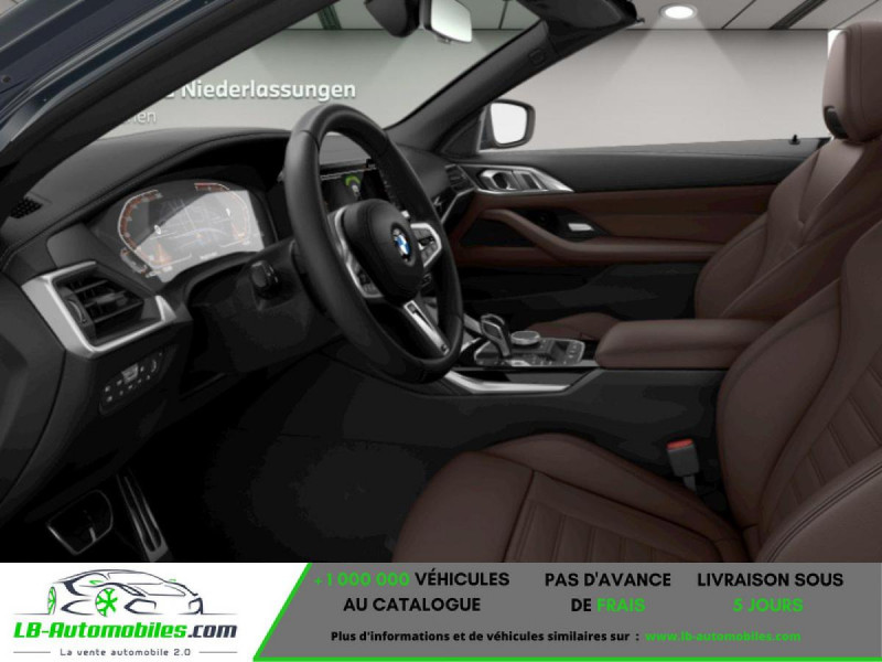 Référence : 1070662 Vos Avantages chez LB-AUTOMOBILES.com / Prix affiché TTC Livré hors carte grise / Livraison sous 10 jours dans toute la France hors 31 / Pas d?avance de frais paiement du véhicule 100% à la livraison par virement. BMW Série 4 Cabriolet Neuf remisée, BMW Série 4 Cabriolet Occasion Toulouse Beaupuy 31850, BMW Série 4 Cabriolet Véhicule sorti de réseau collaborateur, BMW Série 4 Cabriolet import, BMW Série 4 Cabriolet importateur, BMW Série 4 Cabriolet Livraison possible dans toute la France sous 5 jours, BMW Série 4 Cabriolet, BMW Série 4 Cabriolet Location Option Achat, BMW Série 4 Cabriolet LLD, BMW Série 4 Cabriolet Longue Durée, BMW Série 4 Cabriolet TVA récupérable. Possibilité d'extension de garantie 12, 24,36 mois, Pour tout autres voitures import neufs ou occasions collaborateur fortement remisée, Mandataire Audi, Mandataire BMW, Mandataire Volkswagen, Mandataire Mercedes, Mandataire Peugeot Espagne, Mandataire Renault Espagne, Porsche import, Mandataire Citroën Espagne, Mandataire Seat Espagne, n'hésitez pas à nous contacter. « Sous réserve de vente préalable et erreur de saisie » Principaux équipements : - ABS - Affichage tête haute - Airbags frontaux - Antidémarrage - Assistance de démarrage en côte - Bluetooth - Capteur de lumière - Capteur de pluie - Climatisation automatique - Cockpit numérique - Commande vocale - Contrôle de la pression des pneus - Direction assistée - Éclairage d'ambiance - Écran tactile - ESP - Fermeture centralisée - Garantie - GPS - Isofix - Jantes alliage - Kit mains libres - Ordinateur de bord - Pack sport - Phare antibrouillard - Port USB - Radio DAB - Régulateur de vitesse - Rétroviseur intérieur anti-éblouissement automatique - Sièges chauffants - Suspension sport - Système antipatinage - Système d'alarme - Système d'appel d'urgence - Système de sonorisation - Système Stop & Start - Tuner/radio - Verrouillage centralisé sans clé - Vitres électriques - Volant chauffant - Volant en cuir - Volant multifonction - WLAN / point d'accès Wi-Fi - Radar de recul : Avant, Arrière, Systèmes de pilotage automatique - Première main : Oui
