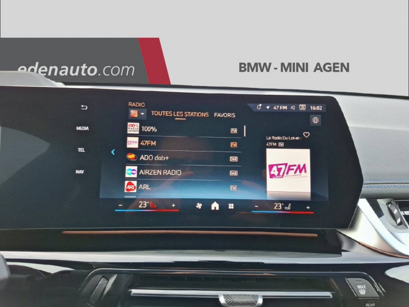 2 porte-gobelets sur la console centrale / 3ème feu stop LED intégré au spoiler AR / 5 places / Accoudoir central AV avec panneau de commande intégré / Active Guard Avertissement de franchissement de ligne avec impulsion sur la direction (>70km/h).Avertisseur de collision frontale avec intervention de freinage (3-210km/h).Avertisseur de présence d'un véhicule lors d'un changement de direction vers la gauche avec action sur les freins (3-35km/h).Avertisseur d'intersection (détection risque collision latérale 3-85km/h).Avertisseur présence piéton/cycliste lors d'un virage en intersection (3-35km/h).Assistance de limitation de vitesse. / Airbag entre les deux sièges AV en cas de collision latérale / Airbag passager AV désactivable via la clé / Airbags de tête à l'AV et aux places latérales AR / Alarme antivol / Appel d'Urgence Intelligent (durée de vie de la voiture) / Assistant dynamique de motricité (DTC) / BMW Digital (BMW Maps, RTTI sur itinéraire, Apple CarPlay, Android Auto, BMW Intelligent Personal Assistant) / BMW EfficientDynamics Système de récupération de l'énergie au freinage, Fonction d'arrêt et de redémarrage automatique du moteur, Direction à assistance électrique Servotronic (assistance variable selon la vitesse) / BMW Live Cockpit Navigation Plus avec Ecran Widescreen / BMW Live Cockpit Plus / Boîte de vitesses automatique 7 rapports avec palettes au volant / Buse de lave-glace pour caméra de recul / Câble de recharge Professionnel Mode 3 (T2-T2) pour la recharge publique - 5 mètres Câble de recharge Professionnel de Mode 3 triphasé avec prises Type 2 - Type 2 destinéà la recharge sur bornes publiques ou privées. Peut être utilisé sur une borne de recharge raccordée en courant monophasé ou triphasé avec des puissances de charge maximales : 7,4 kW / 32 A (en monophasé) et de 22 kW / 32 A (en triphasé). Rangement dans le coffret à câbles sous le cache du compartiment à bagages. Couleur Gris basalte. / Capteur d'impact (Activation de l'airbag, des feux de détresse, de l'éclairage intérieur, Déverrouillage des portes, Activation de la borne batterie de sécurité) / Carte SIM 4G LTE pour les Services ConnectedDrive / Ceintures de sécurité 3 points pour toutes les places / Chargeur courant alternatif AC Plus 11kW / Ciel de pavillon M Anthracite / Clés radiocommandées à mémorisation automatique des réglages "Personal Profile" (x 2) / Clignotants LED intégrés aux feux de jour / Climatisation automatique 2 zones Contrôle de la température et du volume d'air distribué avec 5 niveaux d'intensité, réglables séparément entre le conducteur et le passager. Fonctionnalité SYNC pour que les réglages du conducteur s'appliquent à l'ensemble de l'habitacle. Contrôle commun de la température à l'AR. Capteur d'humidité et d'ensoleillement, filtre à charbon actif et microfiltre. / Commande électrique du hayon de coffre / Compartiment à bagages : 2 crochets de sac, filet sur panneau garuche, prise 12V, rangement additionel au modèle) sous plancher amovible / Compatible Plug&Charge sur certaines bornes publiques / Console centrale avec insert noir brillant / Contour de vitres noir mat / Contrôle de freinage en courbe CBC / Contrôle dynamique du freinage (DBC) / Désignation du modèle à droite du hayon / Détecteur de pluie et allumage automatique des projecteurs / Double VANOS (système de distribution variable) / Eclairage de bienvenue autour du véhicule / Eclairage de plaque d'immatriculation à LED / Eléments extérieurs M Sport / Eléments intérieur M / Equipements supplémentaires Pack M Sport / Feux AR à LED intégrant les clignotants / Feux de sortie de porte AV (porte ouverte) / Fixations ISOFIX / i-Size pour les deux sièges AR extérieurs / Fonction cargo : Réglage de l'inclinaison de la banquette AR à 12 degrés (volume de chargement supplémentaire d' environ 85-100 litres) / Fonctionnalité "Follow Me Home" (éclairage d'accompagnement) : les feux de croisement restent allumés quelques instants une fois le contact coupé / Fonction Start&Stop automatique / Freinage de séchage / Frein de parking électromécanique avec fonction "Automatic Hold" / Grilles de calandre cerclées de chrome avec barreaux verticaux noirs / HotSpot Wi-Fi / Injection haute pression / Inserts décoratifs Aluminium M Hexacube / Jantes en alliage léger 18" style 838 M Gris foncé. Bicolore 7.5 J x 18 pneus 225/55 R 18. Montage chaînes à neige impossible. / Kit de mobilité Plus - Bouteille avec liquide anti-crevaison - Compresseur avec alimentation autonome via batterie rechargeable - Système se fixant au centre de la jante avec maintient de pression automatique du pneu crevé durant la conduite - Simple d'utilisation et réduction du temps passé sur le lieu de la panne / Kit éclairage / Kit rangement / Lève-vitres AV/AR électriques avec commande par impulsion et sécurité enfants / Mesure individuelle de pression des pneumatiques / Moteur TwinPower Turbo essence 3 cylindres - Turbocompresseur - Valvetronic (modification de la profondeur d'ouverture des soupapes d'admission) - Double VANOS (système de distribution variable) - Injection haute pression - Filtre à particules / My Modes: 5 modes de conduite (Personnel, Efficient, Sport, Relax, Expressive) / Norme General Safety Regulation 2 (GSR2) / Notice d'utilisation de la voiture intégrée et carnet d'entretien électronique avec BMW Service History / Ordinateur de bord avec Check-Control et indicateur de température extérieure / Pare-choc AR avec inserts chromés en L / Pare-choc AV avec air curtains en noir mat / Parking Assistant Comprend l'option Caméra de recul. Manoeuvres de stationnemment en créneau et en bataille facilitées par mesure automatique, Assistant de marche AR/Auto-reverse / Performance control : contrôle du moteur et interventions freinage pour améliorer l'agilité et la neutralité en virage / Personal eSIM Personal eSIM est la version