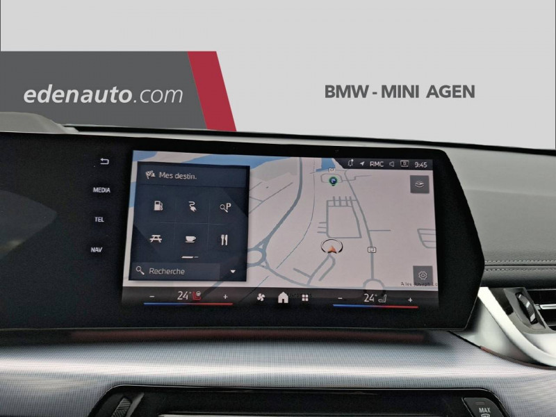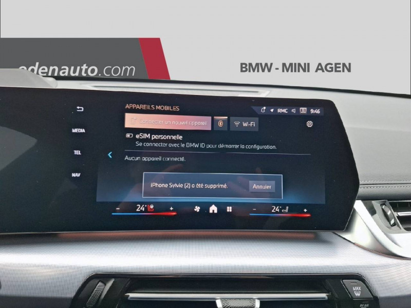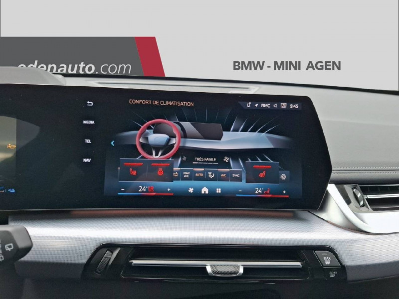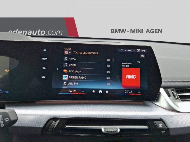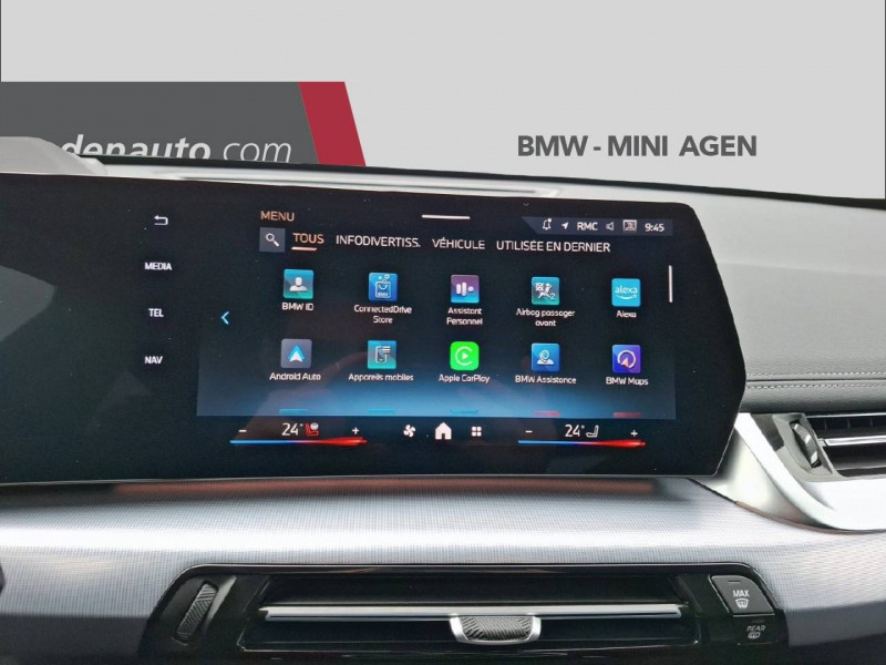 2 porte-gobelets sur la console centrale / 3ème feu stop LED intégré au spoiler AR / 5 places / Accoudoir central AV avec panneau de commande intégré / Active Guard Avertissement de franchissement de ligne avec impulsion sur la direction (>70km/h).Avertisseur de collision frontale avec intervention de freinage (3-210km/h).Avertisseur de présence d'un véhicule lors d'un changement de direction vers la gauche avec action sur les freins (3-35km/h).Avertisseur d'intersection (détection risque collision latérale 3-85km/h).Avertisseur présence piéton/cycliste lors d'un virage en intersection (3-35km/h).Assistance de limitation de vitesse. / Airbag entre les deux sièges AV en cas de collision latérale / Airbag passager AV désactivable via la clé / Airbags de tête à l'AV et aux places latérales AR / Alarme antivol / Aluminium Line satiné BMW Individual / Appel d'Urgence Intelligent (durée de vie de la voiture) / Assistant dynamique de motricité (DTC) / BMW Digital (BMW Maps, RTTI sur itinéraire, Apple CarPlay, Android Auto, BMW Intelligent Personal Assistant) / BMW EfficientDynamics Système de récupération de l'énergie au freinage, Fonction d'arrêt et de redémarrage automatique du moteur, Direction à assistance électrique Servotronic (assistance variable selon la vitesse) / BMW Live Cockpit Navigation Plus avec Ecran Widescreen / BMW Live Cockpit Plus / Boîte de vitesses automatique à 7 rapports Boîte de vitesses automatique à 7 rapports avec sélecteur électronique. / Buse de lave-glace pour caméra de recul / Câble de recharge Professionnel Mode 3 (T2-T2) pour la recharge publique - 5 mètres Câble de recharge Professionnel de Mode 3 triphasé avec prises Type 2 - Type 2 destinéà la recharge sur bornes publiques ou privées. Peut être utilisé sur une borne de recharge raccordée en courant monophasé ou triphasé avec des puissances de charge maximales : 7,4 kW / 32 A (en monophasé) et de 22 kW / 32 A (en triphasé). Rangement dans le coffret à câbles sous le cache du compartiment à bagages. Couleur Gris basalte. / Capteur d'impact (Activation de l'airbag, des feux de détresse, de l'éclairage intérieur, Déverrouillage des portes, Activation de la borne batterie de sécurité) / Carte SIM 4G LTE pour les Services ConnectedDrive / Ceintures de sécurité 3 points pour toutes les places / Chargeur courant alternatif AC Plus 11kW / Clés radiocommandées à mémorisation automatique des réglages "Personal Profile" (x 2) / Clignotants LED intégrés aux feux de jour / Climatisation automatique 2 zones Contrôle de la température et du volume d'air distribué avec 5 niveaux d'intensité, réglables séparément entre le conducteur et le passager. Fonctionnalité SYNC pour que les réglages du conducteur s'appliquent à l'ensemble de l'habitacle. Contrôle commun de la température à l'AR. Capteur d'humidité et d'ensoleillement, filtre à charbon actif et microfiltre. / Commande électrique du hayon de coffre / Compartiment à bagages : 2 crochets de sac, filet sur panneau garuche, prise 12V, rangement additionel au modèle) sous plancher amovible / Compatible Plug&Charge sur certaines bornes publiques / Console centrale avec insert noir brillant / Contour de vitres noir mat / Contrôle de freinage en courbe CBC / Contrôle dynamique du freinage (DBC) / Désignation du modèle à droite du hayon / Détecteur de pluie et allumage automatique des projecteurs / Double VANOS (système de distribution variable) / Eclairage de bienvenue autour du véhicule / Eclairage de plaque d'immatriculation à LED / Eléments extérieurs xLine / Feux AR à LED intégrant les clignotants / Feux de sortie de porte AV (porte ouverte) / Fixations ISOFIX / i-Size pour les deux sièges AR extérieurs / Fonction cargo : Réglage de l'inclinaison de la banquette AR à 12 degrés (volume de chargement supplémentaire d' environ 85-100 litres) / Fonctionnalité "Follow Me Home" (éclairage d'accompagnement) : les feux de croisement restent allumés quelques instants une fois le contact coupé / Fonction Start&Stop automatique / Freinage de séchage / Frein de parking électromécanique avec fonction "Automatic Hold" / Grilles de calandre cerclées de chrome avec barreaux verticaux noirs / HotSpot Wi-Fi / Injection haute pression / Inserts décoratifs brillant "Schwarz" soulignés de chrome perlé / Jantes en alliage léger 18" style 866 7,5 J x 18 / pneus 225/55 R 18 , Gris clair. Bicolore Montage chaînes à neige impossible. / Kit de mobilité Plus - Bouteille avec liquide anti-crevaison - Compresseur avec alimentation autonome via batterie rechargeable - Système se fixant au centre de la jante avec maintient de pression automatique du pneu crevé durant la conduite - Simple d'utilisation et réduction du temps passé sur le lieu de la panne / Kit éclairage / Kit rangement / Lève-vitres AV/AR électriques avec commande par impulsion et sécurité enfants / Mesure individuelle de pression des pneumatiques / Moteur TwinPower Turbo essence 3 cylindres - Turbocompresseur - Valvetronic (modification de la profondeur d'ouverture des soupapes d'admission) - Double VANOS (système de distribution variable) - Injection haute pression - Filtre à particules / My Modes: 5 modes de conduite (Personnel, Efficient, Sport, Relax, Expressive) / Norme General Safety Regulation 2 (GSR2) / Notice d'utilisation de la voiture intégrée et carnet d'entretien électronique avec BMW Service History / Ordinateur de bord avec Check-Control et indicateur de température extérieure / Pare-choc AR avec inserts chromés en L / Pare-choc AV avec air curtains en noir mat / Parking Assistant Comprend l'option Caméra de recul. Manoeuvres de stationnemment en créneau et en bataille facilitées par mesure automatique, Assistant de marche AR/Auto-reverse / Performance control : contrôle du moteur et interventions freinage pour améliorer l'agilité et la neutralité en virage / Personal eSIM Personal e