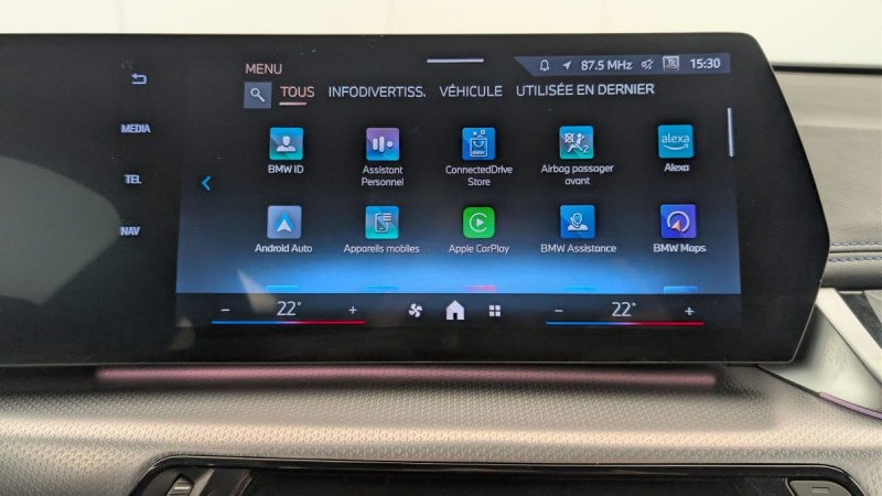 Régulateur de vitesse avec fonction de freinage et limiteur de vitesse / Frein de parking électromécanique avec fonction "Automatic Hold" / Tuner DAB Inclus DAB+. Permet la réception de la radio numérique en plus de la radio analogique et offre une qualité sonore proche du CD. Des informations supplémentaires comme le titre et l'interprète sont transmises sous forme de texte. La Radio Numérique Terrestre est disponible à Paris, Marseille, Nice et Monaco, Lille, Lyon, Nantes, Rouen, Strasbourg et Toulouse. Les stations de radio numériques sont essentiellement des stations associatives, locales ou indépendantes / Alarme antivol / Airbag passager AV désactivable via la clé / Notice d'utilisation de la voiture intégrée et carnet d'entretien électronique avec BMW Service History / Lève-vitres AV/AR électriques avec commande par impulsion et sécurité enfants / Détecteur de pluie et allumage automatique des projecteurs / HotSpot Wi-Fi / Kit rangement : Bac de rangement dans les portes AV et AR avec porte-bouteille Compartiment de rangement central Compartiment de rangement avec couvercle rabattable sous l'accoudoir central AV Crochets de vêtements AR / Services Après-vente connectés BMW TeleServices (durée de vie de la voiture) Appel Automatique Appel Manuel Appel "BMW Assistance Teleservice Battery Guard Appel Hotline / Contrôle dynamique du freinage (DBC) / Appel d'Urgence Intelligent (durée de vie de la voiture) / 2 porte-gobelets sur la console centrale / Carte SIM 4G LTE pour les Services ConnectedDrive / Mesure individuelle de pression des pneumatiques / BMW Live Cockpit Plus / Désignation du modèle à droite du hayon / Kit éclairage : Eclairage intérieur de l'accoudoir central Lampes de courtoisie Eclairage plancher AV et AR Eclairage du miroir de courtoisie Lampes de lecture centrales Eclairage coffre à bagages sur un côté Eclairage habitacle AV et AR / Triangle de présignalisation avec kit de premiers secours / Airbags de tête à l'AV et aux places latérales AR / Ciel de pavillon M Anthracite / Shadow Line M brillant Eléments en noir à haute brillance : - Panneaux de garnissage des montants B et C - Encadrement extérieur des vitres latérales - Pieds et triangles des rétroviseurs extérieurs - Rails de toit (Touring) / Rails de toit Shadow M Line brillant / Eclairage de plaque d'immatriculation à LED / Feux AR à LED intégrant les clignotants / Connectivité téléphone Bluetooth avec interface USB / Boîte de vitesses automatique 7 rapports avec palettes au volant / Eléments intérieur M / 3ème feu stop LED intégré au spoiler AR / Clignotants LED intégrés aux feux de jour / Contour de vitres noir mat / Eclairage de bienvenue autour du véhicule / Feux de sortie de porte AV (porte ouverte) / Grilles de calandre cerclées de chrome avec barreaux verticaux noirs / Pare-choc AV avec air curtains en noir mat / Pare-choc AR avec inserts chromés en L / Poignées de portes affleurantes / Sorties d'échappement non visibles / Accoudoir central AV avec panneau de commande intégré / Console centrale avec insert noir brillant / Fonction cargo : Réglage de l'inclinaison de la banquette AR à 12 degrés (volume de chargement supplémentaire d' environ 85-100 litres) / Buse de lave-glace pour caméra de recul / Commande électrique du hayon de coffre / Prises de courant 12V dans la console centrale AV et dans le coffre / Stabilisation de remorque / Freinage de séchage / Personal eSIM Personal eSIM est la version électronique, intégrée au véhicule, de la carte SIM traditionnelle. Vous l'utilisez via un abonnement souscrit auprès d'un opérateur téléphonique et transformez ainsi votre BMW en périphérique mobile supplémentaire : - Connectivité en 5G - Meilleure qualité de connexion grâce aux antennes de la voiture - Connexion Hotspot Wi-Fi avec la possibilité de connecter jusqu'à 10 appareils (ex : tablette numérique, smartphone, ordinateur, ...) / Suspension Adaptive M / Fixations ISOFIX / i-Size pour les deux sièges AR extérieurs / Compartiment à bagages : 2 crochets de sac, filet sur panneau garuche, prise 12V, rangement additionel au modèle) sous plancher amovible / Sièges AV réglables manuellement : avance, hauteur et inclinaison du dossier / Injection directe Common Rail / Réduction catalytique via injection d'AdBlue (SCR) / My Modes: 5 modes de conduite (Personnel, Efficient, Sport, Relax, Expressive) / Performance control : contrôle du moteur et interventions freinage pour améliorer l'agilité et la neutralité en virage / Airbag entre les deux sièges AV en cas de collision latérale / Capteur d'impact (Activation de l'airbag, des feux de détresse, de l'éclairage intérieur, Déverrouillage des portes, Activation de la borne batterie de sécurité) / Eléments extérieurs M Sport / Equipements supplémentaires Pack M Sport / Sélecteur de mode de conduite "Personal", "Efficient", "Sport", "Relax", "Expressive" / BMW Live Cockpit Navigation Plus avec Ecran Widescreen / BMW EfficientDynamics Système de récupération de l'énergie au freinage, Fonction d'arrêt et de redémarrage automatique du moteur, Direction à assistance électrique Servotronic (assistance variable selon la vitesse) / Filtre à particules et catalyseur à oxydation / Active Guard Avertissement de franchissement de ligne avec impulsion sur la direction (>70km/h).Avertisseur de collision frontale avec intervention de freinage (3-210km/h).Avertisseur de présence d'un véhicule lors d'un changement de direction vers la gauche avec action sur les freins (3-35km/h).Avertisseur d'intersection (détection risque collision latérale 3-85km/h).Avertisseur présence piéton/cycliste lors d'un virage en intersection (3-35km/h).Assistance de limitation de vitesse. / Clés radiocommandées à mémorisation automatique des réglages "Personal Profile" (x 2) / Jantes en alliage léger 18" style 838 M Gris foncé. Bicolore 7.5 J x 18 pneus 225/55 R 18. Monta
