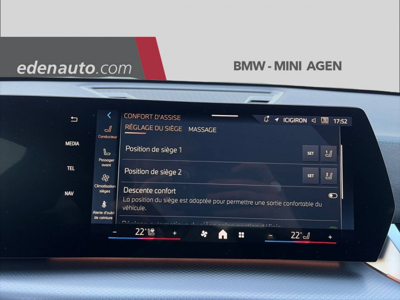 2 porte-gobelets sur la console centrale / 3ème feu stop LED intégré au hayon AR / 5 places / Accoudoir central AV avec panneau de commande intégré / Active Guard Avertissement de franchissement de ligne. Avertisseur de collision frontale. Avertisseur de présence d'un véhicule lors d'un changement de direction vers la gauche. Avertisseur d'intersection. Avertisseur présence piéton/cycliste lors d'un virage en intersection. Assistance de limitation de vitesse. Assistance d'évitement en cas de risque de collision frontale / Aides au stationnement Parking Assistant - Radars de stationnement AV et AR - Caméra de recul - Manoeuvres de stationnemment automatique en créneau et en bataille - Freinage automatique en marche AR - Assistant de marche AR/Auto-reverse / Airbag entre les deux sièges AV en cas de collision latérale / Airbag passager AV désactivable via la clé / Airbags de tête à l'AV et aux places latérales AR / Alarme antivol Surveillance des portes, coffre et capot moteur, protection de l'habitacle, détecteur de soulèvement et sirène. / Appel d'Urgence Intelligent (durée de vie de la voiture) Appel automatique vers le centre d'assistance BMW en cas d'accident. Touche SOS pour Appel d'Urgence manuel. Les données importantes sont automatiquement transmises aux secours : identification et localisation de la voiture, nombre de passagers à bord, statuts des airbags. Ce service utilise la carte SIM montée d'usine et ne requiert pas l'utilisation du smartphone. / Assistant dynamique de motricité (DTC) / BMW Digital (BMW Maps, RTTI sur itinéraire, Apple CarPlay, Android Auto, BMW Intelligent Personal Assistant) / BMW EfficientDynamics Système de récupération de l'énergie au freinage, Fonction d'arrêt et de redémarrage automatique du moteur, Direction à assistance électrique Servotronic (assistance variable selon la vitesse) / BMW Live Cockpit Navigation Plus avec Écran BMW Curved Display / BMW xDrive / Boîte de vitesses automatique 7 rapports avec palettes au volant / Boîte de vitesses automatique à double embrayage Sport DKG7 à 7 rapports avec palettes au volant / Buse de lave-glace pour caméra de recul / Capacité du reservoir augmentée Capacité augmentée de 9L / Capteur d'impact (Activation de l'airbag, des feux de détresse, de l'éclairage intérieur, Déverrouillage des portes, Activation de la borne batterie de sécurité) / Carte SIM 4G LTE pour les Services BMW ConnectedDrive / Ceintures de sécurité 3 points pour toutes les places / Ciel de pavillon M Anthracite / Clés radiocommandées à mémorisation automatique des réglages "Personal Profile" (x 2) / Clignotants LED intégrés aux feux de jour / Commande électrique du hayon / Compartiment à bagages : 2 crochets de sac, filet sur panneau gauche, prise 12V rangement additionel (volume spécifique au modèle) sous plancher amovible / Console centrale avec insert noir brillant / Contrôle de freinage en courbe CBC / Contrôle de stabilité dynamique (DSC) avec dotation élargie / Contrôle dynamique du freinage (DBC) / Désignation du modèle "X2" sur le hayon à gauche et version à droite / Détecteur de pluie et allumage automatique des projecteurs / Eclairage de bienvenue autour du véhicule / Eclairage de plaque d'immatriculation à LED / Ecran BMW Curved Display / Eléments extérieurs M Sport / Eléments intérieurs M Sport / Feux AR à LED intégrant les clignotants / Feux de sortie de porte AV (porte ouverte) / Fixations ISOFIX / i-Size pour les deux sièges AR extérieurs / Fonction cargo : Réglage de l'inclinaison de la banquette AR à 12 degrés (volume de chargement supplémentaire d' environ 85-100 litres) / Fonctionnalité "Follow Me Home" (éclairage d'accompagnement) : les feux de croisement restent allumés quelques instants une fois le contact coupé / Fonction Start&Stop automatique / Freinage de séchage / Frein de parking électromécanique avec fonction "Automatic Hold" / Grilles de calandre façon Mesh Effect avec contour cerclées de chrome / Hybridation légère (48V) / Inserts décoratifs Aluminium M Hexacube clair / Jantes en alliage léger 19" style 871 M 8 J x 19 / pneus 245/45 R 19 Gris foncé. Bicolore Montage chaînes à neige impossible. / Kit de mobilité Plus - Bouteille avec liquide anti-crevaison - Compresseur avec alimentation autonome via batterie rechargeable - Système se fixant au centre de la jante avec maintient de pression automatique du pneu crevé durant la conduite - Simple d'utilisation et réduction du temps passé sur le lieu de la panne / Kit éclairage : Lampes de courtoisie, Eclairage intérieur de l'accoudoir central AV, Eclairage habitacle AV et AR, éclairage plancher AV et AR, éclairage du miroir de courtoisie , lampes de lecture centrales, éclairage du coffre à bagages sur un côté / Kit rangement - bac de rangement dans les portes AV et AR avec porte-bouteille - compartiment de rangement central - compartiment de rangement avec couvercle rabattable sous l'accoudoir central AV - crochets de vêtements AR / Lève-vitres AV/AR électriques avec commande par impulsion et sécurité enfants / Mesure individuelle de pression des pneumatiques / My Modes: 5 modes de conduite (Personnel, Efficient, Sport, Relax, Expressive) / Norme General Safety Regulation 2 (GSR2) / Notice d'utilisation de la voiture intégrée et carnet d'entretien électronique avec BMW Service History / Ordinateur de bord avec Check-Control et indicateur de température extérieure / Performance control : contrôle du moteur et interventions freinage pour améliorer l'agilité et la neutralité en virage / Personal eSIM Personal eSIM est la version électronique, intégrée au véhicule, de la carte SIM traditionnelle. Vous l'utilisez via un abonnement souscrit auprès d'un opérateur téléphonique et transformez ainsi votre BMW en périphérique mobile supplémentaire : - Connectivité en 5G - Meilleure qualité de connexion grâce aux antennes de la voit