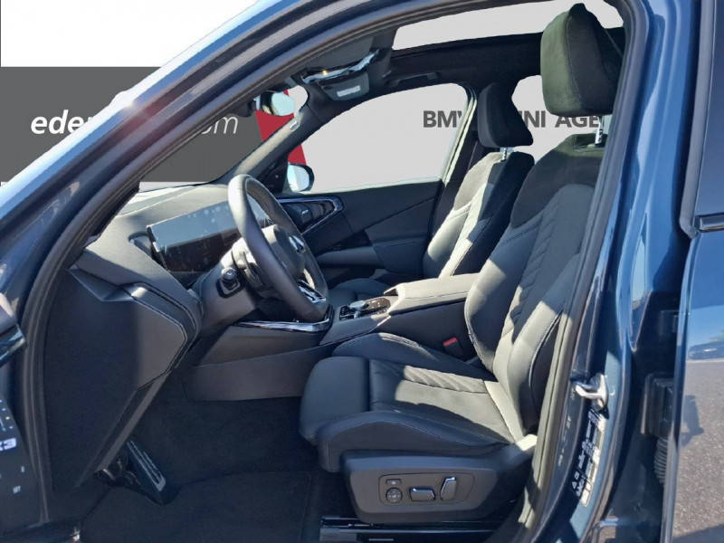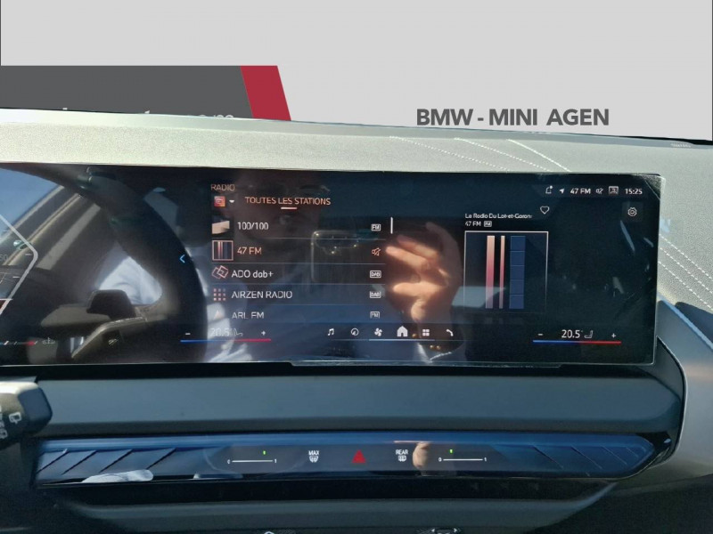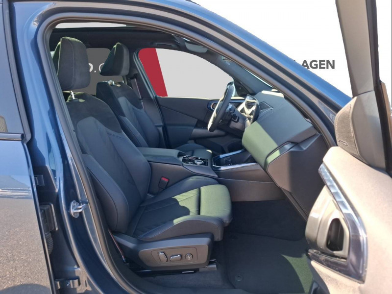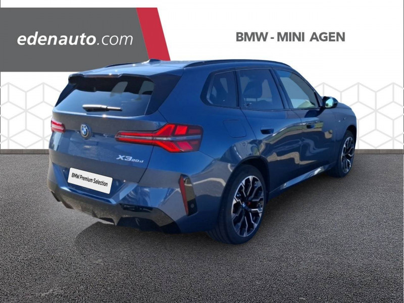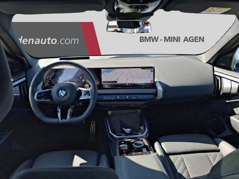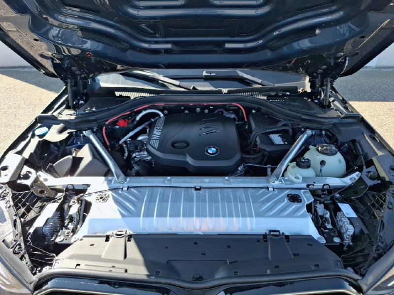 1 clé radiocommandée à mémorisation automatique des réglages "Personal Profile" 1 Setup Card & 1 Service Card / 2 porte-gobelets sur la console centrale / 3ème feu stop LED intégré au hayon AR / 5 places / Accès confort avec préparation "BMW Digital Key Plus" - Ouverture et fermeture (des 4 portes et de la malle) et démarrage sans clé - Eclairage d'accueil lorsque le conducteur se situe à 2,5 m du véhicule - Déverrouillage automatique à partir de 0,5 m du véhicule - Verrouillage automatique lorsque le conducteur s'éloigne du véhicule, à partir de 3 m / Accoudoir central AV avec panneau de commande intégré / Active Guard Avertissement de franchissement de ligne avec impulsion sur la direction (>70km/h), Avertisseur de collision frontale avec intervention de freinage (3-210km/h), Avertisseur d'intersection (détection risque collision latérale 3-85km/h), Avertisseur présence piéton/cycliste lors d'un virage en intersection (3-35km/h), Assistance de limitation de vitesse avec informations de limite de vitesse. / Aides à la conduite Driving Assistant Plus - Fonction à la demande / Aides à la conduite Driving Assistant Regroupe de nombreuses technologies pour une sécurité optimale : Avertisseur d'angle mort (>20km/h avec voyant d'alerte et intervention sur la direction), Avertisseur de risque de collision AR (déclenchement automatique des warning avec fréquence doublée), Avertisseur de sortie (détecte les objets approchant (véhicule, cycliste) et alerte en cas d'ouverture de la portière du conducteur ou des passagers si risque de collision avec l'objet détecté). Avertisseur de trafic transversal AR / Aides au stationnement Parking Assistant Radars de stationnement AV et AR, Caméra de recul, Manoeuvres de stationnemment en créneau et en bataille facilitées par mesure automatique, fonction de freinage automatique (PDC actif) en marche AR en cas d'obstacle lors d'une manoeuvre de stationnement effectuée manuellement par le conducteur (jusqu'à 5km/h), Assistant de marche AR/Auto-reverse. / Airbag central (siège conducteur) / Airbag entre les deux sièges AV en cas de collision latérale / Airbags de tête AV et aux places latérales AR / Alarme antivol Surveillance des portes, coffre et capot moteur, protection de l'habitacle, détecteur de soulèvement et sirène. / Appel d'Urgence Intelligent (durée de vie de la voiture) Appel automatique vers le centre d'assistance BMW en cas d'accident. Touche SOS pour Appel d'Urgence manuel. Les données importantes sont automatiquement transmises aux secours : identification et localisation de la voiture, nombre de passagers à bord, statuts des airbags. Ce service utilise la carte SIM montée d'usine et ne requiert pas l'utilisation du smartphone. / Assistance de direction assistée Servotronic / BMW Digital (BMW Maps, RTTI sur itinéraire, Apple CarPlay, Android Auto, BMW Intelligent Personal Assistant) / BMW EfficientDynamics Direction à assistance électrique Servotronic (assistance variable selon la vitesse), Fonction d'arrêt et de redémarrage automatique du moteur, Système de récupération de l'énergie au freinage. / BMW Live Cockpit Navigation Plus avec Écran BMW Curved Display Nouveau système d'exploitation BMW Operating System 9 avec widgets variables configurables qui affichent des informations en temps réel, Remote Software Upgrade : mise à jour du logiciel de la BMW à distance, Connectivité 4G LTE, Mise à jour pour les données de carte de navigation Over the Air (OtA), BMW Maps : nouveau système de navigation, simplification de la recherche, calcul plus rapide, navigation apprenante. / BMW xDrive Transmission intégrale permanente avec répartition variable du couple, Inclus fonctionnalité DSC étendue pour la répartition de la motricité. / Boîte de vitesses automatique à 8 rapports avec palettes au volant Boîte de vitesses automatique à 8 rapports avec sélecteur électronique et palettes au volant. / Calandre avec barreaux droits et obliques / Capteurs d'impact - Activation de l'airbag, des feux de détresse, de l'éclairage intérieur - Déverrouillage des portes - Activation de la borne batterie de sécurité / Ceintures de sécurité 3 points à toutes les places / Ciel de pavillon M Anthracite / Clignotants LED intégrés aux feux de jour / Climatisation automatique 3 zones Contrôle individuel de la température pour le conducteur et le passager AV, Programme automatique avec 5 niveaux d'intensité, Fonction SYNC : les réglages du conducteur s'appliquent à toute la zone passagers, Recirculation automatique de l'air (SSC), Refroidissement maximal (MAX AC), pour le conducteur et le passager AV, Microfiltre à charbon, Pré-refroidissement, Aérateurs à l'AR dans la console centrale AR, Chauffage auxilaire, / Compartiment à bagages : 2 crochets de sac, filet sur panneau gauche, prise 12V rangement additionel (volume spécifique au modèle) sous plancher amovible / Console centrale avec insert noir brillant / Contrôle de stabilité dynamique (DSC) avec dotation élargie Contrôle de freinage en courbe (CBC), Contrôle dynamique des freins (DBC), Stabilisation de remorque, Assistant dynamique de motricité (DTC), Freinage de séchage, Assistant de démarrage en côte, ABS - Système anti blocage des roues. / Désignation du modèle "X3" sur le hayon à gauche et version à droite / Détecteur de pluie et allumage automatique des projecteurs / Direction DirectDrive à démultiplication variable Sportivité accrue sans affecter le confort d'utilisation au quotidien : Virages directs et sportifs grâce à un angle de braquage réduit (cinématique et réglages de direction améliorés), Faible effort de braquage à basse vitesse, par exemple lors du stationnement ou dans les manoeuvres, Comportement de conduite intuitif et facile (retour d'information optimisé), Adaptation des réglages en fonction des modes de conduite. / Eclairage d'ambiance Rétroéclairage des éléments