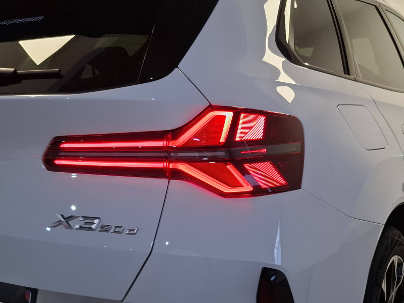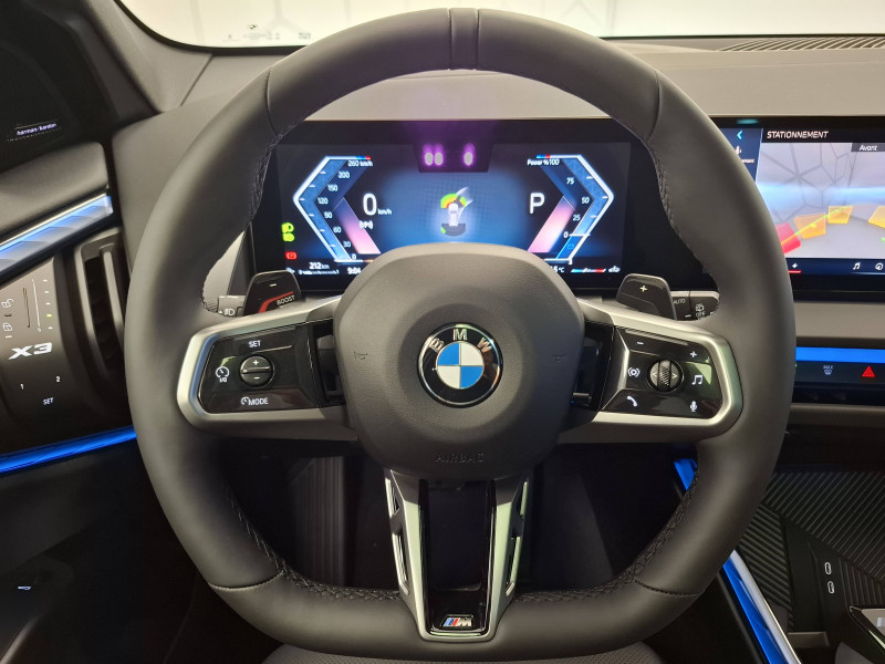 1 clé radiocommandée à mémorisation automatique des réglages "Personal Profile" 1 Setup Card & 1 Service Card / 2 porte-gobelets sur la console centrale / 3ème feu stop LED intégré au hayon AR / 5 places / Accès confort avec préparation "BMW Digital Key Plus" - Ouverture et fermeture (des 4 portes et de la malle) et démarrage sans clé - Eclairage d'accueil lorsque le conducteur se situe à 2,5 m du véhicule - Déverrouillage automatique à partir de 0,5 m du véhicule - Verrouillage automatique lorsque le conducteur s'éloigne du véhicule, à partir de 3 m / Accoudoir central AV avec panneau de commande intégré / Active Guard Avertissement de franchissement de ligne avec impulsion sur la direction (>70km/h), Avertisseur de collision frontale avec intervention de freinage (3-210km/h), Avertisseur d'intersection (détection risque collision latérale 3-85km/h), Avertisseur présence piéton/cycliste lors d'un virage en intersection (3-35km/h), Assistance de limitation de vitesse avec informations de limite de vitesse. / Airbag central (siège conducteur) / Airbag entre les deux sièges AV en cas de collision latérale / Airbags de tête AV et aux places latérales AR / Alarme antivol Surveillance des portes, coffre et capot moteur, protection de l'habitacle, détecteur de soulèvement et sirène. / Appel d'Urgence Intelligent (durée de vie de la voiture) Appel automatique vers le centre d'assistance BMW en cas d'accident. Touche SOS pour Appel d'Urgence manuel. Les données importantes sont automatiquement transmises aux secours : identification et localisation de la voiture, nombre de passagers à bord, statuts des airbags. Ce service utilise la carte SIM montée d'usine et ne requiert pas l'utilisation du smartphone. / Assistance de direction assistée Servotronic / BMW Digital (BMW Maps, RTTI sur itinéraire, Apple CarPlay, Android Auto, BMW Intelligent Personal Assistant) / BMW EfficientDynamics Direction à assistance électrique Servotronic (assistance variable selon la vitesse), Fonction d'arrêt et de redémarrage automatique du moteur, Système de récupération de l'énergie au freinage. / BMW Live Cockpit Navigation Plus avec Écran BMW Curved Display Nouveau système d'exploitation BMW Operating System 9 avec widgets variables configurables qui affichent des informations en temps réel, Remote Software Upgrade : mise à jour du logiciel de la BMW à distance, Connectivité 4G LTE, Mise à jour pour les données de carte de navigation Over the Air (OtA), BMW Maps : nouveau système de navigation, simplification de la recherche, calcul plus rapide, navigation apprenante. / BMW xDrive Transmission intégrale permanente avec répartition variable du couple, Inclus fonctionnalité DSC étendue pour la répartition de la motricité. / Boîte de vitesses automatique à 8 rapports avec palettes au volant Boîte de vitesses automatique à 8 rapports avec sélecteur électronique et palettes au volant. / Calandre avec barreaux droits et obliques / Capteurs d'impact - Activation de l'airbag, des feux de détresse, de l'éclairage intérieur - Déverrouillage des portes - Activation de la borne batterie de sécurité / Ceintures de sécurité 3 points à toutes les places / Ciel de pavillon M Anthracite / Clignotants LED intégrés aux feux de jour / Climatisation automatique 3 zones Contrôle individuel de la température pour le conducteur et le passager AV, Programme automatique avec 5 niveaux d'intensité, Fonction SYNC : les réglages du conducteur s'appliquent à toute la zone passagers, Recirculation automatique de l'air (SSC), Refroidissement maximal (MAX AC), pour le conducteur et le passager AV, Microfiltre à charbon, Pré-refroidissement, Aérateurs à l'AR dans la console centrale AR, Chauffage auxilaire, / Compartiment à bagages : 2 crochets de sac, filet sur panneau gauche, prise 12V rangement additionel (volume spécifique au modèle) sous plancher amovible / Console centrale avec insert noir brillant / Contrôle de stabilité dynamique (DSC) avec dotation élargie Contrôle de freinage en courbe (CBC), Contrôle dynamique des freins (DBC), Stabilisation de remorque, Assistant dynamique de motricité (DTC), Freinage de séchage, Assistant de démarrage en côte, ABS - Système anti blocage des roues. / Désignation du modèle "X3" sur le hayon à gauche et version à droite / Détecteur de pluie et allumage automatique des projecteurs / Direction DirectDrive à démultiplication variable Sportivité accrue sans affecter le confort d'utilisation au quotidien : Virages directs et sportifs grâce à un angle de braquage réduit (cinématique et réglages de direction améliorés), Faible effort de braquage à basse vitesse, par exemple lors du stationnement ou dans les manoeuvres, Comportement de conduite intuitif et facile (retour d'information optimisé), Adaptation des réglages en fonction des modes de conduite. / Driving Assistant Plus - Fonction à la demande / Driving Assistant Regroupe de nombreuses technologies pour une sécurité optimale : Avertisseur d'angle mort (>20km/h avec voyant d'alerte et intervention sur la direction), Avertisseur de risque de collision AR (déclenchement automatique des warning avec fréquence doublée), Avertisseur de sortie (détecte les objets approchant (véhicule, cycliste) et alerte en cas d'ouverture de la portière du conducteur ou des passagers si risque de collision avec l'objet détecté). Avertisseur de trafic transversal AR / Eclairage d'ambiance Rétroéclairage des éléments suivants (15 couleurs au choix): Poignées de portes AV, Partie inférieure du BMW Curved Display, Emplacement recharge sans fil smartphone, Contour du porte-gobelet, BMW Interaction Bar à l'aspect de verre cristallin, rétroéclairée dynamiquement. / Eclairage de bienvenue autour du véhicule / Eclairage de plaque d'immatriculation à LED / Ecran BMW Curved Display / Eléments extérieurs M Sport / Eléments intérieurs M Sport / El