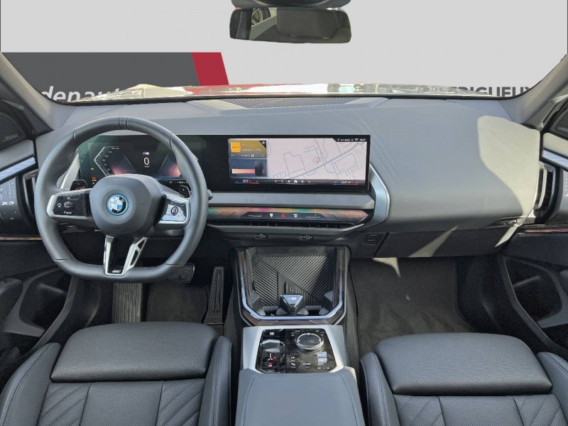 2 porte-gobelets sur la console centrale / 3ème feu stop LED intégré au hayon AR / 5 places / Accès confort avec préparation "BMW Digital Key Plus" - Ouverture et fermeture (des 4 portes et de la malle) et démarrage sans clé - Eclairage d'accueil lorsque le conducteur se situe à 2,5 m du véhicule - Déverrouillage automatique à partir de 0,5 m du véhicule - Verrouillage automatique lorsque le conducteur s'éloigne du véhicule, à partir de 3 m / Accoudoir central AV avec panneau de commande intégré / Active Guard Avertissement de franchissement de ligne avec impulsion sur la direction (>70km/h), Avertisseur de collision frontale avec intervention de freinage (3-210km/h), Avertisseur d'intersection (détection risque collision latérale 3-85km/h), Avertisseur présence piéton/cycliste lors d'un virage en intersection (3-35km/h), Assistance de limitation de vitesse avec informations de limite de vitesse. / Airbag central (siège conducteur) / Airbag entre les deux sièges AV en cas de collision latérale / Airbags de tête AV et aux places latérales AR / Alarme antivol Surveillance des portes, coffre et capot moteur, protection de l'habitacle, détecteur de soulèvement et sirène. / Appel d'Urgence Intelligent (durée de vie de la voiture) Appel automatique vers le centre d'assistance BMW en cas d'accident. Touche SOS pour Appel d'Urgence manuel. Les données importantes sont automatiquement transmises aux secours : identification et localisation de la voiture, nombre de passagers à bord, statuts des airbags. Ce service utilise la carte SIM montée d'usine et ne requiert pas l'utilisation du smartphone. / BMW Digital (BMW Maps, RTTI sur itinéraire, Apple CarPlay, Android Auto, BMW Intelligent Personal Assistant) / BMW EfficientDynamics Direction à assistance électrique Servotronic (assistance variable selon la vitesse), Fonction d'arrêt et de redémarrage automatique du moteur, Système de récupération de l'énergie au freinage. / BMW IconicSounds Electric Mise en scène du son de conduite électrique à l'intérieur et à l'extérieur du véhicule. Sélection du niveau via les modes du commutateur d'expérience de conduite personnalisée: Personal : confort acoustique modéré avec faible réponse de charge, Sport : nette réponse de charge, Efficient : confort acoustique élevé sans mise en scène supplémentaire, Expressive : acoustique de conduite d'avant-garde - une réinterprétation artistique du mouvement, Relax : paysage sonore vibrant et relaxant. / BMW Live Cockpit Navigation Plus avec Écran BMW Curved Display Nouveau système d'exploitation BMW Operating System 9 avec widgets variables configurables qui affichent des informations en temps réel, Remote Software Upgrade : mise à jour du logiciel de la BMW à distance, Connectivité 4G LTE, Mise à jour pour les données de carte de navigation Over the Air (OtA), BMW Maps : nouveau système de navigation, simplification de la recherche, calcul plus rapide, navigation apprenante. / BMW xDrive Transmission intégrale permanente avec répartition variable du couple, Inclus fonctionnalité DSC étendue pour la répartition de la motricité. / Boîte de vitesses automatique à 8 rapports avec palettes au volant Boîte de vitesses automatique à 8 rapports avec sélecteur électronique et palettes au volant. / Câble de recharge Professionnel Mode 3 (T2-T2) pour la recharge publique - 5 mètres Câble de recharge Professionnel de Mode 3 triphasé avec prises Type 2 - Type 2 destinéà la recharge sur bornes publiques ou privées. Peut être utilisé sur une borne de recharge raccordée en courant monophasé ou triphasé avec des puissances de charge maximales : 7,4 kW / 32 A (en monophasé) et de 22 kW / 32 A (en triphasé). Rangement dans le coffret à câbles sous le cache du compartiment à bagages. Couleur Gris basalte. / Calandre avec barreaux droits et obliques / Capteurs d'impact - Activation de l'airbag, des feux de détresse, de l'éclairage intérieur - Déverrouillage des portes - Activation de la borne batterie de sécurité / Ceintures de sécurité 3 points à toutes les places / Chargeur courant alternatif AC 11 kW / Ciel de pavillon M Anthracite / Clignotants LED intégrés aux feux de jour / Climatisation automatique 3 zones Contrôle individuel de la température pour le conducteur et le passager AV, Programme automatique avec 5 niveaux d'intensité, Fonction SYNC : les réglages du conducteur s'appliquent à toute la zone passagers, Recirculation automatique de l'air (SSC), Refroidissement maximal (MAX AC), pour le conducteur et le passager AV, Microfiltre à charbon, Pré-refroidissement, Aérateurs à l'AR dans la console centrale AR. / Compartiment à bagages : 2 crochets de sac, filet sur panneau gauche, prise 12V rangement additionel (volume spécifique au modèle) sous plancher amovible / Console centrale avec insert noir brillant / Contrôle de stabilité dynamique (DSC) avec dotation élargie Contrôle de freinage en courbe (CBC), Contrôle dynamique des freins (DBC), Stabilisation de remorque, Assistant dynamique de motricité (DTC), Freinage de séchage, Assistant de démarrage en côte, ABS - Système anti blocage des roues. / Désignation du modèle "X3" sur le hayon à gauche et version à droite / Détecteur de pluie et allumage automatique des projecteurs / Direction DirectDrive à démultiplication variable Sportivité accrue sans affecter le confort d'utilisation au quotidien : Virages directs et sportifs grâce à un angle de braquage réduit (cinématique et réglages de direction améliorés), Faible effort de braquage à basse vitesse, par exemple lors du stationnement ou dans les manoeuvres, Comportement de conduite intuitif et facile (retour d'information optimisé), Adaptation des réglages en fonction des modes de conduite. / Driving Assistant Plus - Fonction à la demande / Driving Assistant Regroupe de nombreuses technologies pour une sécurité optimale : Avertis