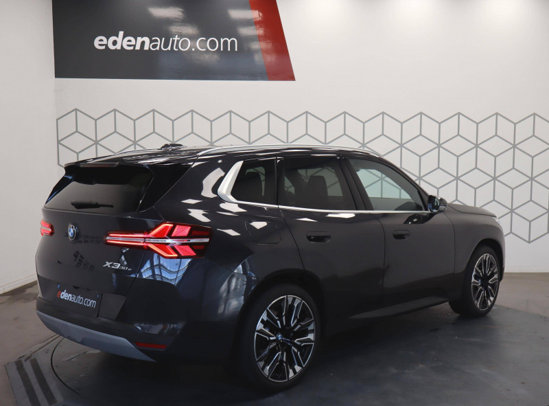 2 porte-gobelets sur la console centrale / 3ème feu stop LED intégré au hayon AR / 5 places / Accès confort avec préparation "BMW Digital Key Plus" - Ouverture et fermeture (des 4 portes et de la malle) et démarrage sans clé - Eclairage d'accueil lorsque le conducteur se situe à 2,5 m du véhicule - Déverrouillage automatique à partir de 0,5 m du véhicule - Verrouillage automatique lorsque le conducteur s'éloigne du véhicule, à partir de 3 m / Accoudoir central AV avec panneau de commande intégré / Active Guard Avertissement de franchissement de ligne avec impulsion sur la direction (>70km/h), Avertisseur de collision frontale avec intervention de freinage (3-210km/h), Avertisseur d'intersection (détection risque collision latérale 3-85km/h), Avertisseur présence piéton/cycliste lors d'un virage en intersection (3-35km/h), Assistance de limitation de vitesse avec informations de limite de vitesse. / Aides à la conduite Driving Assistant Plus - Fonction à la demande / Aides à la conduite Driving Assistant Regroupe de nombreuses technologies pour une sécurité optimale : Avertisseur d'angle mort (>20km/h avec voyant d'alerte et intervention sur la direction), Avertisseur de risque de collision AR (déclenchement automatique des warning avec fréquence doublée), Avertisseur de sortie (détecte les objets approchant (véhicule, cycliste) et alerte en cas d'ouverture de la portière du conducteur ou des passagers si risque de collision avec l'objet détecté). Avertisseur de trafic transversal AR / Aides au stationnement Parking Assistant Radars de stationnement AV et AR, Caméra de recul, Manoeuvres de stationnemment en créneau et en bataille facilitées par mesure automatique, fonction de freinage automatique (PDC actif) en marche AR en cas d'obstacle lors d'une manoeuvre de stationnement effectuée manuellement par le conducteur (jusqu'à 5km/h), Assistant de marche arrière/Auto-reverse. / Airbag central (siège conducteur) / Airbag entre les deux sièges AV en cas de collision latérale / Airbags de tête AV et aux places latérales AR / Alarme antivol Surveillance des portes, coffre et capot moteur, protection de l'habitacle, détecteur de soulèvement et sirène. / Aluminium Line / Appel d'Urgence Intelligent (durée de vie de la voiture) Appel automatique vers le centre d'assistance BMW en cas d'accident. Touche SOS pour Appel d'Urgence manuel. Les données importantes sont automatiquement transmises aux secours : identification et localisation de la voiture, nombre de passagers à bord, statuts des airbags. Ce service utilise la carte SIM montée d'usine et ne requiert pas l'utilisation du smartphone. / BMW Digital (BMW Maps, RTTI sur itinéraire, Apple CarPlay, Android Auto, BMW Intelligent Personal Assistant) / BMW EfficientDynamics Direction à assistance électrique Servotronic (assistance variable selon la vitesse), Fonction d'arrêt et de redémarrage automatique du moteur, Système de récupération de l'énergie au freinage. / BMW IconicSounds Electric Mise en scène du son de conduite électrique à l'intérieur et à l'extérieur du véhicule. Sélection du niveau via les modes du commutateur d'expérience de conduite personnalisée: Personal : confort acoustique modéré avec faible réponse de charge, Sport : nette réponse de charge, Efficient : confort acoustique élevé sans mise en scène supplémentaire, Expressive : acoustique de conduite d'avant-garde - une réinterprétation artistique du mouvement, Relax : paysage sonore vibrant et relaxant. / BMW Live Cockpit Navigation Plus avec Écran BMW Curved Display Nouveau système d'exploitation BMW Operating System 9 avec widgets variables configurables qui affichent des informations en temps réel, Remote Software Upgrade : mise à jour du logiciel de la BMW à distance, Connectivité 4G LTE, Mise à jour pour les données de carte de navigation Over the Air (OtA), BMW Maps : nouveau système de navigation, simplification de la recherche, calcul plus rapide, navigation apprenante. / BMW xDrive Transmission intégrale permanente avec répartition variable du couple, Inclus fonctionnalité DSC étendue pour la répartition de la motricité. / Boîte de vitesses automatique à 8 rapports avec palettes au volant Boîte de vitesses automatique à 8 rapports avec sélecteur électronique et palettes au volant. / Câble de recharge Professionnel Mode 3 (T2-T2) pour la recharge publique - 5 mètres Câble de recharge Professionnel de Mode 3 triphasé avec prises Type 2 - Type 2 destinéà la recharge sur bornes publiques ou privées. Peut être utilisé sur une borne de recharge raccordée en courant monophasé ou triphasé avec des puissances de charge maximales : 7,4 kW / 32 A (en monophasé) et de 22 kW / 32 A (en triphasé). Rangement dans le coffret à câbles sous le cache du compartiment à bagages. Couleur Gris basalte. / Calandre avec barreaux droits et obliques / Capteurs d'impact - Activation de l'airbag, des feux de détresse, de l'éclairage intérieur - Déverrouillage des portes - Activation de la borne batterie de sécurité / Ceintures de sécurité 3 points à toutes les places / Chargeur courant alternatif AC 11 kW / Clignotants LED intégrés aux feux de jour / Climatisation automatique 3 zones Contrôle individuel de la température pour le conducteur et le passager AV, Programme automatique avec 5 niveaux d'intensité, Fonction SYNC : les réglages du conducteur s'appliquent à toute la zone passagers, Recirculation automatique de l'air (SSC), Refroidissement maximal (MAX AC), pour le conducteur et le passager AV, Microfiltre à charbon, Pré-refroidissement, Aérateurs à l'AR dans la console centrale AR. / Compartiment à bagages : 2 crochets de sac, filet sur panneau gauche, prise 12V rangement additionel (volume spécifique au modèle) sous plancher amovible / Console centrale avec insert noir brillant / Contrôle de stabilité dynamique (DSC) avec dotation élargie Contrôle
