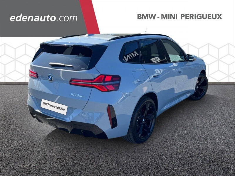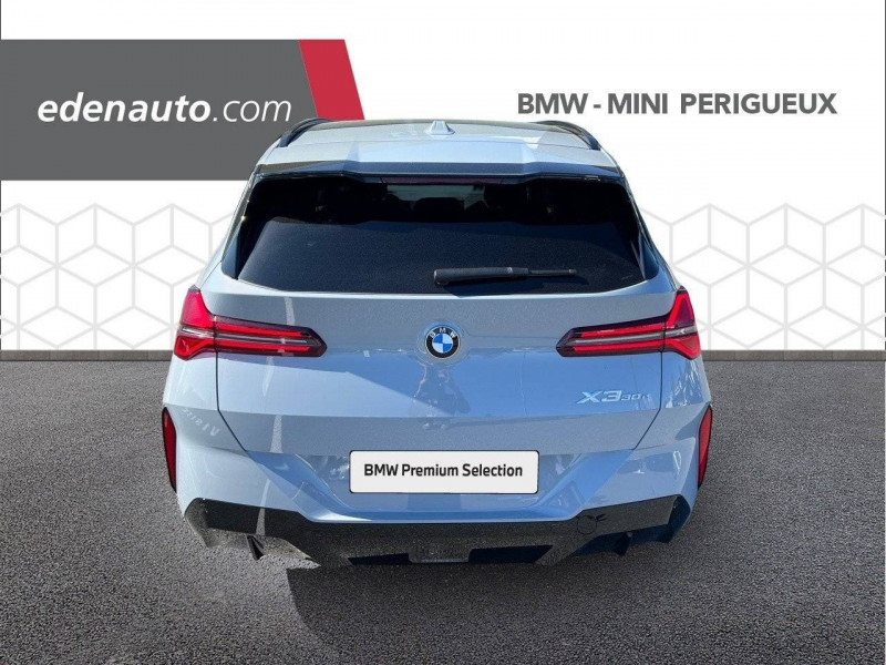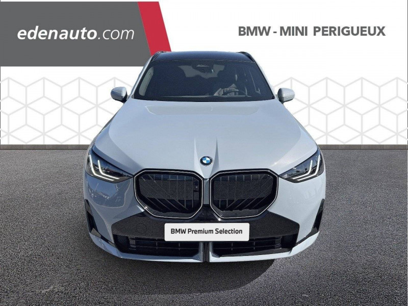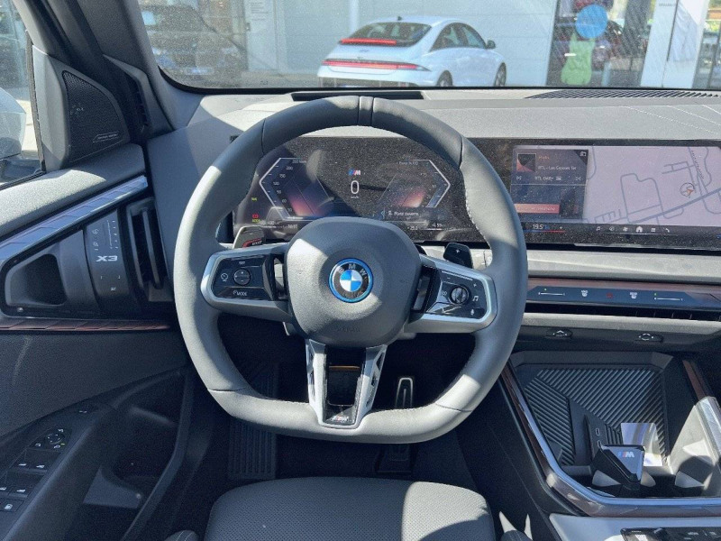 2 porte-gobelets sur la console centrale / 3ème feu stop LED intégré au hayon AR / 5 places / Accès confort avec préparation "BMW Digital Key Plus" - Ouverture et fermeture (des 4 portes et de la malle) et démarrage sans clé - Eclairage d'accueil lorsque le conducteur se situe à 2,5 m du véhicule - Déverrouillage automatique à partir de 0,5 m du véhicule - Verrouillage automatique lorsque le conducteur s'éloigne du véhicule, à partir de 3 m / Accoudoir central AV avec panneau de commande intégré / Active Guard Avertissement de franchissement de ligne avec impulsion sur la direction (>70km/h), Avertisseur de collision frontale avec intervention de freinage (3-210km/h), Avertisseur d'intersection (détection risque collision latérale 3-85km/h), Avertisseur présence piéton/cycliste lors d'un virage en intersection (3-35km/h), Assistance de limitation de vitesse avec informations de limite de vitesse. / Airbag central (siège conducteur) / Airbag entre les deux sièges AV en cas de collision latérale / Airbags de tête AV et aux places latérales AR / Alarme antivol Surveillance des portes, coffre et capot moteur, protection de l'habitacle, détecteur de soulèvement et sirène. / Appel d'Urgence Intelligent (durée de vie de la voiture) Appel automatique vers le centre d'assistance BMW en cas d'accident. Touche SOS pour Appel d'Urgence manuel. Les données importantes sont automatiquement transmises aux secours : identification et localisation de la voiture, nombre de passagers à bord, statuts des airbags. Ce service utilise la carte SIM montée d'usine et ne requiert pas l'utilisation du smartphone. / BMW Digital (BMW Maps, RTTI sur itinéraire, Apple CarPlay, Android Auto, BMW Intelligent Personal Assistant) / BMW EfficientDynamics Direction à assistance électrique Servotronic (assistance variable selon la vitesse), Fonction d'arrêt et de redémarrage automatique du moteur, Système de récupération de l'énergie au freinage. / BMW IconicSounds Electric Mise en scène du son de conduite électrique à l'intérieur et à l'extérieur du véhicule. Sélection du niveau via les modes du commutateur d'expérience de conduite personnalisée: Personal : confort acoustique modéré avec faible réponse de charge, Sport : nette réponse de charge, Efficient : confort acoustique élevé sans mise en scène supplémentaire, Expressive : acoustique de conduite d'avant-garde - une réinterprétation artistique du mouvement, Relax : paysage sonore vibrant et relaxant. / BMW Live Cockpit Navigation Plus avec Écran BMW Curved Display Nouveau système d'exploitation BMW Operating System 9 avec widgets variables configurables qui affichent des informations en temps réel, Remote Software Upgrade : mise à jour du logiciel de la BMW à distance, Connectivité 4G LTE, Mise à jour pour les données de carte de navigation Over the Air (OtA), BMW Maps : nouveau système de navigation, simplification de la recherche, calcul plus rapide, navigation apprenante. / BMW xDrive Transmission intégrale permanente avec répartition variable du couple, Inclus fonctionnalité DSC étendue pour la répartition de la motricité. / Boîte de vitesses automatique à 8 rapports avec palettes au volant Boîte de vitesses automatique à 8 rapports avec sélecteur électronique et palettes au volant. / Câble de recharge Professionnel Mode 3 (T2-T2) pour la recharge publique - 5 mètres Câble de recharge Professionnel de Mode 3 triphasé avec prises Type 2 - Type 2 destinéà la recharge sur bornes publiques ou privées. Peut être utilisé sur une borne de recharge raccordée en courant monophasé ou triphasé avec des puissances de charge maximales : 7,4 kW / 32 A (en monophasé) et de 22 kW / 32 A (en triphasé). Rangement dans le coffret à câbles sous le cache du compartiment à bagages. Couleur Gris basalte. / Calandre avec barreaux droits et obliques / Capteurs d'impact - Activation de l'airbag, des feux de détresse, de l'éclairage intérieur - Déverrouillage des portes - Activation de la borne batterie de sécurité / Ceintures de sécurité 3 points à toutes les places / Chargeur courant alternatif AC 11 kW / Ciel de pavillon M Anthracite / Clignotants LED intégrés aux feux de jour / Climatisation automatique 3 zones Contrôle individuel de la température pour le conducteur et le passager AV, Programme automatique avec 5 niveaux d'intensité, Fonction SYNC : les réglages du conducteur s'appliquent à toute la zone passagers, Recirculation automatique de l'air (SSC), Refroidissement maximal (MAX AC), pour le conducteur et le passager AV, Microfiltre à charbon, Pré-refroidissement, Aérateurs à l'AR dans la console centrale AR. / Compartiment à bagages : 2 crochets de sac, filet sur panneau gauche, prise 12V rangement additionel (volume spécifique au modèle) sous plancher amovible / Console centrale avec insert noir brillant / Contrôle de stabilité dynamique (DSC) avec dotation élargie Contrôle de freinage en courbe (CBC), Contrôle dynamique des freins (DBC), Stabilisation de remorque, Assistant dynamique de motricité (DTC), Freinage de séchage, Assistant de démarrage en côte, ABS - Système anti blocage des roues. / Désignation du modèle "X3" sur le hayon à gauche et version à droite / Détecteur de pluie et allumage automatique des projecteurs / Direction DirectDrive à démultiplication variable Sportivité accrue sans affecter le confort d'utilisation au quotidien : Virages directs et sportifs grâce à un angle de braquage réduit (cinématique et réglages de direction améliorés), Faible effort de braquage à basse vitesse, par exemple lors du stationnement ou dans les manoeuvres, Comportement de conduite intuitif et facile (retour d'information optimisé), Adaptation des réglages en fonction des modes de conduite. / Driving Assistant Plus - Fonction à la demande / Driving Assistant Regroupe de nombreuses technologies pour une sécurité optimale : Avertis
