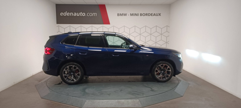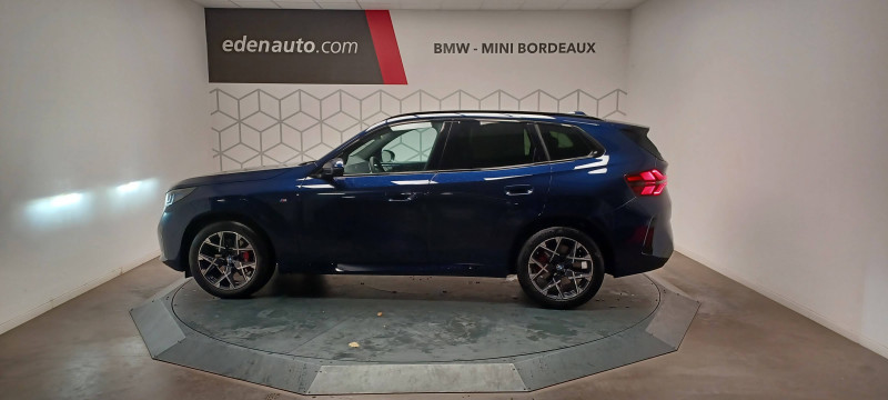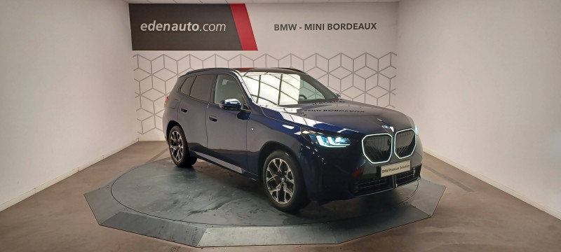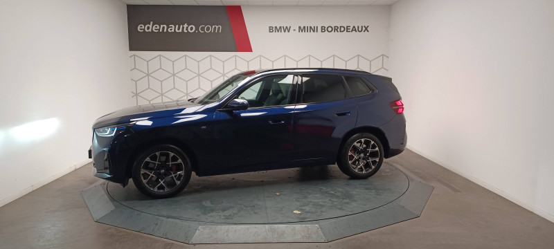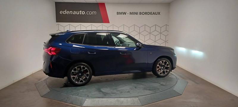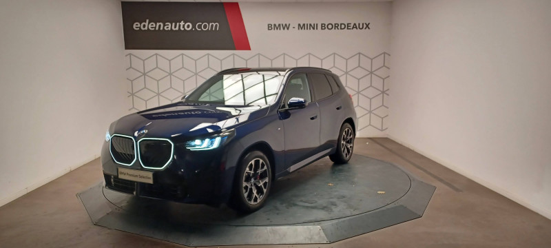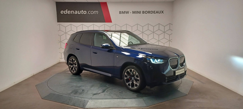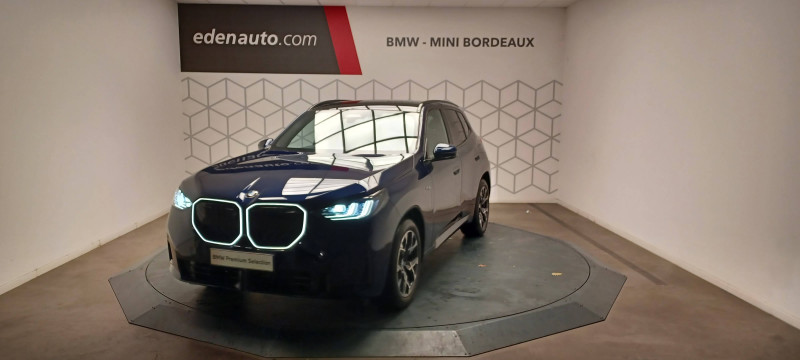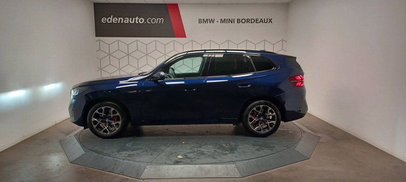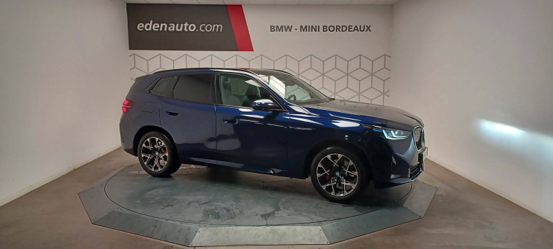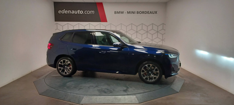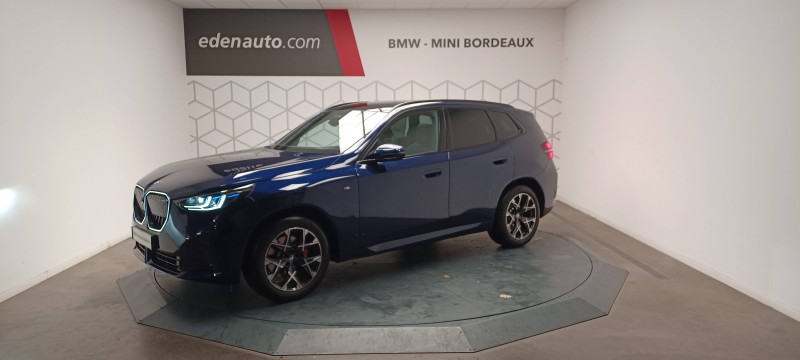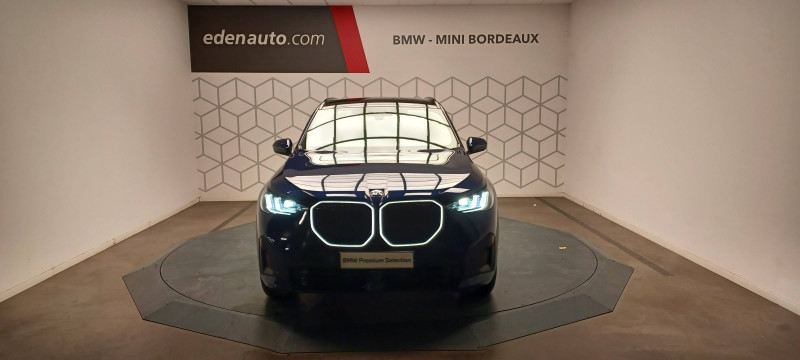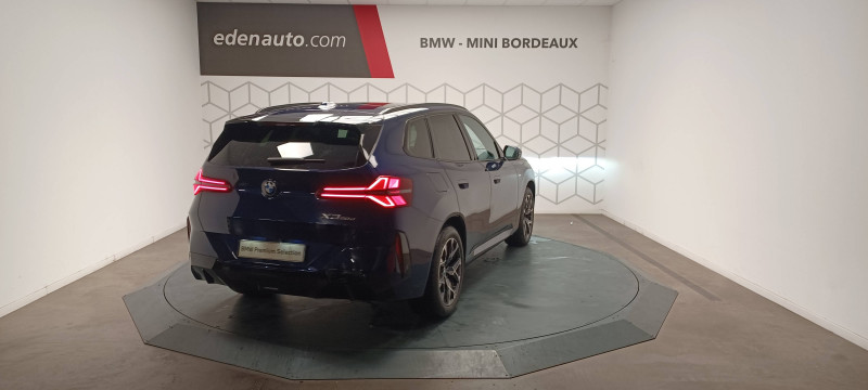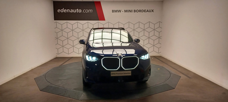 1 clé radiocommandée à mémorisation automatique des réglages "Personal Profile" 1 Setup Card & 1 Service Card / 2 porte-gobelets sur la console centrale / 3ème feu stop LED intégré au hayon AR / 5 places / Accès confort avec préparation "BMW Digital Key Plus" - Ouverture et fermeture (des 4 portes et de la malle) et démarrage sans clé - Eclairage d'accueil lorsque le conducteur se situe à 2,5 m du véhicule - Déverrouillage automatique à partir de 0,5 m du véhicule - Verrouillage automatique lorsque le conducteur s'éloigne du véhicule, à partir de 3 m / Accoudoir central AV avec panneau de commande intégré / Active Guard Avertissement de franchissement de ligne avec impulsion sur la direction (>70km/h), Avertisseur de collision frontale avec intervention de freinage (3-210km/h), Avertisseur d'intersection (détection risque collision latérale 3-85km/h), Avertisseur présence piéton/cycliste lors d'un virage en intersection (3-35km/h), Assistance de limitation de vitesse avec informations de limite de vitesse. / Aides à la conduite Driving Assistant Plus - Fonction à la demande / Aides à la conduite Driving Assistant Regroupe de nombreuses technologies pour une sécurité optimale : Avertisseur d'angle mort (>20km/h avec voyant d'alerte et intervention sur la direction), Avertisseur de risque de collision AR (déclenchement automatique des warning avec fréquence doublée), Avertisseur de sortie (détecte les objets approchant (véhicule, cycliste) et alerte en cas d'ouverture de la portière du conducteur ou des passagers si risque de collision avec l'objet détecté). Avertisseur de trafic transversal AR / Aides au stationnement Parking Assistant Radars de stationnement AV et AR, Caméra de recul, Manoeuvres de stationnemment en créneau et en bataille facilitées par mesure automatique, fonction de freinage automatique (PDC actif) en marche AR en cas d'obstacle lors d'une manoeuvre de stationnement effectuée manuellement par le conducteur (jusqu'à 5km/h), Assistant de marche arrière/Auto-reverse. / Airbag central (siège conducteur) / Airbag entre les deux sièges AV en cas de collision latérale / Airbags de tête AV et aux places latérales AR / Alarme antivol Surveillance des portes, coffre et capot moteur, protection de l'habitacle, détecteur de soulèvement et sirène. / Appel d'Urgence Intelligent (durée de vie de la voiture) Appel automatique vers le centre d'assistance BMW en cas d'accident. Touche SOS pour Appel d'Urgence manuel. Les données importantes sont automatiquement transmises aux secours : identification et localisation de la voiture, nombre de passagers à bord, statuts des airbags. Ce service utilise la carte SIM montée d'usine et ne requiert pas l'utilisation du smartphone. / Assistance de direction assistée Servotronic / BMW Digital (BMW Maps, RTTI sur itinéraire, Apple CarPlay, Android Auto, BMW Intelligent Personal Assistant) / BMW EfficientDynamics Direction à assistance électrique Servotronic (assistance variable selon la vitesse), Fonction d'arrêt et de redémarrage automatique du moteur, Système de récupération de l'énergie au freinage. / BMW Live Cockpit Navigation Plus avec Écran BMW Curved Display Nouveau système d'exploitation BMW Operating System 9 avec widgets variables configurables qui affichent des informations en temps réel, Remote Software Upgrade : mise à jour du logiciel de la BMW à distance, Connectivité 4G LTE, Mise à jour pour les données de carte de navigation Over the Air (OtA), BMW Maps : nouveau système de navigation, simplification de la recherche, calcul plus rapide, navigation apprenante. / BMW xDrive Transmission intégrale permanente avec répartition variable du couple, Inclus fonctionnalité DSC étendue pour la répartition de la motricité. / Boîte de vitesses automatique à 8 rapports avec palettes au volant Boîte de vitesses automatique à 8 rapports avec sélecteur électronique et palettes au volant. / Calandre avec barreaux droits et obliques / Capteurs d'impact - Activation de l'airbag, des feux de détresse, de l'éclairage intérieur - Déverrouillage des portes - Activation de la borne batterie de sécurité / Ceintures de sécurité 3 points à toutes les places / Ciel de pavillon M Anthracite / Clignotants LED intégrés aux feux de jour / Climatisation automatique 3 zones Contrôle individuel de la température pour le conducteur et le passager AV, Programme automatique avec 5 niveaux d'intensité, Fonction SYNC : les réglages du conducteur s'appliquent à toute la zone passagers, Recirculation automatique de l'air (SSC), Refroidissement maximal (MAX AC), pour le conducteur et le passager AV, Microfiltre à charbon, Pré-refroidissement, Aérateurs à l'AR dans la console centrale AR, Chauffage auxilaire, / Compartiment à bagages : 2 crochets de sac, filet sur panneau gauche, prise 12V rangement additionel (volume spécifique au modèle) sous plancher amovible / Console centrale avec insert noir brillant / Contrôle de stabilité dynamique (DSC) avec dotation élargie Contrôle de freinage en courbe (CBC), Contrôle dynamique des freins (DBC), Stabilisation de remorque, Assistant dynamique de motricité (DTC), Freinage de séchage, Assistant de démarrage en côte, ABS - Système anti blocage des roues. / Désignation du modèle "X3" sur le hayon à gauche et version à droite / Détecteur de pluie et allumage automatique des projecteurs / Direction DirectDrive à démultiplication variable Sportivité accrue sans affecter le confort d'utilisation au quotidien : Virages directs et sportifs grâce à un angle de braquage réduit (cinématique et réglages de direction améliorés), Faible effort de braquage à basse vitesse, par exemple lors du stationnement ou dans les manoeuvres, Comportement de conduite intuitif et facile (retour d'information optimisé), Adaptation des réglages en fonction des modes de conduite. / Eclairage d'ambiance Rétroéclairage des él