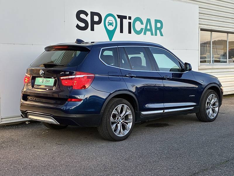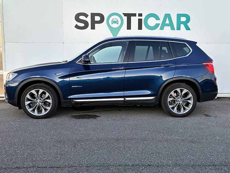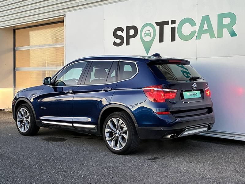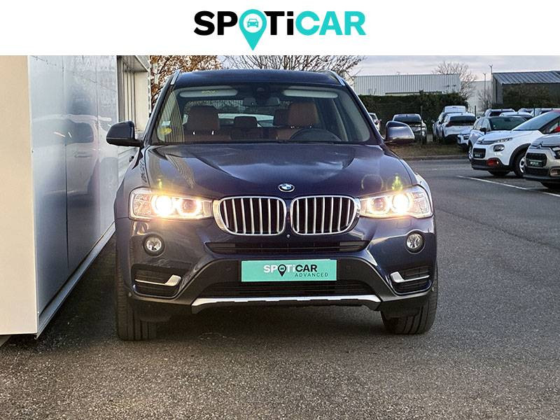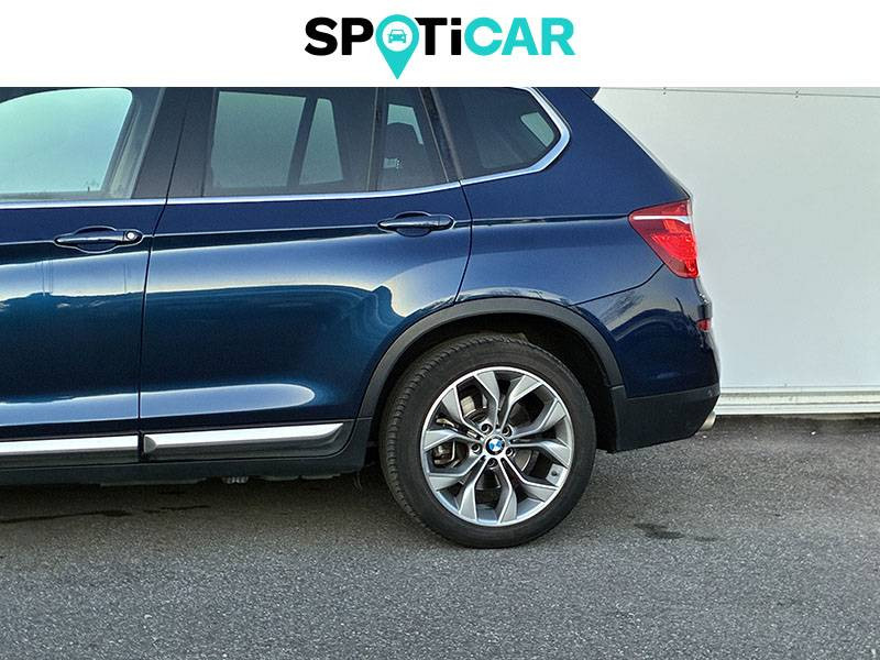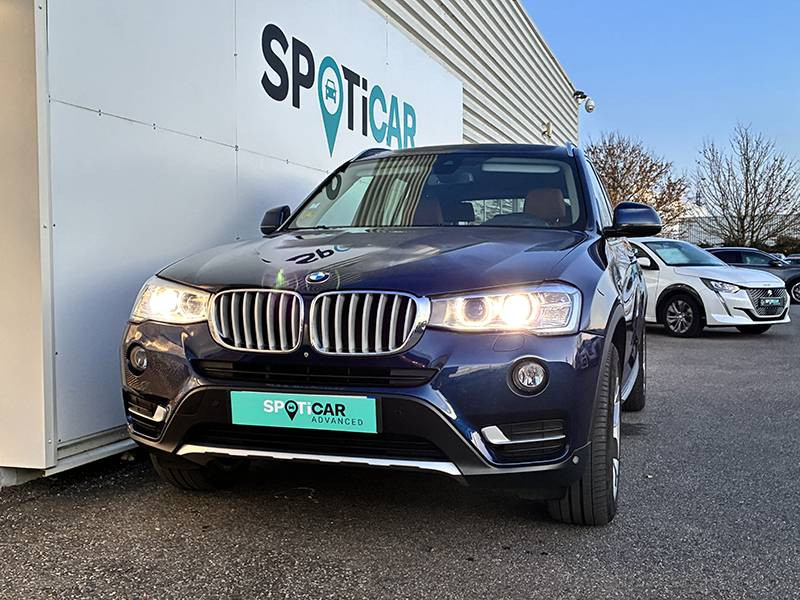 3ème feu de stop dans le becquet de hayon / 5 places / ABS, y compris assistant de freinage et Contrôle de freinage en courbe CBC / Accoudoir central AR avec 2 porte-boissons intégrés / Affichage BMW EfficientDynamics dans le cadran d'instrumentation BMW Efficient Dynamics / Affichage "xDrive" avec affichage de l'inclinaison longitudinale/transversale et de l'angle de braquage / Airbags conducteur et passager AV + latéraux + airbag de tête AV/AR / Application brillante "schwarz" au niveau de la console centrale et autour des commandes audio climatisation / Appuis-tête à toutes les places (actifs et réglables manuellement en hauteur et profondeur à l'AV) / Autoradio BMW Professional 4x25 W, 6 haut-parleurs et lecteur CD compatible MP3 / BMW Apps . / Boîte de vitesses automatique à 8 rapports / Bouquet Services BMW ConnectedDrive / Bouton Start/Stop avec démarrage sans actionner la clé / Buses de lave-glace chauffantes (non visibles) / Cache-bagages à enrouleur / Capteur d'impact (déverouillage du véhicule, allumage de l'éclairage de l'habitacle et activation des feux de détresse en cas d'impact) / Catadioptres rétro-réfléchissants intégrés à l'AR (gauche et droite) / Ceintures de sécuritéà 3 points d'ancrage à toutes les places / Ceintures de sécurité AV avec prétensionneur pyrotechnique et limiteur de tension à l'AV / Coffre: Plancher réversible, filet de rangement à gauche, sangle de fixation à droite, fourre-tout latéral à droite, boîte pliante en tissu sous le plancher, filet multifonctionnel enclipsable, glissières d'arrimage avec 4 anneaux réglables / Commande de verrouillage des portes dans les portes (conducteur + passager) / Commande électrique du hayon avec ouverture/fermeture possible via un bouton dans le poste de conduite / Compartiments de rangement dans les portes AV/AR avec porte-bouteilles (1,5L à l'AV et 1,0L à l'AR) / Conciergerie (3 ans) / Console centrale type F15 (commandes des systèmes de climatisation + audio) avec application brillante "schwarz" entourant l'ensemble / Construction allégée intelligente BMW Efficient Dynamics / Contrôle d'adhérence en descente (HDC) / Contrôle Dynamique de Stabilité DSC+ avec fonctionnalités étendues (y compris assistant de démarrage en côte) / Controller iDrive avec touches d'accès direct et 8 touches de raccourci programmables / Désactivation de l'airbag passager avec témoin lumineux dans la console de toit / Détecteur de pluie et allumage automatique des projecteurs / Direction à assistance électrique (ESP) BMW Efficient Dynamics / Direction assistée avec Servotronic / Direction Servotronic à assistance variable en fonction de la vitesse / Eclairage de bienvenue soft-on/soft-off (ciel de pavillon à l'AV et à l'AR) / Eclairage du coffre (à gauche et à droite) / Ecran d'information central couleur 6,5'' (800x480 pixels) pour affichage des données de l'ordinateu de bord, noms/n° de tel. et titres musicaux avec insert en aluminium mat de chaque côté / Ecran d'information de 2,7" (6,8 cm) dans le combiné d'instrumentation / Eléments extérieurs couleur carrosserie, pare-chocs partiellement peints / Entourage des vitres noir mat / Feux stop AR dynamique / Filet de séparation du coffre / Filets au dos des sièges AV et filet de bas d'habitacle côté passager AV / Fonction d'arrêt et de redémarrage automatique du moteur BMW Efficient Dynamics / Fonction "Ma BMW à distance" (à vie) / Fonction "roue libre" du mode ECO PRO BMW EfficientDynamics / Frein de parking électromécanique avec fonction "Automatic Hold" / Grille de calandre chromée avec barres noires / Information Trafic en Temps Réel RTTI (3 ans) / Injection directe haute précision HPI BMW Efficient Dynamics / Inscription du modèle X3 à l'AR et de la motorisation sur les flancs latéraux / Inserts décoratifs en Aluminium brossé / Instrumentation de bord avec technologie LCD pour la partie basse / Interface Bluetooth et port USB / Interface Bluetooth pour téléphone portable (avec Streaming audio et fonction "Music search") / Kit de mobilité BMW / Kit de rangement / Kit éclairage / Lève-vitres électriques AVet AR, commande par impulsion et protection anti-coincement / Ligne xLine / Mesure individuelle de pression des pneumatiques / Mode ECO PRO avec fonction "roue libre" pour les vitesses comprises entre 50 et 160 km/h / Mode ECO PRO sur le sélecteur de mode de conduite BMW EfficientDynamics / Motorisations BMW TwinPower Turbo: Diesel : composé d'un turbocompresseur à géométrie variable, de l'injection directe et d'une rampe commune Common Rail de 3ème génération (BMW EfficientDynamics) / Navigation multimédia Professional / Ordinateur de bord, Check Control et indicateur de température extérieure / Pare-soleil AV avec miroir de courtoisie / Pneumatiques à faible résistance au roulement / Pneumatiques RSC permettant le roulage à plat / Port audio USB et prise AUX IN dans l'accoudoir central AV / Porte-boissons (2 dans la console centrale AV) / Prises 12 V : 1 x dans la console centrale AV, 1 x dans la console centrale AR, 1 x dans l'accoudoir central AV et 1 x dans le coffre / Projecteurs halogènes avec fonction d'éclairage de jour (diurne) et réglage manuel de la portée / Protection contre les impacts latéraux / Rails de toit Aluminium Line satiné / Réglages individualisés Personal Profile mémorisés dans la radiocommande / Régulateur de vitesse avec fonction freinage / Renforcements noirs pour les pare-chocs, les seuils latéraux et les passages de roues / Respect de la norme EU6 BMW Efficient Dynamics / Rétroviseur intérieur électrochrome / Rétroviseurs extérieurs couleur carrosserie à réglages électriques et dégivrants mirroir asphérique côté conducteur et rappel de clignotants intégrés à technologie LED / Sellerie cuir Nevada avec empiècement dans le dossier et embossage "X" sur les appuis-tête / Services Après-vente connectés BMW TeleServices /