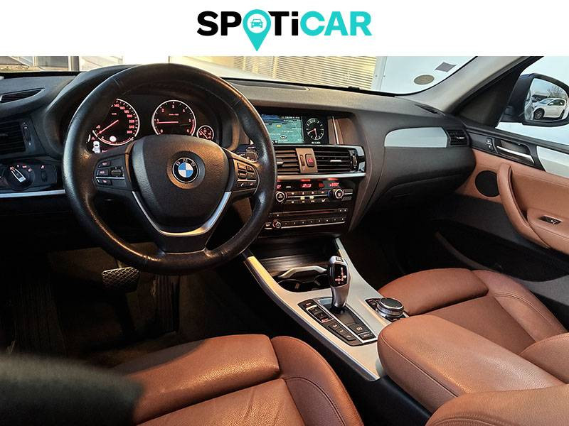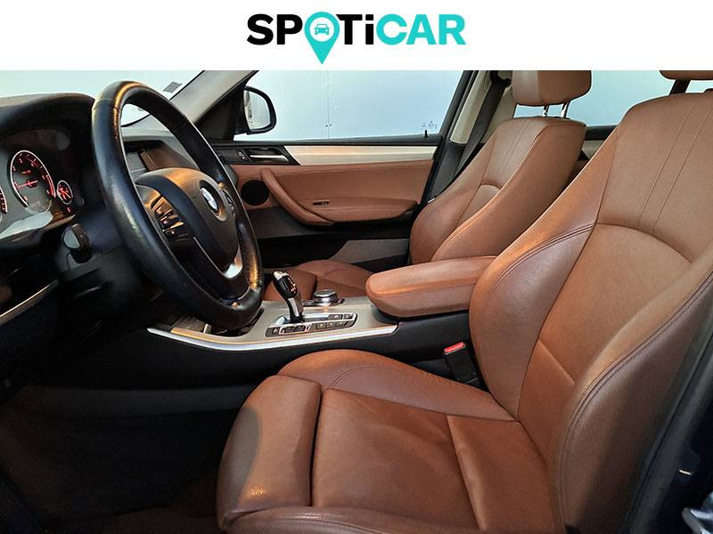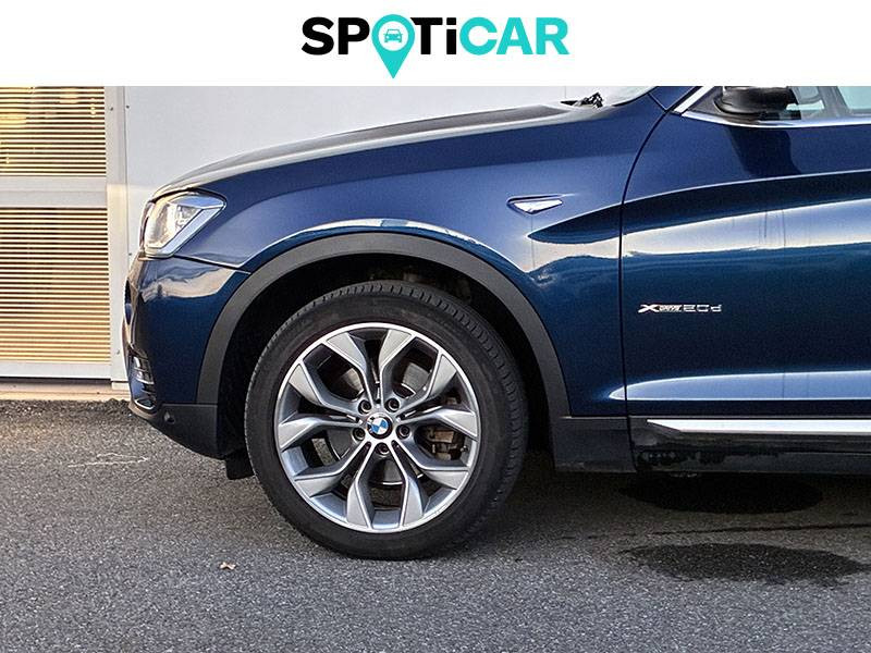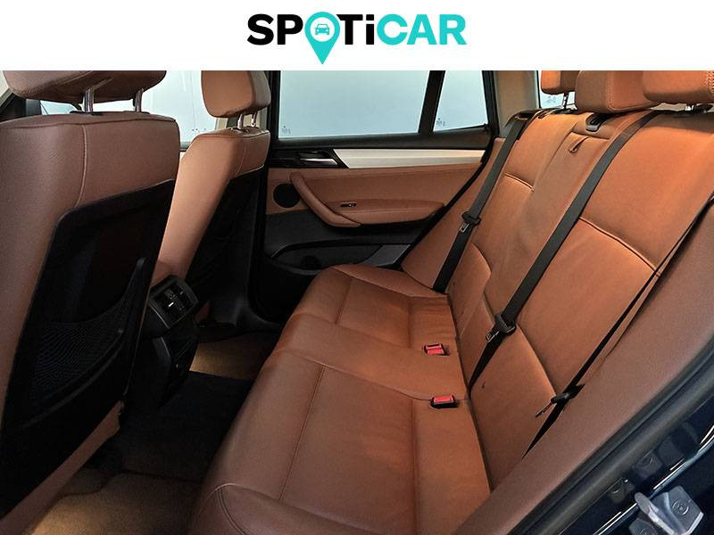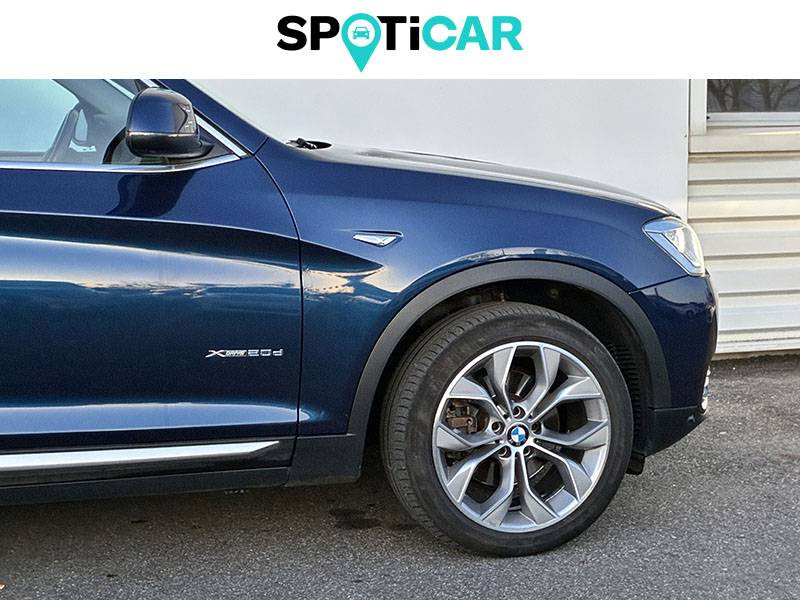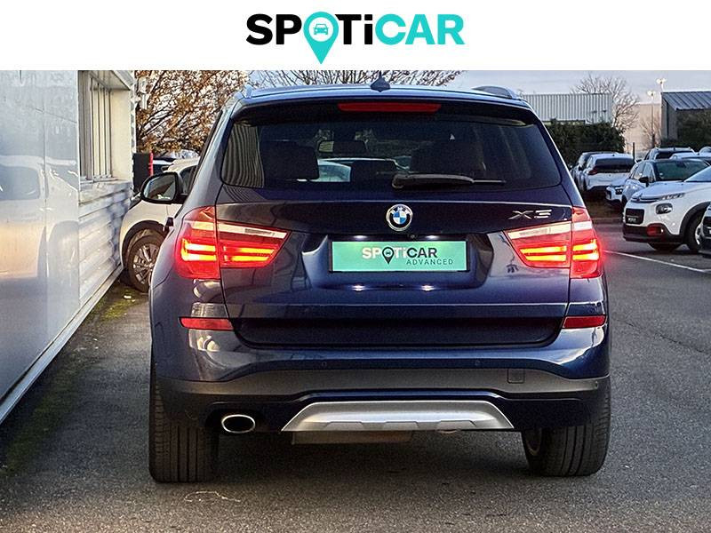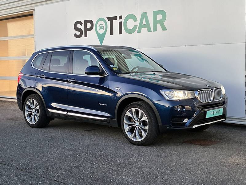 3ème feu de stop dans le becquet de hayon / 5 places / ABS, y compris assistant de freinage et Contrôle de freinage en courbe CBC / Accoudoir central AR avec 2 porte-boissons intégrés / Affichage BMW EfficientDynamics dans le cadran d'instrumentation BMW Efficient Dynamics / Affichage "xDrive" avec affichage de l'inclinaison longitudinale/transversale et de l'angle de braquage / Airbags conducteur et passager AV + latéraux + airbag de tête AV/AR / Application brillante "schwarz" au niveau de la console centrale et autour des commandes audio climatisation / Appuis-tête à toutes les places (actifs et réglables manuellement en hauteur et profondeur à l'AV) / Autoradio BMW Professional 4x25 W, 6 haut-parleurs et lecteur CD compatible MP3 / BMW Apps . / Boîte de vitesses automatique à 8 rapports / Bouquet Services BMW ConnectedDrive / Bouton Start/Stop avec démarrage sans actionner la clé / Buses de lave-glace chauffantes (non visibles) / Cache-bagages à enrouleur / Capteur d'impact (déverouillage du véhicule, allumage de l'éclairage de l'habitacle et activation des feux de détresse en cas d'impact) / Catadioptres rétro-réfléchissants intégrés à l'AR (gauche et droite) / Ceintures de sécuritéà 3 points d'ancrage à toutes les places / Ceintures de sécurité AV avec prétensionneur pyrotechnique et limiteur de tension à l'AV / Coffre: Plancher réversible, filet de rangement à gauche, sangle de fixation à droite, fourre-tout latéral à droite, boîte pliante en tissu sous le plancher, filet multifonctionnel enclipsable, glissières d'arrimage avec 4 anneaux réglables / Commande de verrouillage des portes dans les portes (conducteur + passager) / Commande électrique du hayon avec ouverture/fermeture possible via un bouton dans le poste de conduite / Compartiments de rangement dans les portes AV/AR avec porte-bouteilles (1,5L à l'AV et 1,0L à l'AR) / Conciergerie (3 ans) / Console centrale type F15 (commandes des systèmes de climatisation + audio) avec application brillante "schwarz" entourant l'ensemble / Construction allégée intelligente BMW Efficient Dynamics / Contrôle d'adhérence en descente (HDC) / Contrôle Dynamique de Stabilité DSC+ avec fonctionnalités étendues (y compris assistant de démarrage en côte) / Controller iDrive avec touches d'accès direct et 8 touches de raccourci programmables / Désactivation de l'airbag passager avec témoin lumineux dans la console de toit / Détecteur de pluie et allumage automatique des projecteurs / Direction à assistance électrique (ESP) BMW Efficient Dynamics / Direction assistée avec Servotronic / Direction Servotronic à assistance variable en fonction de la vitesse / Eclairage de bienvenue soft-on/soft-off (ciel de pavillon à l'AV et à l'AR) / Eclairage du coffre (à gauche et à droite) / Ecran d'information central couleur 6,5'' (800x480 pixels) pour affichage des données de l'ordinateu de bord, noms/n° de tel. et titres musicaux avec insert en aluminium mat de chaque côté / Ecran d'information de 2,7" (6,8 cm) dans le combiné d'instrumentation / Eléments extérieurs couleur carrosserie, pare-chocs partiellement peints / Entourage des vitres noir mat / Feux stop AR dynamique / Filet de séparation du coffre / Filets au dos des sièges AV et filet de bas d'habitacle côté passager AV / Fonction d'arrêt et de redémarrage automatique du moteur BMW Efficient Dynamics / Fonction "Ma BMW à distance" (à vie) / Fonction "roue libre" du mode ECO PRO BMW EfficientDynamics / Frein de parking électromécanique avec fonction "Automatic Hold" / Grille de calandre chromée avec barres noires / Information Trafic en Temps Réel RTTI (3 ans) / Injection directe haute précision HPI BMW Efficient Dynamics / Inscription du modèle X3 à l'AR et de la motorisation sur les flancs latéraux / Inserts décoratifs en Aluminium brossé / Instrumentation de bord avec technologie LCD pour la partie basse / Interface Bluetooth et port USB / Interface Bluetooth pour téléphone portable (avec Streaming audio et fonction "Music search") / Kit de mobilité BMW / Kit de rangement / Kit éclairage / Lève-vitres électriques AVet AR, commande par impulsion et protection anti-coincement / Ligne xLine / Mesure individuelle de pression des pneumatiques / Mode ECO PRO avec fonction "roue libre" pour les vitesses comprises entre 50 et 160 km/h / Mode ECO PRO sur le sélecteur de mode de conduite BMW EfficientDynamics / Motorisations BMW TwinPower Turbo: Diesel : composé d'un turbocompresseur à géométrie variable, de l'injection directe et d'une rampe commune Common Rail de 3ème génération (BMW EfficientDynamics) / Navigation multimédia Professional / Ordinateur de bord, Check Control et indicateur de température extérieure / Pare-soleil AV avec miroir de courtoisie / Pneumatiques à faible résistance au roulement / Pneumatiques RSC permettant le roulage à plat / Port audio USB et prise AUX IN dans l'accoudoir central AV / Porte-boissons (2 dans la console centrale AV) / Prises 12 V : 1 x dans la console centrale AV, 1 x dans la console centrale AR, 1 x dans l'accoudoir central AV et 1 x dans le coffre / Projecteurs halogènes avec fonction d'éclairage de jour (diurne) et réglage manuel de la portée / Protection contre les impacts latéraux / Rails de toit Aluminium Line satiné / Réglages individualisés Personal Profile mémorisés dans la radiocommande / Régulateur de vitesse avec fonction freinage / Renforcements noirs pour les pare-chocs, les seuils latéraux et les passages de roues / Respect de la norme EU6 BMW Efficient Dynamics / Rétroviseur intérieur électrochrome / Rétroviseurs extérieurs couleur carrosserie à réglages électriques et dégivrants mirroir asphérique côté conducteur et rappel de clignotants intégrés à technologie LED / Sellerie cuir Nevada avec empiècement dans le dossier et embossage "X" sur les appuis-tête / Services Après-vente connectés BMW TeleServices /
