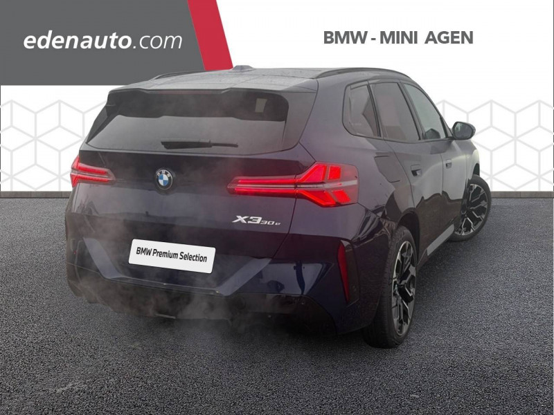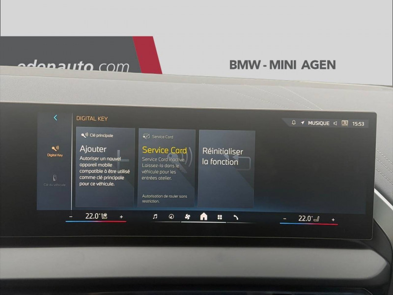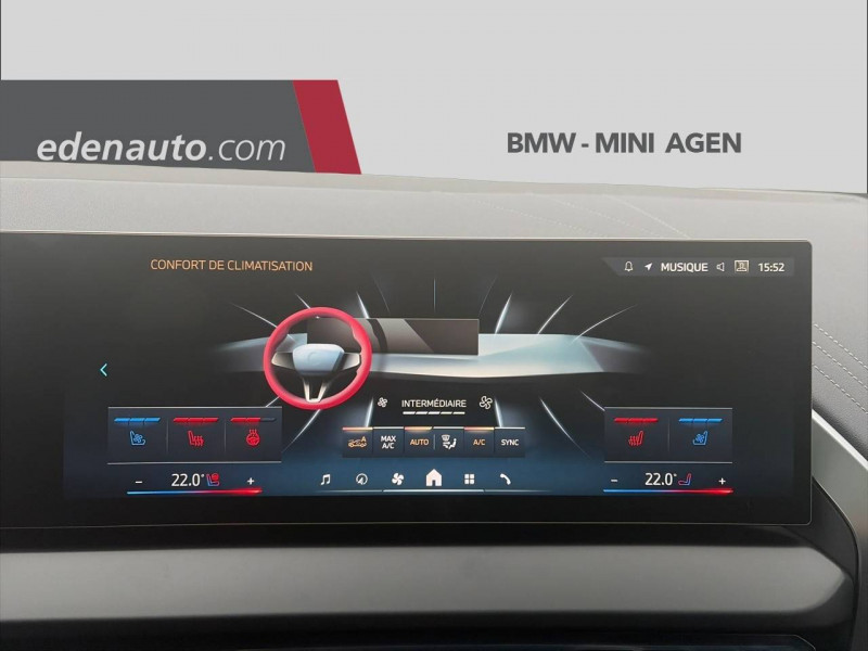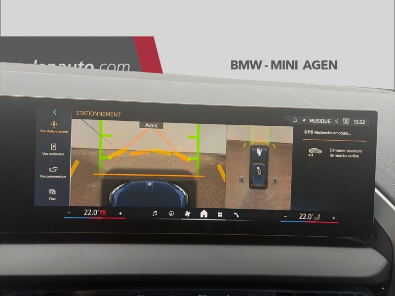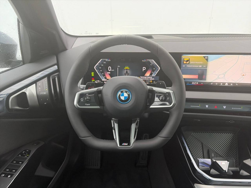 1 clé radiocommandée à mémorisation automatique des réglages "Personal Profile" 1 Setup Card & 1 Service Card / 2 porte-gobelets sur la console centrale / 3ème feu stop LED intégré au hayon AR / 5 places / Accès confort avec préparation "BMW Digital Key Plus" - Ouverture et fermeture (des 4 portes et de la malle) et démarrage sans clé - Eclairage d'accueil lorsque le conducteur se situe à 2,5 m du véhicule - Déverrouillage automatique à partir de 0,5 m du véhicule - Verrouillage automatique lorsque le conducteur s'éloigne du véhicule, à partir de 3 m / Accoudoir central AV avec panneau de commande intégré / Active Guard Avertissement de franchissement de ligne avec impulsion sur la direction (>70km/h), Avertisseur de collision frontale avec intervention de freinage (3-210km/h), Avertisseur d'intersection (détection risque collision latérale 3-85km/h), Avertisseur présence piéton/cycliste lors d'un virage en intersection (3-35km/h), Assistance de limitation de vitesse avec informations de limite de vitesse. / Aides à la conduite Driving Assistant Plus - Fonction à la demande / Aides à la conduite Driving Assistant Regroupe de nombreuses technologies pour une sécurité optimale : Avertisseur d'angle mort (>20km/h avec voyant d'alerte et intervention sur la direction), Avertisseur de risque de collision AR (déclenchement automatique des warning avec fréquence doublée), Avertisseur de sortie (détecte les objets approchant (véhicule, cycliste) et alerte en cas d'ouverture de la portière du conducteur ou des passagers si risque de collision avec l'objet détecté). Avertisseur de trafic transversal AR / Aides au stationnement Parking Assistant Radars de stationnement AV et AR, Caméra de recul, Manoeuvres de stationnemment en créneau et en bataille facilitées par mesure automatique, fonction de freinage automatique (PDC actif) en marche AR en cas d'obstacle lors d'une manoeuvre de stationnement effectuée manuellement par le conducteur (jusqu'à 5km/h), Assistant de marche arrière/Auto-reverse. / Airbag central (siège conducteur) / Airbag entre les deux sièges AV en cas de collision latérale / Airbags de tête AV et aux places latérales AR / Alarme antivol Surveillance des portes, coffre et capot moteur, protection de l'habitacle, détecteur de soulèvement et sirène. / Appel d'Urgence Intelligent (durée de vie de la voiture) Appel automatique vers le centre d'assistance BMW en cas d'accident. Touche SOS pour Appel d'Urgence manuel. Les données importantes sont automatiquement transmises aux secours : identification et localisation de la voiture, nombre de passagers à bord, statuts des airbags. Ce service utilise la carte SIM montée d'usine et ne requiert pas l'utilisation du smartphone. / Assistance de direction assistée Servotronic / BMW Digital (BMW Maps, RTTI sur itinéraire, Apple CarPlay, Android Auto, BMW Intelligent Personal Assistant) / BMW EfficientDynamics Direction à assistance électrique Servotronic (assistance variable selon la vitesse), Fonction d'arrêt et de redémarrage automatique du moteur, Système de récupération de l'énergie au freinage. / BMW IconicSounds Electric Mise en scène du son de conduite électrique à l'intérieur et à l'extérieur du véhicule. Sélection du niveau via les modes du commutateur d'expérience de conduite personnalisée: Personal : confort acoustique modéré avec faible réponse de charge, Sport : nette réponse de charge, Efficient : confort acoustique élevé sans mise en scène supplémentaire, Expressive : acoustique de conduite d'avant-garde - une réinterprétation artistique du mouvement, Relax : paysage sonore vibrant et relaxant. / BMW Live Cockpit Navigation Plus avec Écran BMW Curved Display Nouveau système d'exploitation BMW Operating System 9 avec widgets variables configurables qui affichent des informations en temps réel, Remote Software Upgrade : mise à jour du logiciel de la BMW à distance, Connectivité 4G LTE, Mise à jour pour les données de carte de navigation Over the Air (OtA), BMW Maps : nouveau système de navigation, simplification de la recherche, calcul plus rapide, navigation apprenante. / BMW xDrive Transmission intégrale permanente avec répartition variable du couple, Inclus fonctionnalité DSC étendue pour la répartition de la motricité. / Boîte de vitesses automatique à 8 rapports avec palettes au volant Boîte de vitesses automatique à 8 rapports avec sélecteur électronique et palettes au volant. / Câble de recharge Professionnel Mode 3 (T2-T2) pour la recharge publique - 5 mètres Câble de recharge Professionnel de Mode 3 triphasé avec prises Type 2 - Type 2 destinéà la recharge sur bornes publiques ou privées. Peut être utilisé sur une borne de recharge raccordée en courant monophasé ou triphasé avec des puissances de charge maximales : 7,4 kW / 32 A (en monophasé) et de 22 kW / 32 A (en triphasé). Rangement dans le coffret à câbles sous le cache du compartiment à bagages. Couleur Gris basalte. / Calandre avec barreaux droits et obliques / Capteurs d'impact - Activation de l'airbag, des feux de détresse, de l'éclairage intérieur - Déverrouillage des portes - Activation de la borne batterie de sécurité / Carte BMW Charging / Ceintures de sécurité 3 points à toutes les places / Chargeur courant alternatif AC 11 kW / Ciel de pavillon M Anthracite / Clignotants LED intégrés aux feux de jour / Climatisation automatique 3 zones Contrôle individuel de la température pour le conducteur et le passager AV, Programme automatique avec 5 niveaux d'intensité, Fonction SYNC : les réglages du conducteur s'appliquent à toute la zone passagers, Recirculation automatique de l'air (SSC), Refroidissement maximal (MAX AC), pour le conducteur et le passager AV, Microfiltre à charbon, Pré-refroidissement, Aérateurs à l'AR dans la console centrale AR. / Compartiment à bagages : 2 crochets de sac, filet sur panneau gauche, pris
