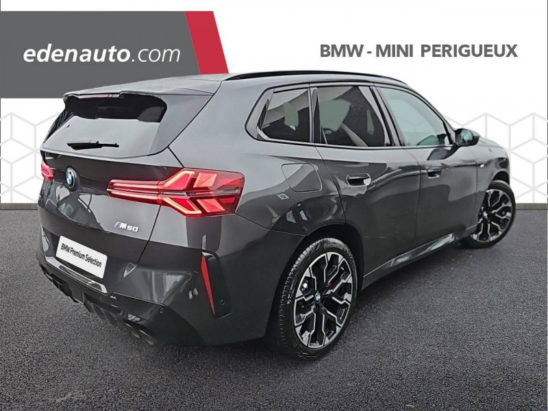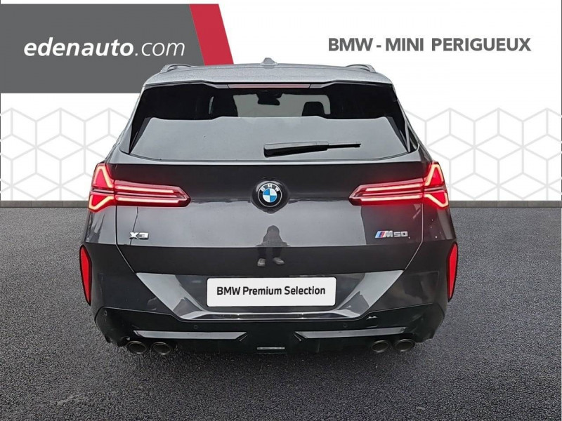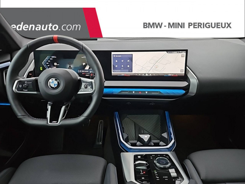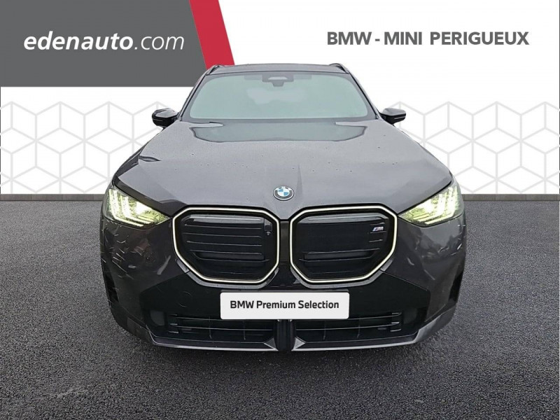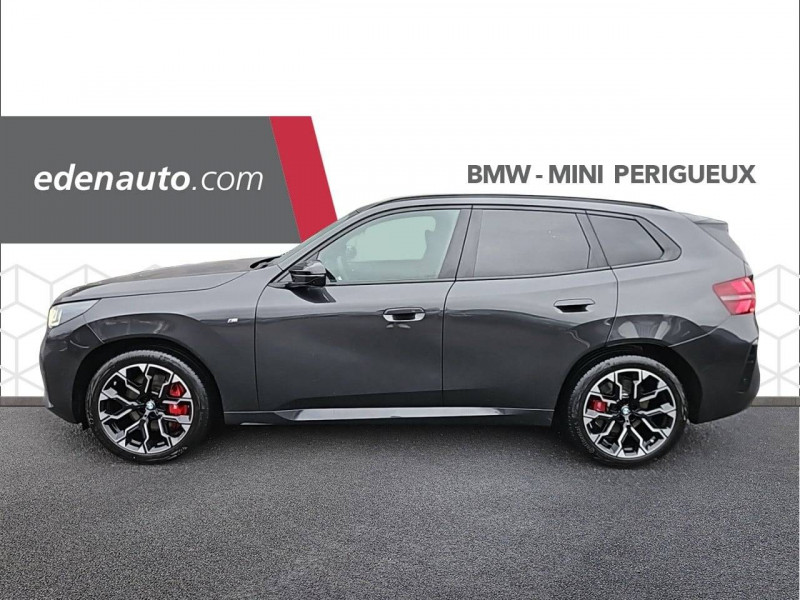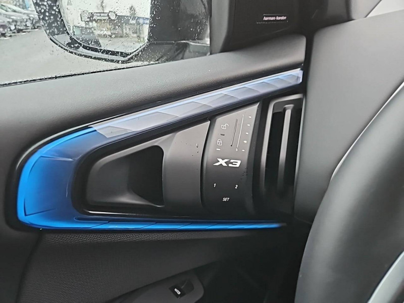 1 clé radiocommandée à mémorisation automatique des réglages "Personal Profile" 1 Setup Card & 1 Service Card / 2 porte-gobelets sur la console centrale / 2x2 sorties d'échappements M / 3ème feu stop LED intégré au hayon AR / 5 places / Accès confort avec préparation "BMW Digital Key Plus" - Ouverture et fermeture (des 4 portes et de la malle) et démarrage sans clé - Eclairage d'accueil lorsque le conducteur se situe à 2,5 m du véhicule - Déverrouillage automatique à partir de 0,5 m du véhicule - Verrouillage automatique lorsque le conducteur s'éloigne du véhicule, à partir de 3 m / Accoudoir central AV avec panneau de commande intégré / Active Guard Avertissement de franchissement de ligne avec impulsion sur la direction (>70km/h), Avertisseur de collision frontale avec intervention de freinage (3-210km/h), Avertisseur d'intersection (détection risque collision latérale 3-85km/h), Avertisseur présence piéton/cycliste lors d'un virage en intersection (3-35km/h), Assistance de limitation de vitesse avec informations de limite de vitesse. / Aides à la conduite Driving Assistant Plus - Fonction à la demande / Aides à la conduite Driving Assistant Regroupe de nombreuses technologies pour une sécurité optimale : Avertisseur d'angle mort (>20km/h avec voyant d'alerte et intervention sur la direction), Avertisseur de risque de collision AR (déclenchement automatique des warning avec fréquence doublée), Avertisseur de sortie (détecte les objets approchant (véhicule, cycliste) et alerte en cas d'ouverture de la portière du conducteur ou des passagers si risque de collision avec l'objet détecté). Avertisseur de trafic transversal AR / Aides au stationnement Parking Assistant Radars de stationnement AV et AR, Caméra de recul, Manoeuvres de stationnemment en créneau et en bataille facilitées par mesure automatique, fonction de freinage automatique (PDC actif) en marche AR en cas d'obstacle lors d'une manoeuvre de stationnement effectuée manuellement par le conducteur (jusqu'à 5km/h), Assistant de marche arrière/Auto-reverse. / Airbag central (siège conducteur) / Airbag entre les deux sièges AV en cas de collision latérale / Airbags de tête AV et aux places latérales AR / Alarme antivol Surveillance des portes, coffre et capot moteur, protection de l'habitacle, détecteur de soulèvement et sirène. / Appel d'Urgence Intelligent (durée de vie de la voiture) Appel automatique vers le centre d'assistance BMW en cas d'accident. Touche SOS pour Appel d'Urgence manuel. Les données importantes sont automatiquement transmises aux secours : identification et localisation de la voiture, nombre de passagers à bord, statuts des airbags. Ce service utilise la carte SIM montée d'usine et ne requiert pas l'utilisation du smartphone. / Assistance de direction assistée Servotronic / BMW Digital (BMW Maps, RTTI sur itinéraire, Apple CarPlay, Android Auto, BMW Intelligent Personal Assistant) / BMW EfficientDynamics Direction à assistance électrique Servotronic (assistance variable selon la vitesse), Fonction d'arrêt et de redémarrage automatique du moteur, Système de récupération de l'énergie au freinage. / BMW Live Cockpit Navigation Plus avec Écran BMW Curved Display Nouveau système d'exploitation BMW Operating System 9 avec widgets variables configurables qui affichent des informations en temps réel, Remote Software Upgrade : mise à jour du logiciel de la BMW à distance, Connectivité 4G LTE, Mise à jour pour les données de carte de navigation Over the Air (OtA), BMW Maps : nouveau système de navigation, simplification de la recherche, calcul plus rapide, navigation apprenante. / BMW xDrive Transmission intégrale permanente avec répartition variable du couple, Inclus fonctionnalité DSC étendue pour la répartition de la motricité. / Boîte de vitesses automatique à 8 rapports avec palettes au volant Boîte de vitesses automatique à 8 rapports avec sélecteur électronique et palettes au volant. / Calandre avec barreaux horizontaux noirs et logo M / Calandre illuminée "BMW Iconic Glow" Eclairage du contour de calandre BMW à l'arrêt et en roulant. Possibilité de désactivation. / Capteurs d'impact - Activation de l'airbag, des feux de détresse, de l'éclairage intérieur - Déverrouillage des portes - Activation de la borne batterie de sécurité / Ceintures de sécurité 3 points à toutes les places / Ceintures de sécurité avec liseré M Ceintures de sécurité noires avec liserés aux couleurs M / Ciel de pavillon M Anthracite / Clignotants LED intégrés aux feux de jour / Climatisation automatique 3 zones Contrôle individuel de la température pour le conducteur et le passager AV, Programme automatique avec 5 niveaux d'intensité, Fonction SYNC : les réglages du conducteur s'appliquent à toute la zone passagers, Recirculation automatique de l'air (SSC), Refroidissement maximal (MAX AC), pour le conducteur et le passager AV, Microfiltre à charbon, Pré-refroidissement, Aérateurs à l'AR dans la console centrale AR. / Compartiment à bagages : 2 crochets de sac, filet sur panneau gauche, prise 12V rangement additionel (volume spécifique au modèle) sous plancher amovible / Console centrale avec insert noir brillant / Contrôle de stabilité dynamique (DSC) avec dotation élargie Contrôle de freinage en courbe (CBC), Contrôle dynamique des freins (DBC), Stabilisation de remorque, Assistant dynamique de motricité (DTC), Freinage de séchage, Assistant de démarrage en côte, ABS - Système anti blocage des roues. / Désignation du modèle "X3" sur le hayon à gauche et version à droite / Détecteur de pluie et allumage automatique des projecteurs / Direction DirectDrive à démultiplication variable Sportivité accrue sans affecter le confort d'utilisation au quotidien : Virages directs et sportifs grâce à un angle de braquage réduit (cinématique et réglages de direction améliorés), Faible effort de braquage à ba