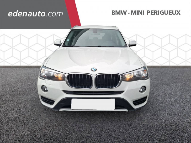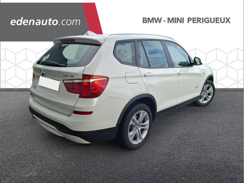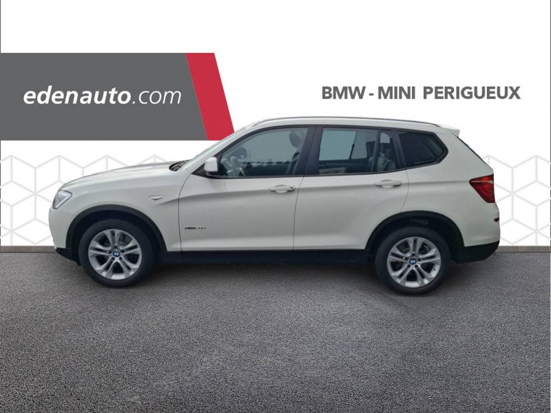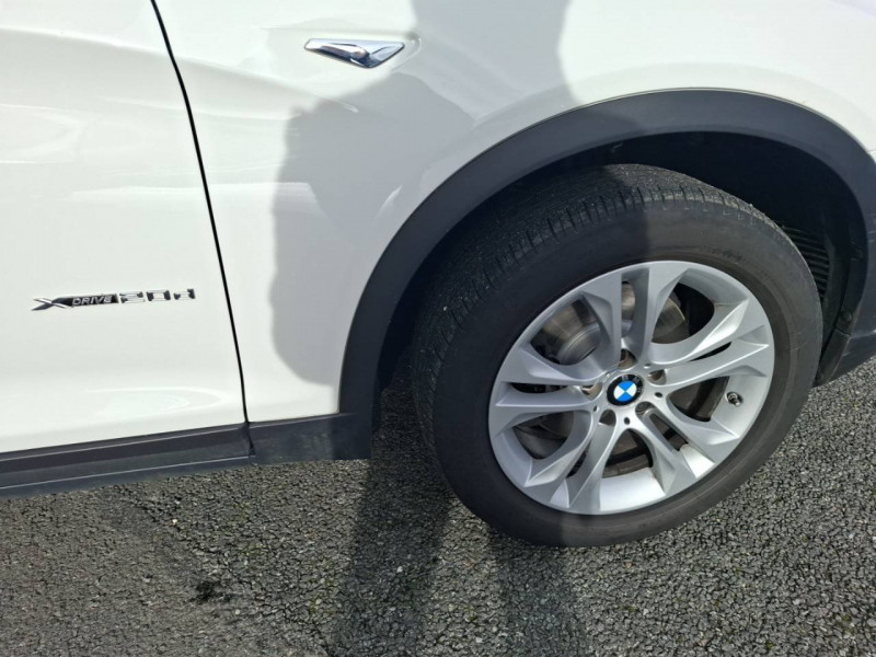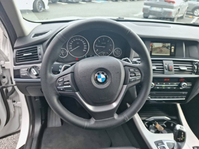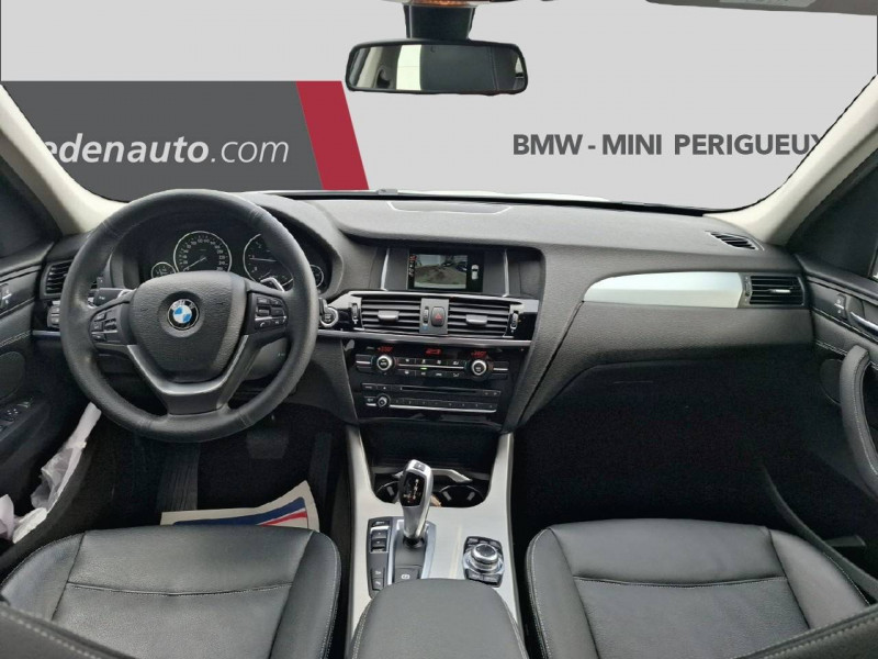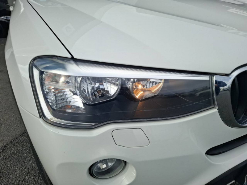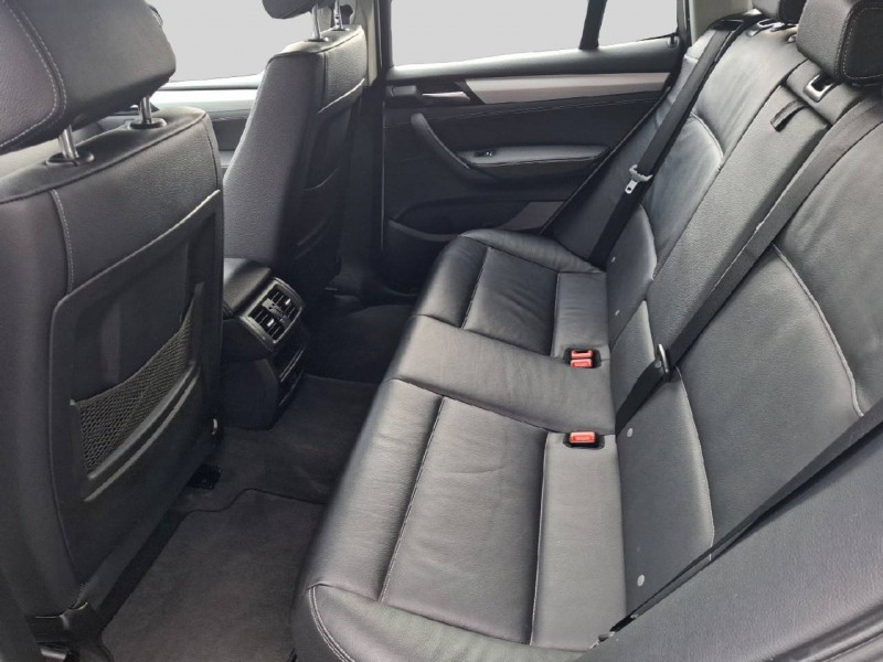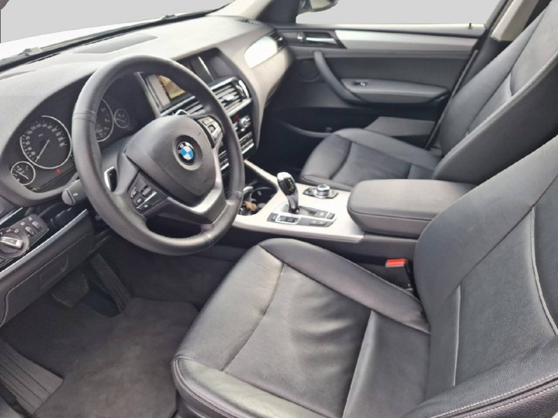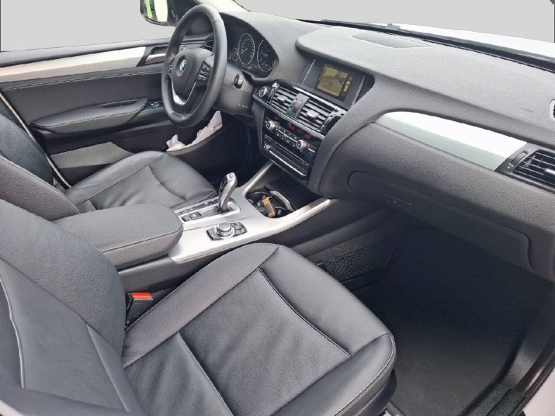 3ème feu de stop dans le becquet de hayon / 5 places / ABS, y compris assistant de freinage et Contrôle de freinage en courbe CBC / Accoudoir central AR avec 2 porte-boissons intégrés / Affichage BMW EfficientDynamics dans le cadran d'instrumentation BMW Efficient Dynamics / Affichage "xDrive" avec affichage de l'inclinaison longitudinale/transversale et de l'angle de braquage / Airbags conducteur et passager AV + latéraux + airbag de tête AV/AR / Aluminium Line satiné / Application brillante "schwarz" au niveau de la console centrale et autour des commandes audio climatisation / Appuis-tête à toutes les places (actifs et réglables manuellement en hauteur et profondeur à l'AV) / Autoradio BMW Professional 4x25 W, 6 haut-parleurs et lecteur CD compatible MP3 / Boîte de vitesses automatique à 8 rapports / Bouton Start/Stop avec démarrage sans actionner la clé / Buses de lave-glace chauffantes (non visibles) / Cache-bagages à enrouleur / Capteur d'impact (déverouillage du véhicule, allumage de l'éclairage de l'habitacle et activation des feux de détresse en cas d'impact) / Catadioptres rétro-réfléchissants intégrés à l'AR (gauche et droite) / Ceintures de sécuritéà 3 points d'ancrage à toutes les places / Ceintures de sécurité AV avec prétensionneur pyrotechnique et limiteur de tension à l'AV / Coffre: Plancher réversible, filet de rangement à gauche, sangle de fixation à droite, fourre-tout latéral à droite, boîte pliante en tissu sous le plancher, filet multifonctionnel enclipsable, glissières d'arrimage avec 4 anneaux réglables / Commande de verrouillage des portes dans les portes (conducteur + passager) / Commande électrique du hayon avec ouverture/fermeture possible via un bouton dans le poste de conduite / Compartiments de rangement dans les portes AV/AR avec porte-bouteilles (1,5L à l'AV et 1,0L à l'AR) / Console centrale type F15 (commandes des systèmes de climatisation + audio) avec application brillante "schwarz" entourant l'ensemble / Construction allégée intelligente BMW Efficient Dynamics / Contrôle d'adhérence en descente (HDC) / Contrôle Dynamique de Stabilité DSC+ avec fonctionnalités étendues (y compris assistant de démarrage en côte) / Controller iDrive avec touches d'accès direct et 8 touches de raccourci programmables / Désactivation de l'airbag passager avec témoin lumineux dans la console de toit / Détecteur de pluie et allumage automatique des projecteurs / Direction à assistance électrique (ESP) BMW Efficient Dynamics / Direction assistée avec Servotronic / Direction Servotronic à assistance variable en fonction de la vitesse / Eclairage de bienvenue soft-on/soft-off (ciel de pavillon à l'AV et à l'AR) / Eclairage du coffre (à gauche et à droite) / Ecran d'information central couleur 6,5'' (800x480 pixels) pour affichage des données de l'ordinateu de bord, noms/n° de tel. et titres musicaux avec insert en aluminium mat de chaque côté / Ecran d'information de 2,7" (6,8 cm) dans le combiné d'instrumentation / Eléments extérieurs couleur carrosserie, pare-chocs partiellement peints / Entourage des vitres noir mat / Equipements Fintion Lounge/Finition Business / Feux stop AR dynamique / Filet de séparation du coffre / Filets au dos des sièges AV et filet de bas d'habitacle côté passager AV / Fonction d'arrêt et de redémarrage automatique du moteur BMW Efficient Dynamics / Fonction "roue libre" du mode ECO PRO BMW EfficientDynamics / Frein de parking électromécanique avec fonction "Automatic Hold" / Grille de calandre chromée avec barres noires / Injection directe haute précision HPI BMW Efficient Dynamics / Inscription du modèle X3 à l'AR et de la motorisation sur les flancs latéraux / Inserts décoratifs Argent satiné mat / Instrumentation de bord avec technologie LCD pour la partie basse / Interface Bluetooth et port USB / Interface Bluetooth pour téléphone portable (avec Streaming audio et fonction "Music search") / Jantes en alliage léger 17" style 306 Aero, 8Jx17"/ pneus 245/55 R17 (comprend Ecrous antivol de roues) / Kit de mobilité BMW / Kit de rangement / Kit éclairage / Lève-vitres électriques AVet AR, commande par impulsion et protection anti-coincement / Mesure individuelle de pression des pneumatiques / Mode ECO PRO avec fonction "roue libre" pour les vitesses comprises entre 50 et 160 km/h / Mode ECO PRO sur le sélecteur de mode de conduite BMW EfficientDynamics / Motorisations BMW TwinPower Turbo: Diesel : composé d'un turbocompresseur à géométrie variable, de l'injection directe et d'une rampe commune Common Rail de 3ème génération (BMW EfficientDynamics) / Navigation multimédia Business / Ordinateur de bord, Check Control et indicateur de température extérieure / Pare-soleil AV avec miroir de courtoisie / Pneumatiques à faible résistance au roulement / Port audio USB et prise AUX IN dans l'accoudoir central AV / Porte-boissons (2 dans la console centrale AV) / Prises 12 V : 1 x dans la console centrale AV, 1 x dans la console centrale AR, 1 x dans l'accoudoir central AV et 1 x dans le coffre / Projecteurs halogènes avec fonction d'éclairage de jour (diurne) et réglage manuel de la portée / Protection contre les impacts latéraux / Rails de toit Aluminium Line satiné / Réglages individualisés Personal Profile mémorisés dans la radiocommande / Régulateur de vitesse avec fonction freinage / Renforcements noirs pour les pare-chocs, les seuils latéraux et les passages de roues / Respect de la norme EU6 BMW Efficient Dynamics / Rétroviseur intérieur électrochrome / Rétroviseurs extérieurs couleur carrosserie à réglages électriques et dégivrants mirroir asphérique côté conducteur et rappel de clignotants intégrés à technologie LED / Services Après-vente connectés BMW TeleServices / Sièges AV réglables à réglages manuels (en hauteur, longueur et inclinaison) / Sortie d'echappement ovale simple (gauche) chromée / Système de