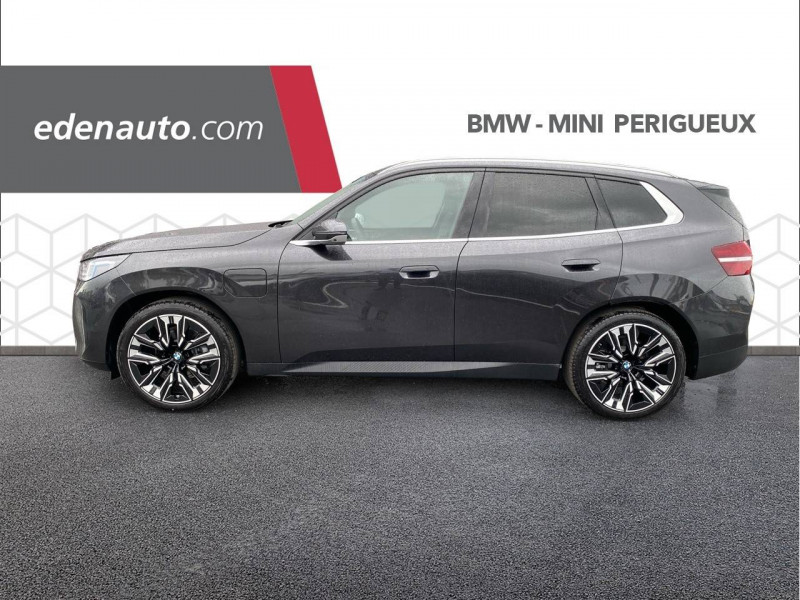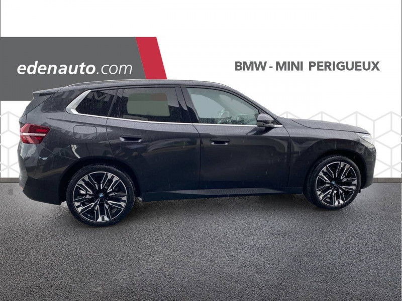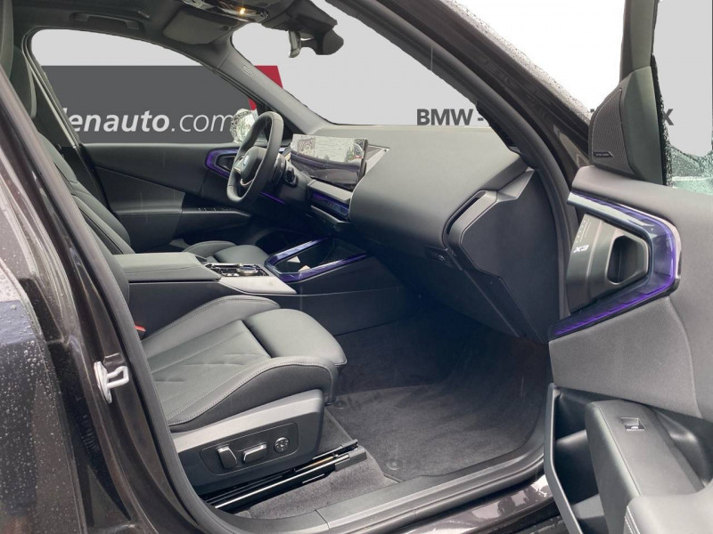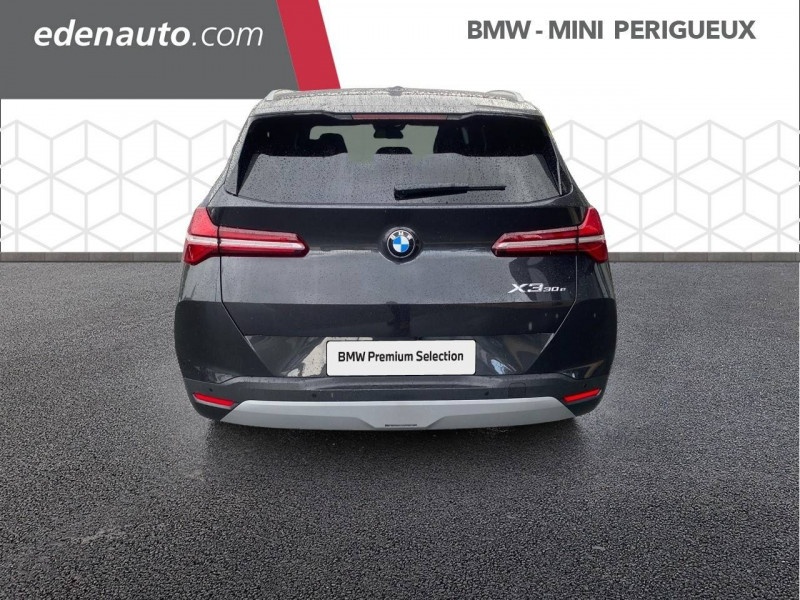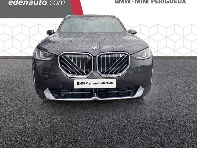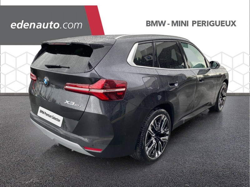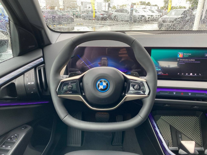 2 porte-gobelets sur la console centrale / 3ème feu stop LED intégré au hayon AR / 5 places / Accès confort avec préparation "BMW Digital Key Plus" - Ouverture et fermeture (des 4 portes et de la malle) et démarrage sans clé - Eclairage d'accueil lorsque le conducteur se situe à 2,5 m du véhicule - Déverrouillage automatique à partir de 0,5 m du véhicule - Verrouillage automatique lorsque le conducteur s'éloigne du véhicule, à partir de 3 m / Accoudoir central AV avec panneau de commande intégré / Active Guard Avertissement de franchissement de ligne avec impulsion sur la direction (>70km/h), Avertisseur de collision frontale avec intervention de freinage (3-210km/h), Avertisseur d'intersection (détection risque collision latérale 3-85km/h), Avertisseur présence piéton/cycliste lors d'un virage en intersection (3-35km/h), Assistance de limitation de vitesse avec informations de limite de vitesse. / Airbag central (siège conducteur) / Airbag entre les deux sièges AV en cas de collision latérale / Airbags de tête AV et aux places latérales AR / Alarme antivol Surveillance des portes, coffre et capot moteur, protection de l'habitacle, détecteur de soulèvement et sirène. / Aluminium Line / Appel d'Urgence Intelligent (durée de vie de la voiture) Appel automatique vers le centre d'assistance BMW en cas d'accident. Touche SOS pour Appel d'Urgence manuel. Les données importantes sont automatiquement transmises aux secours : identification et localisation de la voiture, nombre de passagers à bord, statuts des airbags. Ce service utilise la carte SIM montée d'usine et ne requiert pas l'utilisation du smartphone. / BMW Digital (BMW Maps, RTTI sur itinéraire, Apple CarPlay, Android Auto, BMW Intelligent Personal Assistant) / BMW EfficientDynamics Direction à assistance électrique Servotronic (assistance variable selon la vitesse), Fonction d'arrêt et de redémarrage automatique du moteur, Système de récupération de l'énergie au freinage. / BMW IconicSounds Electric Mise en scène du son de conduite électrique à l'intérieur et à l'extérieur du véhicule. Sélection du niveau via les modes du commutateur d'expérience de conduite personnalisée: Personal : confort acoustique modéré avec faible réponse de charge, Sport : nette réponse de charge, Efficient : confort acoustique élevé sans mise en scène supplémentaire, Expressive : acoustique de conduite d'avant-garde - une réinterprétation artistique du mouvement, Relax : paysage sonore vibrant et relaxant. / BMW Live Cockpit Navigation Plus avec Écran BMW Curved Display Nouveau système d'exploitation BMW Operating System 9 avec widgets variables configurables qui affichent des informations en temps réel, Remote Software Upgrade : mise à jour du logiciel de la BMW à distance, Connectivité 4G LTE, Mise à jour pour les données de carte de navigation Over the Air (OtA), BMW Maps : nouveau système de navigation, simplification de la recherche, calcul plus rapide, navigation apprenante. / BMW xDrive Transmission intégrale permanente avec répartition variable du couple, Inclus fonctionnalité DSC étendue pour la répartition de la motricité. / Boîte de vitesses automatique à 8 rapports avec palettes au volant Boîte de vitesses automatique à 8 rapports avec sélecteur électronique et palettes au volant. / Câble de recharge Professionnel Mode 3 (T2-T2) pour la recharge publique - 5 mètres Câble de recharge Professionnel de Mode 3 triphasé avec prises Type 2 - Type 2 destinéà la recharge sur bornes publiques ou privées. Peut être utilisé sur une borne de recharge raccordée en courant monophasé ou triphasé avec des puissances de charge maximales : 7,4 kW / 32 A (en monophasé) et de 22 kW / 32 A (en triphasé). Rangement dans le coffret à câbles sous le cache du compartiment à bagages. Couleur Gris basalte. / Calandre avec barreaux droits et obliques / Capteurs d'impact - Activation de l'airbag, des feux de détresse, de l'éclairage intérieur - Déverrouillage des portes - Activation de la borne batterie de sécurité / Ceintures de sécurité 3 points à toutes les places / Chargeur courant alternatif AC 11 kW / Clignotants LED intégrés aux feux de jour / Climatisation automatique 3 zones Contrôle individuel de la température pour le conducteur et le passager AV, Programme automatique avec 5 niveaux d'intensité, Fonction SYNC : les réglages du conducteur s'appliquent à toute la zone passagers, Recirculation automatique de l'air (SSC), Refroidissement maximal (MAX AC), pour le conducteur et le passager AV, Microfiltre à charbon, Pré-refroidissement, Aérateurs à l'AR dans la console centrale AR. / Compartiment à bagages : 2 crochets de sac, filet sur panneau gauche, prise 12V rangement additionel (volume spécifique au modèle) sous plancher amovible / Console centrale avec insert noir brillant / Contrôle de stabilité dynamique (DSC) avec dotation élargie Contrôle de freinage en courbe (CBC), Contrôle dynamique des freins (DBC), Stabilisation de remorque, Assistant dynamique de motricité (DTC), Freinage de séchage, Assistant de démarrage en côte, ABS - Système anti blocage des roues. / Désignation du modèle "X3" sur le hayon à gauche et version à droite / Détecteur de pluie et allumage automatique des projecteurs / Driving Assistant Plus - Fonction à la demande / Driving Assistant Regroupe de nombreuses technologies pour une sécurité optimale : Avertisseur d'angle mort (>20km/h avec voyant d'alerte et intervention sur la direction), Avertisseur de risque de collision AR (déclenchement automatique des warning avec fréquence doublée), Avertisseur de sortie (détecte les objets approchant (véhicule, cycliste) et alerte en cas d'ouverture de la portière du conducteur ou des passagers si risque de collision avec l'objet détecté). Avertisseur de trafic transversal AR / Eclairage d'ambiance Rétroéclairage des éléments suivants (15 couleurs a