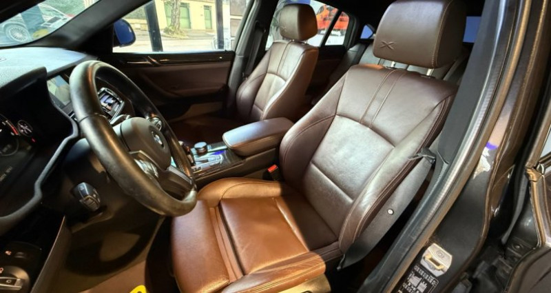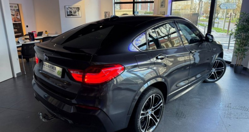 Cylindrée : 1995 cm3 EQUIPEMENTS DE SERIE ========================= 3eme feu de stop dans le becquet de hayon 5 places ABS, y compris assistant de freinage et Controle de freinage en courbe CBC Accoudoir central AV avec espace de rangement Accoudoir chauffant au niveau des portieres et de la console centrale AV Accoudoirs chauffants au niveau des portieres et de la console centrale a l'AV. Affichage xDrive avec affichage de l'inclinaison longitudinale/transversale et de l'angle de Affichage BMW EfficientDynamics dans le cadran d'instrumentation Airbags conducteur et passager AV + lateraux + airbag de tete AV/AR Antidemarrage electronique Appel d'Urgence Intelligent Application brillante schwarz au niveau de la console centrale et autour des commandes audio Appuis-tete a toutes les places (actifs et reglables manuellement en hauteur et profondeur a l'AV) Autoradio BMW Professional 4x25 W, 6 haut-parleurs et lecteur CD compatible MP3 Banquette AR rabattable en 3 parties (40/20/40) Boite de vitesses automatique avec palettes au volant Boite de vitesses automatique Sport a 8 rapports Bouton Start/Stop avec demarrage sans actionner la cle Buses de lave-glace chauffantes (non visibles) Capteur d'impact (deverouillage du vehicule, allumage de l'eclairage de l'habitacle et activation Catadioptres retro-reflechissants integres a l'AR (gauche et droite) Ceintures de securite a 3 points d'ancrage a toutes les places Ceintures de securite AV avec pretensionneur pyrotechnique et limiteur de tension a l'AV Chrome Line exterieur Ciel de pavillon Anthrazit Climatisation automatique tri-zone avec aerateurs a l'AR Colonne de direction reglable manuellement en hauteur et en profondeur Commande de verrouillage des portes dans les portes (conducteur + passager) Commande electrique du hayon avec ouverture/fermeture possible via un bouton dans le poste de Compartiments de rangement dans les portes AV/AR avec porte-bouteilles (1,5L a l'AV et 1,0L a l'AR) Console centrale type F15 (commandes des systemes de climatisation + audio) avec application Construction allegee intelligente Controle de la Transmission Controle de motrice en descente (HDC) Controle Dynamique de Stabilite DSC+ avec fonctionnalites etendues (y compris assistant de demarrage Controle dynamique de traction DTC Controller iDrive avec touches d'acces direct et 8 touches de raccourci programmables Desactivation de l'airbag passager avec temoin lumineux dans la console de toit Detecteur de pluie et allumage automatique des projecteurs Direction a assistance electrique (ESP) Direction assistee avec Servotronic Direction DirectDrive a demultiplication variable Direction Servotronic a assistance variable en fonction de la vitesse Eclairage de bienvenue soft-on/soft-off (ciel de pavillon a l'AV et a l'AR) Eclairage du coffre (a gauche et a droite) Eclairage interieur soft-on/soft-off (ciel de pavillon a l'AV et a l' AR) Ecran d'information central couleur 6,5'' (800x480 pixels) pour affichage des donnees de Ecran d'information de 2,7 (6,8 cm) dans le combine d'instrumentation Ecran d'information de 5,7 dans le combine d'instrumentation Ecrous antivol de roues Elements exterieurs couleur carrosserie, pare-chocs partiellement peints Encadrement des vitres laterales en Aluminium Line satine Feux AR avec conduits lumineux a LED Feux de route anti-eblouissement Feux stop AR dynamique Filtre a particules Finition M Sport Fixation ISOFIX aux places laterales AR Fonction roue libre du mode ECO PRO Fonction d'arret et de redemarrage automatique du moteur Frein de parking electromecanique avec fonction Automatic Hold Freins a disques ventiles AV/AR Grille de calandre chromee avec barres noires Inscription du modele X4 a l'AR (hayon) et de la motorisation sur les flancs lateraux Inserts decoratifs en Aluminium brosse Instrumentation de bord avec technologie LCD pour la partie basse Interface Bluetooth et port USB Jantes en alliage leger 19 style 622M a rayons doubles avec pneumatiques mixtes Kit aerodynamique M Kit de mobilite BMW Kit de rangement Kit eclairage Leve-vitres AV/AR electriques a commande a impulsion et protection anti-coincement Leve-vitres electriques AVet AR, commande par impulsion et protection anti-coincement Ligne M Sport Mesure individuelle de pression des pneumatiques Mode ECO PRO avec fonction roue libre pour les vitesses comprises entre 50 et 160 km/h Mode ECO PRO sur le selecteur de mode de conduite Motorisations BMW TwinPower Turbo: Diesel : compose d'un turbocompresseur a geometrie variable, de Navigation multimedia Business Ordinateur de bord avec Check-Control et indicateur de temperature exterieure Pack Advanced Full LED Pack Sport M Pare-soleil AV avec miroir de courtoisie Pneumatiques a faible resistance au roulement Pneumatiques RSC permettant le roulage a plat Port audio USB et prise AUX IN dans l'accoudoir central AV Porte-boissons (2 dans la console centrale AV) Prises 12V (1 x dans la console centrale AV et 1 x dans le coffre) Projecteurs antibrouillard a LED Projecteurs bi-Xenon avec lave-projecteurs Protection contre les impacts lateraux Radars de stationnement AV et AR PDC Reglages individualises Personal Profile memorises dans la radiocommande Regulateur de vitesse avec fonction freinage Renforcements noirs pour les pare-chocs, les seuils lateraux et les passages de roues Respect de la norme EU6 Retroviseur interieur electrochrome Retroviseurs exterieurs couleur carrosserie a reglages electriques et degivrants Retroviseurs exterieurs electrochromes et rabattables electriquement Selecteur de mode de conduite - 4 modes : ECO PRO, Comfort, Sport et Sport + Sellerie tissu/cuir Pearlpoint Services Apres-vente connectes BMW TeleServices Shadow Line brillant Sieges Advanced pour conducteur et passager AV Sieges AV a reglages manuels (en hauteur, longueur et inclinaison) Sortie d'echappement ovale simple (gauche) chromee Suspension DirectDrive Systeme de recuperation de l'energie au freinage Tapis de sol en velours Technologie 4 r