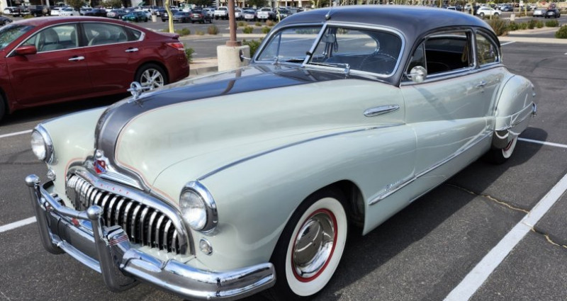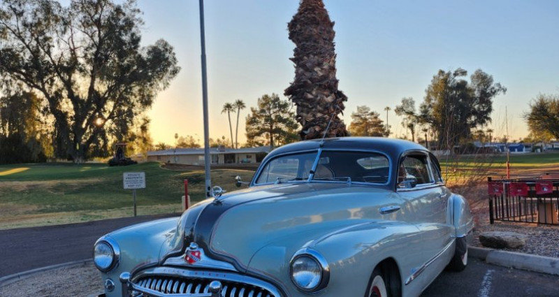 1948 Buick Roadmaster 76S Sedanette, dual Stromberg Aero carburetors, 3 speed Syncromesh transmission, 320 inline 8-cylinder engine (160 HP), AM radio (working), dash and floor heaters, turn signals, reverse lights, adjustable manual radio antenna, clock, 6 volt system, NOS AC spark plugs, Pertronix ignition, Syncromesh transmission in good condition, cruises at 70 MPH, push button start, fresh paint (Cumulus Gray and Nickel Gray), no rust, red interior with red edged carpet mats, trunk fully lined, dual exhaust with NOS Blue Streak mufflers, original 48-49 shop manual, NOS Syncromesh clutch assembly, delco regulators and relays, spark plugs included.. Provenance : Arizona. Disponibilité : environ 7 semaines, clés en main. 38 500 € tout compris (importation, taxes, procédure d'immatriculation). Annonce publiée le 28/11/2025