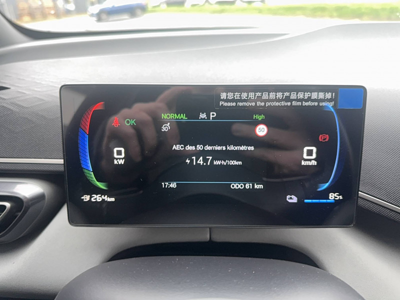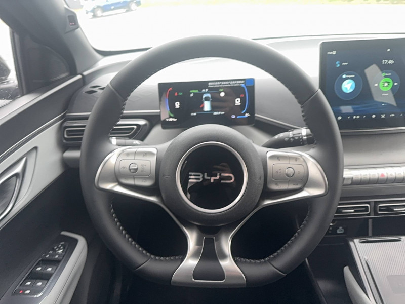Système de contrôle de traction (TCS) / Système de stabilisation éléctronique (ESP) / Tableau de bord 7" / Vitre côté conducteur, à impulsion et avec fonction anti-pincement / Vitres AR et lunette AR, verre teinté / 2 x clé intelligente / Pare-brise AV, essuie-glaces à détection de pluie / Pare-soleil AV avec éclairage du miroir / Ports USB AV, 1 x 18 W type C, 1 x 60 W type C / Régulateur de vitesse adaptatif (ACC) et régulateur de vitesse intelligent (ICC) / Fonction véhicule-charge (V2L) / Freinage d'urgence automatique (AEB) / Freinage intelligent (IPB) / Frein de stationnement électrique (EPB) / Gestion de la fatigue du conducteur (DFM) indirecte / ISOFIX and i-Size, front passenger and outer rear seats / Keyless entry & keyless start / Lampes de lecture AV à LED / Modes du conduite: Eco, Normal, Sport, Snow / Navigation / Sécurité enfant mécanique / Sellerie, similicuir vegan noir et gris / Service Cloud - Appli BYD / Siège conducteur, réglable électriquement, 6 directions / Distribution électronique de la force de freinage (EBD) / Eclairages de sol par les rétroviseurs extérieurs / Aide d'urgence au maintien dans la voie (ELKA) / Airbag passager AV, contacteur de désactivation / Android Auto et Apple CarPlay / Arrêt confort (CST) / Auto Hold / Automat à fonction continue / Avertissement prédictif de collision (PCW) / Caméra de vue à 360° / Ceintures de sécurité AV pré-tendues et limitatrices d'effort / Chargement sans fil pour smartphone, 15 W / Chargeur embarqué 11 kW / Clé Digitale BYD / Commande vocale intelligente - "Hi, BYD" / Connectivité 4G à bord / Contrôle de limite de vitesse intelligent (ISLC) / Contrôle intelligent des feux de route (IHBC) / DAB+ et FM / Ecran tactile rotatif électrique 10,1" / Siège passager AV, réglable électriquement, 4 directions / Sièges AR rabattables divisés, 50:50 / Système anti bloquage (ABS) /
