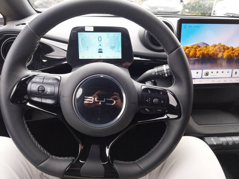 2 x clé intelligente et 1 x carte-clé NFC / 4 x lève-vitre à impulsion avec fonction anti-pincement / Accoudoir AR avec 2 porte-gobelets / Aide d'urgence au maintien dans la voie (ELKA) / Airbag passager AV avec contacteur de désactivation / Alerte de trafic transversal AR (RCTA) et freinage en cas de trafic transversal AR (RCTB) / Alerte de trafic transversal AV (FCTA) et freinage en cas de trafic transversal AV (FCTB) / Android Auto et Apple CarPlay / Arrêt confort (CST) / Avertissement de collision AV (FCW) / Avertissement d'ouverture de porte (DOW) / Boîte de vitesse automatique à variation continue / Caméra à 360° / Chargeur embarqué 11kW (OBC) / Clé Digitale BYD / Commande vocale intelligente "Hi, BYD" / Connectivité 4G embarquée / Contrôle de limite de vitesse intelligente (ISLC) / Contrôle intelligent des feux de route (IHBC) / DAB+ & FM / Détection d'angle mort (BSD) / Détection de présence d'enfant (DPC) / Distribution électronique de la force de freinage (EBD) / Eclairage d'accompagnement (fonction d'allumage anticipé et d'extinction différée des phares) / Eclairage de coffre / Eclairages de sol par les rétroviseurs extérieurs / Ecran tactile rotatif électrique 12,8" / Filtre à air PM2.5 / Fonction Véhicule à chargement (V2L) / Freinage d'urgence automatique (AEB) / Frein assisté intelligent (IPB) / Gestion de la fatigue du conducteur (DFM) indirecte / ISOFIX et i-Size, siège passager AV et sièges AR latéraux / Lampes de lecture à LED AR / Lampes de lecture à LED AV / Maintien automatique (Auto Hold) / Modes de conduite : Eco, Normal, Sport, Neige / Navigation / Pare-brise AV, essuie-glaces a détection de pluie / Pare-soleil AV avec éclairage du miroir / Pompe à chaleur / Ports USB AR, 1 x 18W type A, 1 x 60W type C / Ports USB AV, 1 x 18 W type C, 1 x 60 W type C / Régulateur de vitesse adaptatif (ACC) et régulateur de vitesse intelligent (ICC) / Service Cloud - Appli BYD / Siège du conducteur avec réglage électrique dans 6 directions / Siège du passager AV avec réglage électrique dans 4 directions / Sièges AR rabattables séparément - 40:60 / Sièges en similicuir vegan / Système antipatinage (TCS) / Système audio à 6 HPs avec optimisation du son / Système de frein de stationnement électrique (EPB) / Tableau de bord TFT 5" tout LCD / Tablette AR du coffre / Verrouillage de sécurité enfant mécanique / Volant multifonction, cuir vegan, chauffant / / Modèles équivalents : Volvo EX30 - MG4 - Megane E-Tech - VW ID3