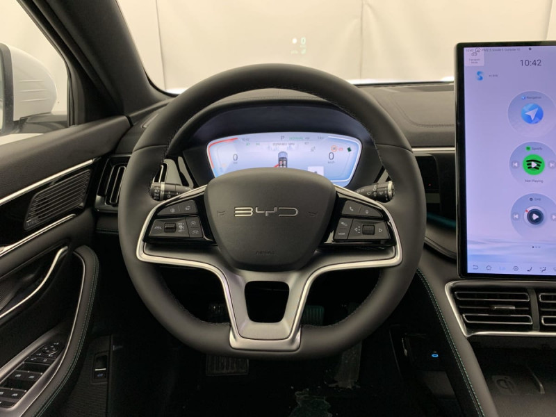 Barres de toit en aluminium / Eclairages de sol par les rétroviseurs extérieurs / Tablette AR du coffre / Sièges AR rabattables séparément - 40:60 / Lampe de lecture à LED AV / Lampe de lecture à LED latérale AR / 4 x lève-vitre à impulsion avec fonction anti-pincement / Rétroviseur à atténuation automatique / Ecran tactile rotatif électrique 15,6" / Airbag passager AV avec contacteur de désactivation / Détection d'angle mort (BSD) / Système antipatinage (TCS) / Distribution électronique de la force de freinage (EBD) / Arrêt confort (CST) / Contrôle de descente en pente (HDC) / Avertissement d'ouverture de porte (DOW) / Régulateur de vitesse adaptatif (ACC) et régulateur de vitesse intelligent (ICC) / Avertissement de collision AV (FCW) / Freinage d'urgence automatique (AEB) / Avertissement de collision AR (RCW) / Assistance au maintien sur la voie (LKA) / Assistance au changement de voie (LCA) / Verrouillage de sécurité enfant mécanique / Chargeur embarqué 11 kW (OBC) / Eclairage d'accueil dynamique / Siège conducteur avec appuie-tête intégré / Siège passager AV avec ventilation et chauffage / Siège passager AV avec appuie-tête intégré / Tableau de bord LCD 12,3" tout TFT / Système de verrouillage automatique / Avertissement de sortie de voie (LDW) / Assistance hydraulique au freinage (HBA) / Contrôle de la dynamique du véhicule (VDC) / Contrôle de maintien en côte (HHC) / Décélération contrôlée pour frein de stationnement (CDP) / Eclairage d'accompagnement (fonction d'allumage anticipé et d'extinction différée des phares) / Caméra à 360° / Frein de stationnement électronique (EPB) / Alerte de trafic transversal AV (FCTA) et freinage en cas de trafic transversal AV (FCTB) / Alerte de trafic transversal AR (RCTA) et freinage en cas de trafic transversal AR (RCTB) / Assistance feux de route (HMA) / Toit ouvrant panoramique avec fonction anti-pincement, avec pare-soleil à réglage électrique / Jantes en alliage 19" bicolores avec pneus 235/50 R19 / Pare-brise AV, protection anti-UV, isolation thermique, insonorisation / Pare-brise AV, essuie-glaces a détection de pluie / Vitres AR et lunette AR, vitrage surteinté / Volant chauffant / Siège conducteur, réglable électriquement, 8 directions, mémoire de position / Siège conducteur, ventilé, chauffant, réglage mémorisé / Siège passager AV réglable éclectriquement, 4 directions / Sièges AR, appuie-tête réglable manuellement / Eclairage ambiant, multicolore, réagissant au rythme / Eclairages de sol de siège AV / Eclairages de porte AV à LED / Pare-soleil AV avec éclairage du miroir / Bouches d'aération AR / Accoudoir AR, 2 porte-gobelets / DAB+ & FM / Système audio Infinity à 10 HP / Commande vocale intelligente - "Hi, BYD" / Service Cloud - Appli BYD / Ports USB AV, 1 x 18 W type C, 1 x 60 W type C / Ports USB AR, 2 x 18 W type C / Charge sans fil de smartphone 2x15W / Ceinture de sécuritéà limitation de force de siége AR Médian / ISOFIX et i-Size, siège passager AV et sièges AR externes / Détection de présence d'enfant (CPD) / Modes de conduite : Eco, Normal, Sport, Neige / 2 x clé intelligente / Détection de la fatigue du conducteur (DFM) indirecte / Assistance d'urgence au maintien dans la voie (ELKA) / Avertissement prédictif de collision (PCW) / Assistance à la sortie de voie (LDA) / Prévention de sortie de voie (LDP) / Fonction Auto Hold du freinage / Système de contrôle anti-renversement (RMI) / Système de priorité au freinage sur les pédales (BOS) / Fonction Véhicule à chargement (V2L) /