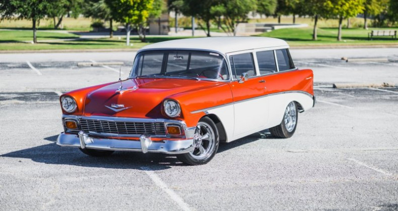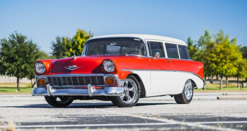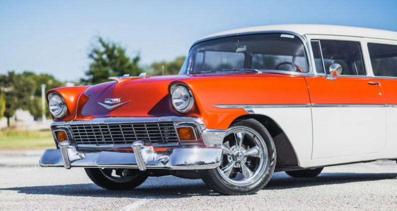 Le garage Earth MotorCars propose un 1956 Chevrolet 210 Handyman Wagon restauré. Ce véhicule de collection, fini en deux tons orange et blanc, a bénéficié d'un surmontage mécanique et esthétique en 2016. Son moteur V8 de 350 ci a été remplacé et est associé à une transmission automatique à trois vitesses. Il dispose de freins à disque avant, de freins à tambour arrière, de pompe à air et d'un système audio Pioneer Bluetooth. Le véhicule a été soumis à un travail inclusant le réfinissage extérieur, le rafraîchissement de l'intérieur, le redessus du système de freinage et le rabotage de l'essieu avant. Le coffre est recouvert de cuir blanc, avec des appuis-jambes en drap de chambre et une plaque de matériel audio. Le capot moteur est chromé. Les roues ont un diamètre de 17 pouces en avance et de 18 pouces à l'arrière.. Ce descriptif est basé sur les éléments communiqués par le propriétaire avec un traitement assisté. Merci pour votre indulgence en cas de formulation perfectible. Provenance : Texas. Disponibilité : 7 semaines, clés en main. 63 000 € tout compris (importation, taxes, procédure d'immatriculation). Annonce publiée le 13/11/2025