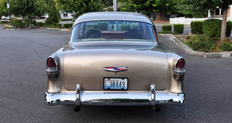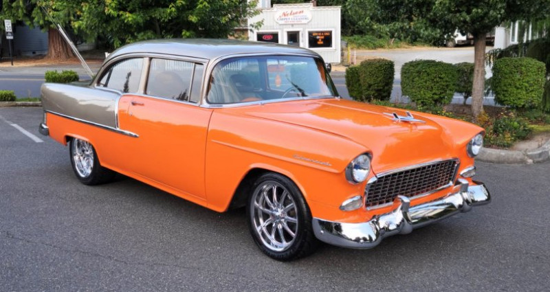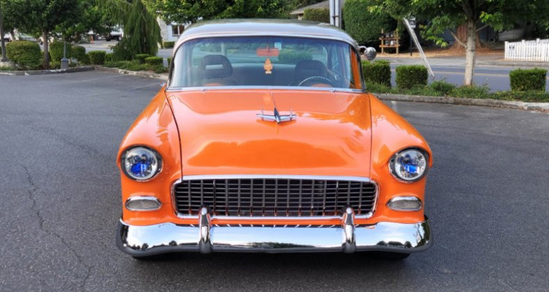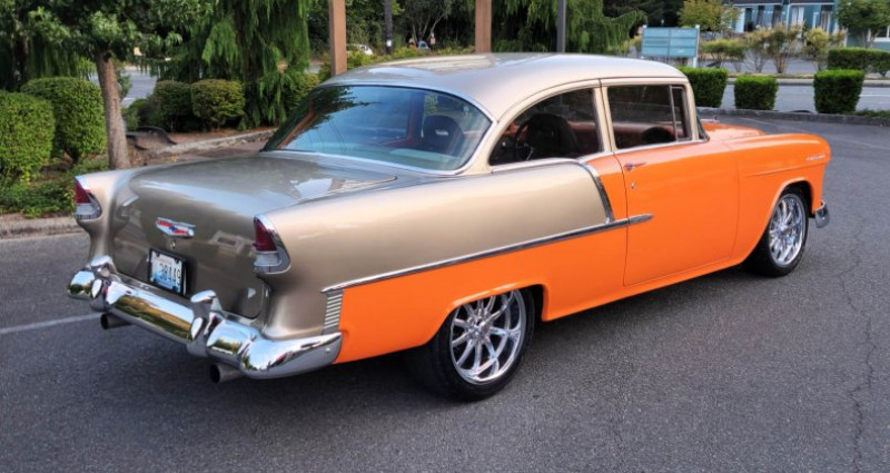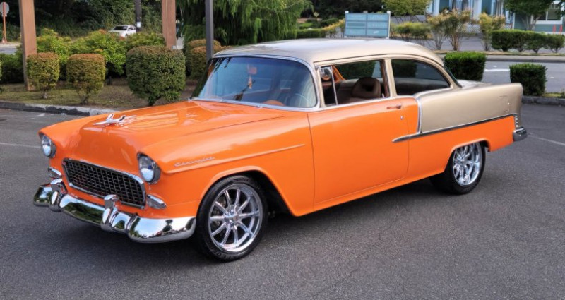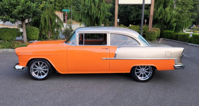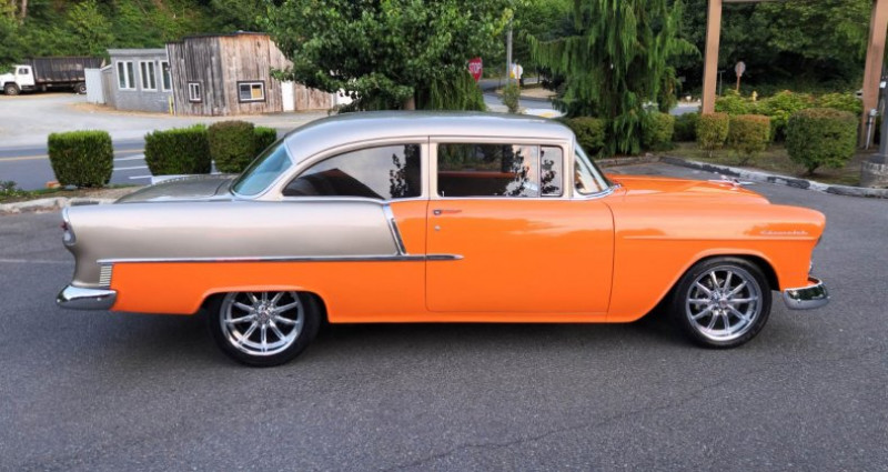 - 1955 Chevrolet 210 Pro-touring - Couleur : Orange flake & Smoke silver - Moteur : Stroker 383 - Boîte de vitesses : Automatique - P.S. - Radiateur : Griffin 4-core aluminum - Diffusoire d'air : Custom fan shroud - Dégivrageurs : Alumicote headers, 3-inch exhaust - Collecteur d'air : Polished air-gap intake manifold - Carburateur : Holley dual feed carb - Filtration d'air : Custom ram air chrome-plated dual snorkel air cleaner - Verre teinté - Volant : Chromé-plaqué et en cuir, colonne inclinable chrome-plaquée - Renforts avant et arrière : Re-chromés et renforcés - Boîte à outils : Lokar shifter - Système audio Kenwood dans le compartiment à gants - Intérieur : Cuir et suede brun clair - Console : Avec compteurs CNSPEED et cup holders - Jantes : 18'' 10-spokes US chromées - Pneus : 225-45-18'' (avant) / 275-45-18'' (arrière) - Construit à Oakland - V.I.N. : B550016794 - Numéro d'inventaire : 2582571 - Mileage : 178 miles - Numéro de série d'origine : non fourni - Marques de contact : Adolfo Sandoval, Jim Grant (numéros de téléphone non fournis). Provenance : Washington. Disponibilité : environ 7 semaines, clés en main. 63 500 € tout compris (importation, taxes, procédure d'immatriculation). Annonce publiée le 02/12/2025