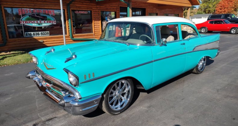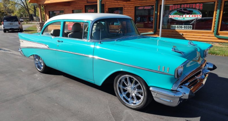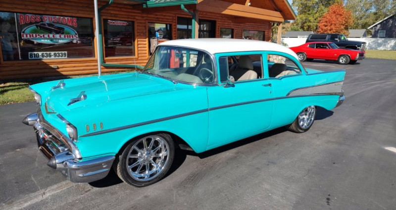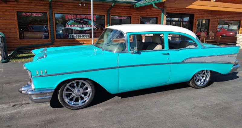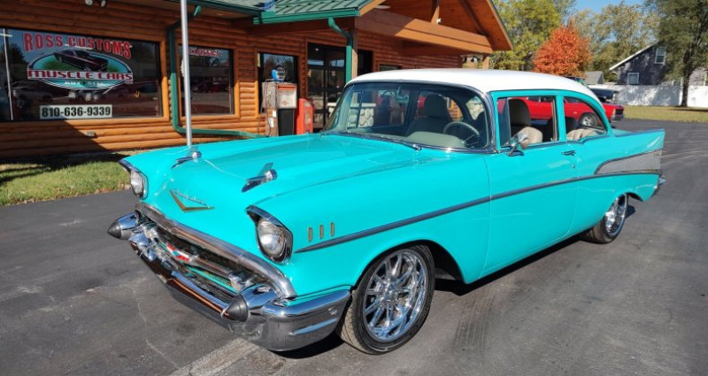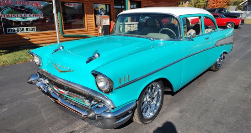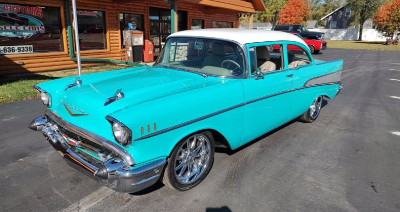 - Marque : Chevrolet - Modèle : 210 Bel Air - Année : 1957 - Numéro d'inventaire : 101525 - Couleur extérieure : Turquoise & Blanc - Couleur intérieure : Mocha clair - Type de carrosserie : Coupé - Boîte de vitesses : Automatique - Type de carburant : Essence - Moteur : 350 - Kilométrage : 2 500 miles - Transmission arrière : Propulsion arrière - Suspension avant : Suspension mise à jour - Freins avant : Freins avant à disque - Freins arrière : Pas spécifié - Jantes : 18x8 avant, 20x10 arrière (US Mag 10 spoke Rambler) - Équipement intérieur : Tableau de bord rafraîchi, colonnes de direction à réglage inclinable, sièges avant réglables en hauteur, sièges arrière avec rangement pour coupes et tasses, console centrale équipée de levier de vitesses LoKar fonctionnel - Échappement : RamHorn, 2 1/2 pouces double échappement - État général : Très propre. Provenance : Michigan. Disponibilité : environ 7 semaines, clés en main. 50 000 € tout compris (importation, taxes, procédure d'immatriculation). Annonce publiée le 19/12/2025