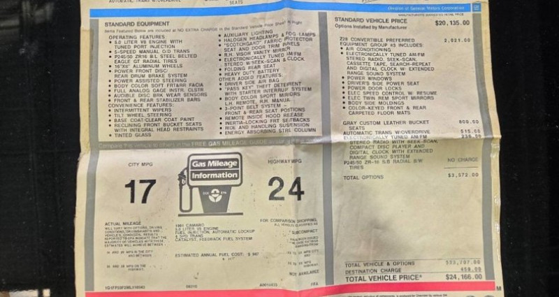 Le 1991 Chevrolet Camaro Z28 Convertible présente un kilométrage original et certifié de 57 000 milles, est détenu et entretenu par des adultes, est entièrement stock et inmodifié, et possède un intérieur de cuir gris impeccable. Equipé d'un moteur V8 de 5, 0L de puissance et d'une transmission manuelle à cinq rapports, il offre un excellent état général, sans problèmes mécaniques connus et un manque de corrosion. Il est équipé d'un système audio/vidéo de fabrication et peut être financé à bas taux d'intérêt sur le long terme avec un processus d'approbation rapide. L'acheteur est responsable de vérifier l'existence et l'état de tous les équipements listés.. Ce descriptif est basé sur les éléments communiqués par le propriétaire avec un traitement assisté. Merci pour votre indulgence en cas de formulation perfectible. Provenance : Illinois. Disponibilité : 7 semaines, clés en main. 29 000 € tout compris (importation, taxes, procédure d'immatriculation). Annonce publiée le 01/11/2025