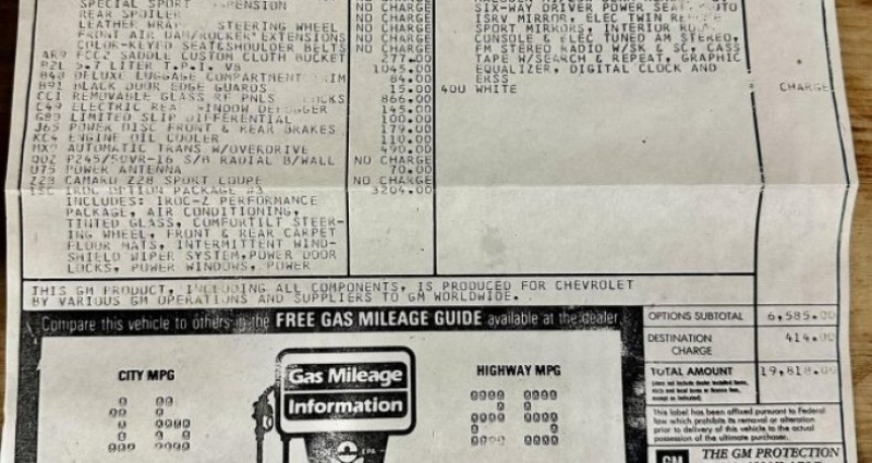 Ce 1987 Chevrolet Camaro IROC-Z est un véhicule unique, ayant appartenu à un seul propriétaire et ayant parcouru 59 000 miles originaux. Livré à Woody Jepsen Chevrolet à Green Bay, WI, le véhicule a été protégé contre la corrosion au moment de l'achat grâce à un traitement Ziebart et a été exceptionnellement bien conservé depuis. Equipé du rare et désirable moteur 5.7L Tuned Port Injection V8, de toits T-Tops fabriqués en usine, ainsi qu'une longue liste de documents d'origine tels que la feuille de prix, les livrets de garantie et les documents d'origine du concessionnaire, cette IROC-Z se distingue en tant qu'exemplaire de collection en bon état de survie. L'état général du véhicule est bon et il est muni d'un bonnet ouvert et net, de roues en alliage d'IROC en excellents état et de sièges de cuir en Saddle. La carrosserie est blanche, la peinture est claire et lisse, avec quelques petits blemishes d'âge adéquats. Les équipements comprennent la radio AM/FM cassette avec système d'amplification de haut parleurs premium, la climatisation et la direction assistée. Le véhicule a été inspecté et révisé soigneusement pour garantir le meilleur niveau de qualité.. Ce descriptif est basé sur les éléments communiqués par le propriétaire avec un traitement assisté. Merci pour votre indulgence en cas de formulation perfectible. Provenance : Michigan. Disponibilité : 7 semaines, clés en main. 33 500 € tout compris (importation, taxes, procédure d'immatriculation). Annonce publiée le 05/11/2025
