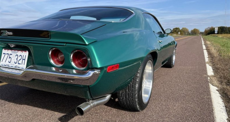 Le Camaro de 1971 sous la couleur verte House of Colors et noire présenté ici est doté d'une carrosserie rectiligne, équipé d'appui-toit et d'appui-portières en billet de Ring Brothers. Il est motorisé par un LS2 de 6, 0 L, muni d'une injection de carburant contrôlée par Holley. La boîte automatique 4L60 fonctionne très bien et est contrôlée par un levier de vitesses B&M. Le pont arrière d'une camaro plus récente est un 10 boutons posi doté de 3:73 pignons. Les échappements en céramique plein-longueur sont équipés d'un système d'échappement en acier inoxydable Pypes M80, qui émet un beau bruit. Le pont arrière est doté d'un dispositif de freinage à quatre roues. Les roues Boze en alliage de Magnésium sont de calibre 18x8 pour l'avant et 18x9 1/2 pour l'arrière, montées avec de nouvelles bandes de pneus Toyo. Le véhicule est équipé de lumières LED tout autour avec signal de tournant arrière séquentiel. La voiture dispose de toutes les fonctionnalités modernes et d'une source de puissance moderne. La voiture est bien règlée, toutes les lumières, la clarté, les aiguilleurs, le climatisation fonctionnent parfaitement. La carte d'immatriculation de l'État du Missouri est propre.. Provenance : Missouri, USA. Disponibilité : 7 semaines, clés en main. 71 000 € tout compris (import, taxes, procédure d'immatriculation). Annonce publiée le 10/11/2025