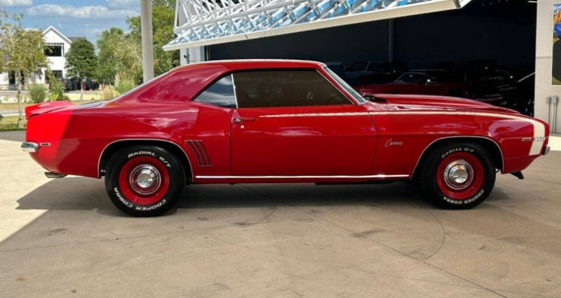 - 1969 Chevrolet Camaro - Stock #: 2324-FL - Exterior Color: Red - Interior Color: Black - Body Type: Convertible - Transmission: automatic - Engine: 383 V8 - Mileage: 69, 686 - Open-air chrome air cleaner assembly with chrome lid - Performance 4-barrel carburetor - Aluminum intake manifold - Billet Chevrolet logo valve covers - Tube headers and Flowmaster mufflers - Power steering - 4-wheel CPP Power disc brakes - Automatic transmission with a 10-bolt rear end - Painted and detailed engine compartment and chassis - Red painted steel wheels with COPO style hubcaps - Cooper Cobra Radial GT raised white letter tires - Restored black interior with twin black bucket seats - Black SS steering wheel - Wood tone center console with Horseshoe shifter - Kenwood stereo system - Factory gauges and accessory gauges - New PPG base/clear red paint with white stripes - Chin spoiler - Rear deck spoiler - Cowl induction hood - Bumper guards. Provenance : Florida. Disponibilité : environ 7 semaines, clés en main. 62 000 € tout compris (importation, taxes, procédure d'immatriculation). Annonce publiée le 02/12/2025