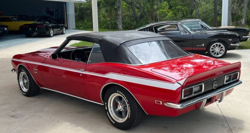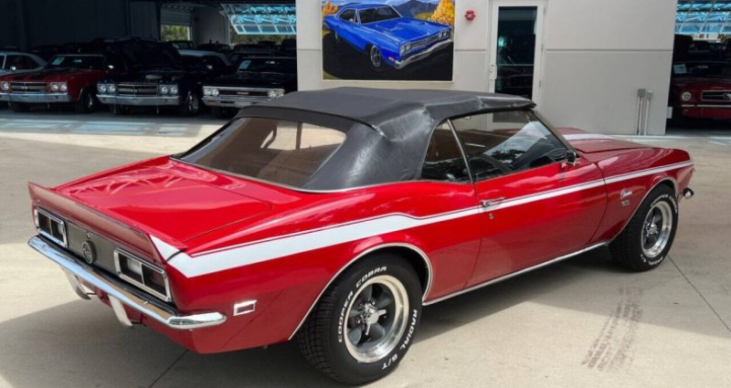 - Marque : Chevrolet - Modèle : Camaro - Année : 1968 - Type de carrosserie : Cabriolet - Couleur extérieure : Rouge - Couleur intérieure : Noir - Moteur : 396 V8 - Boîte de vitesses : 4 vitesses manuelle - Kilométrage : 87 146 - Transmission : 4-pistons freinage avant/arrière - Jantes : 5-rayons gris et poli - Pneus : Cooper Cobra Radial GT - Peinture : Peinture PPG base/clear - Stripes : Blanches sur les côtés, sur le capot et sur la spoiler arrière - Spoiler : Spoiler arrière D80 - Capot : Capot avec stripes - Stereo : Système audio amélioré - Tableau de bord : Tableau de bord restauré - Siège : Sièges noirs restaurés - Dash : Dash original - Chromage : Chromage bien conservé sur les pare-chocs avant et arrière - Seller : Skyway Classics. Provenance : Florida. Disponibilité : environ 7 semaines, clés en main. 62 500 € tout compris (importation, taxes, procédure d'immatriculation). Annonce publiée le 05/12/2025