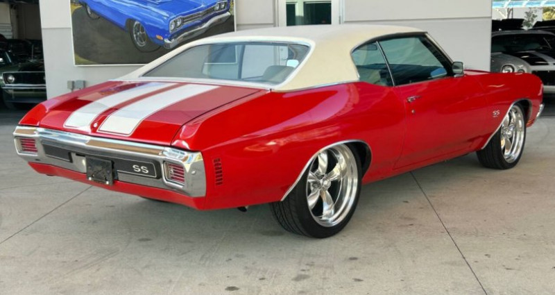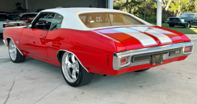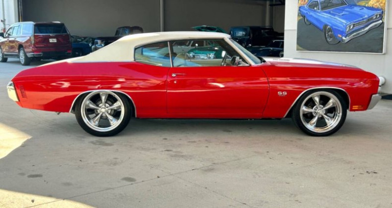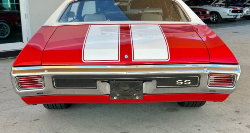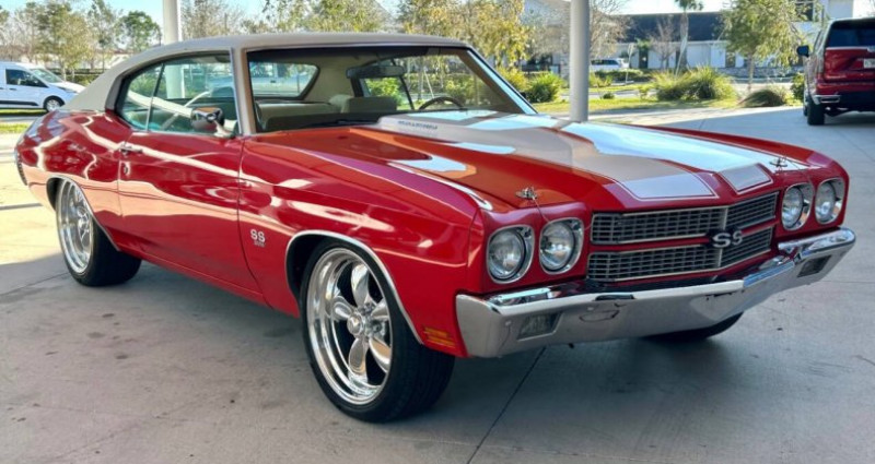 Le véhicule en question est un 1970 Chevrolet Chevelle SS restauré, doté d'un puissant moteur V8 de 396 cubic inch avec boîte de vitesses manuelle à 4 rapports. Sa carrosserie est de couleur rouge avec bandes blanches et il est équipé d'une capote de couleur blanc. Le tableau de bord est restauré, ainsi que les sièges rouges avec têtes-repos et les sièges arrière et portières identiques. Le tableau de bord présente un radio Chevrolet, un ensemble de jauges circulaires, un 4-speed shifter et une roue de volon à trois branches. Le véhicule est également équipé de freins assistés, de direction assistée, d'un climatiseur, d'un filtre à air ouvert élémentaire avec couvercle en chrome et une décale 396, d'une antenne parabole et d'un collecteur d'échappement à double échappement. Les roues sont des magnesium à rayons polies avec pneumatiques à bande noire large. L'ensemble est en très bon état, avec des panneaux lisses, une grille à mailles noires noircie, des ailes bombées, une coque de capote blanche et des bumper chromés.. Ce descriptif est basé sur les éléments communiqués par le propriétaire avec un traitement assisté. Merci pour votre indulgence en cas de formulation perfectible. Provenance : Florida. Disponibilité : 7 semaines, clés en main. 91 500 € tout compris (importation, taxes, procédure d'immatriculation). Annonce publiée le 06/11/2025