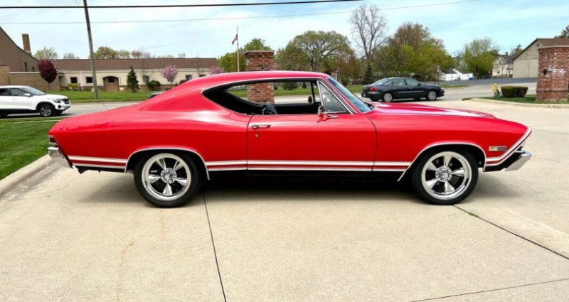 1968 Chevrolet ChevelleCoupeRWD454 V8700R Overdrive Automatic TransmissionVintage Air Conditioning and heatCeramic coated headers2 1/2 exhaust w/ dual Flowmaster mufflers12 bolt rear end w/ sway barChrome valve covers and air cleanerEdelbrock Performer RPM aluminum intakeHolley Dual feed carburetorH.E.I ignitionNew gas tank and linesPoly BushingsPower steeringPower disc brakes18 US Mag Chrome wheels w/ staggered tire sizes3 spoke aluminum steeling wheelTrunk mat, no spareAluminum headsHolley Dual feed carburetorH.E.I ignitionNew gas tank and linesPoly BushingsPower steeringPower disc brakes18 US Mag Chrome wheels w/ staggered tire sizes3 spoke aluminum steering wheelTrunk mat, no spareTorch Red paint base/clear coatNew chrome, trim, glass, sealsNew Dakota digital dashBucket seats and console all new. Provenance : Michigan. Disponibilité : environ 7 semaines, clés en main. 82 000 € tout compris (importation, taxes, procédure d'immatriculation). Annonce publiée le 02/12/2025