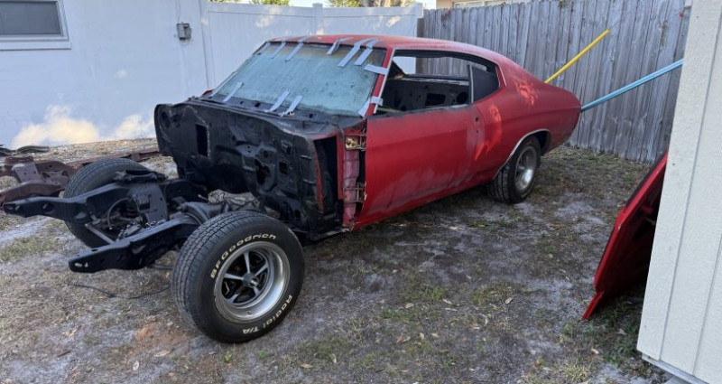 - Année : 1970 - Marque : Chevrolet - Modèle : Chevelle - Couleur : Rouge - État : Needs some work - Kilométrage : 1 mile - Travaux : Solides planchers, plancher de coffre solide, planches arrière solides - Titre : Titre propre de Floride - Équipement : Siège arrière OEM, Sièges avant OEM de coffre - État de la carrosserie : Manque du panneau d'aile avant intérieur. Provenance : Florida. Disponibilité : environ 7 semaines, clés en main. 23 000 € tout compris (importation, taxes, procédure d'immatriculation). Annonce publiée le 31/12/2025