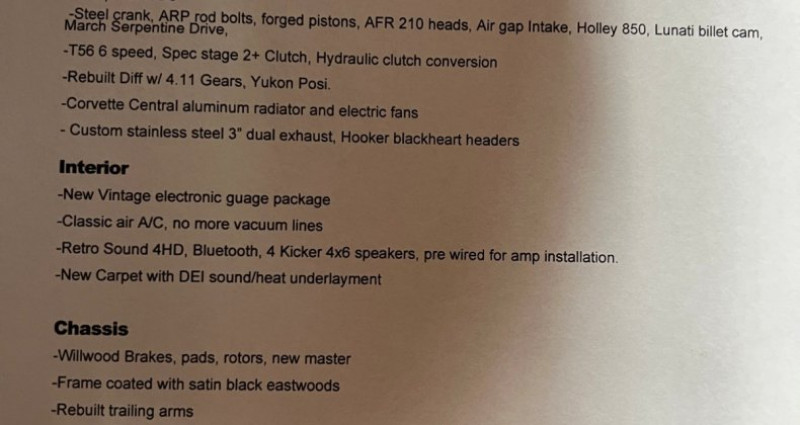 Cette 1976 Corvette Restomod dispose d'un moteur 406 SBC de 525 chevaux, associé à une transmission manuelle à six vitesses Tremec et à des roues arrière équipées de 411 engrenages. Toutes les modifications ont été effectuées pendant l'hiver dernier. Elle est équipée d'un système de courroies accessoires de mars, d'un système de climatisation classique à R-134 Freon, de nouveaux gages électroniques en style vintage, d'un radiateur en aluminium avec des ventilateurs de refroidissement électriques, d'actuateurs d'aube d'headlamp à action électrique avec des projecteurs à LED, d'une radio 4HD Bluetooth Retrosound avec quatre nouveaux haut-parleurs Kicker et de freins à disque Wilwood sur toutes les roues. La suspension arrière a été entièrement remplacée, avec des joints, bras et roulements de suspension neufs, tandis que la suspension avant est serrée avec des roulements d'essieu neufs et des roulements de roue remplis. (Voir les photos pour le dossier de la construction.). Ce descriptif est basé sur les éléments communiqués par le propriétaire avec un traitement assisté. Merci pour votre indulgence en cas de formulation perfectible. Provenance : New Hampshire. Disponibilité : 7 semaines, clés en main. 28 000 € tout compris (importation, taxes, procédure d'immatriculation). Annonce publiée le 17/10/2025