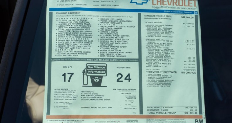 Ce 1994 Corvette Convertible, doté d'un toit fixe fabriqué, est un véhicule rare avec un kilométrage original de seulement 145 miles. Il s'agit d'une des 116 Convertibles construites à la demande en couleur Copper Metallic. Le véhicule est équipé d'une transmission automatique, de sièges sport en cuir réglables à six voies, de commandes de conduite électroniques et d'un rapport d'axe de performance. Le toit fixe fabriqué n'a jamais été démonté du véhicule.. Ce descriptif est basé sur les éléments communiqués par le propriétaire avec un traitement assisté. Merci pour votre indulgence en cas de formulation perfectible. Provenance : South Dakota. Disponibilité : 7 semaines, clés en main. 54 000 € tout compris (importation, taxes, procédure d'immatriculation). Annonce publiée le 16/10/2025