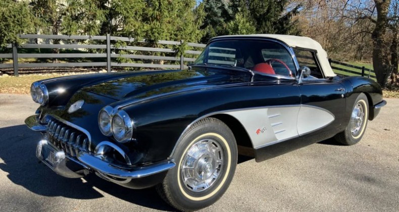 Cet automobile en question est une Corvette de l'année 1959 entièrement restaurée à partir de son châssis, équipée d'un moteur 283/270 avec quatre soupapes par cylindre, transmission manuelle à quatre vitesses. La carrosserie est peinte en noir, avec des côtés en argent à motifs de couronne de 420 diamants. L'intérieur est en rouge et dispose d'un toit noir neuf, pneus blancs en caoutchouc de ligne. Le moteur a été remis à neuf et dispose d'un embrayage arrière posé.. Provenance : WI, USA. Disponibilité : 7 semaines, clés en main. 68 000 € tout compris (import, taxes, procédure d'immatriculation). Annonce publiée le 18/11/2025
