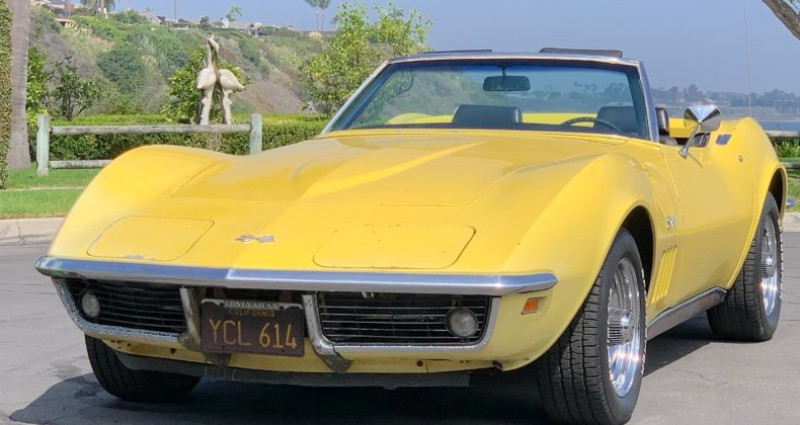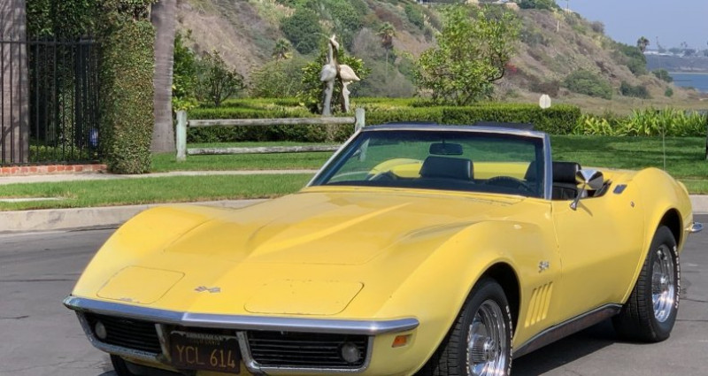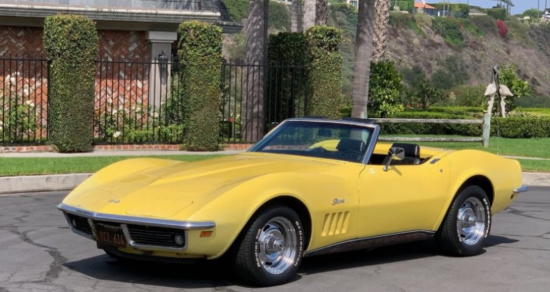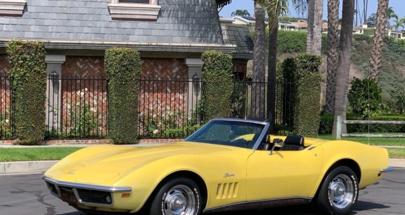 1969 Chevrolet Corvette Convertible, completely original 350/300, factory 4 speed, hard top, Daytona Yellow paint, California-resident, new fuel tank & radiator, fresh brakes & carburetor rebuild, 49, 000 miles (believed original), power brakes, excellent chrome rally wheels & BF Goodrich Radial T/A tires, original interior in decent condition with minor wear, original black vinyl covered hard top in very good shape, period Motorola FM radio installed, unrestored and unmolested. Provenance : California. Disponibilité : environ 7 semaines, clés en main. 31 500 € tout compris (importation, taxes, procédure d'immatriculation). Annonce publiée le 26/11/2025