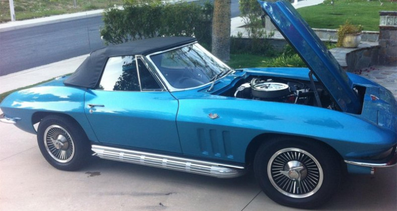 1966 convertible Stingray - Power steering - Power brakes - Aftermarket air conditioning (AC) - Shoulder seat belts (aftermarket) - Aftermarket side pipe exhaust - Knockoff replica wheels - Rebuilt engine - Rebuilt transmission - Rebuilt seals - Rebuilt carburetor - Low mileage (annual usage: up to 1000 miles) - California car (plate) - Rebuilt: engine, transmission, seals, carburetor (runs well). Provenance : California, USA. Disponibilité : environ 7 semaines, clés en main. 72 500 € tout compris (import, taxes, procédure d'immatriculation). Annonce publiée le 02/12/2025