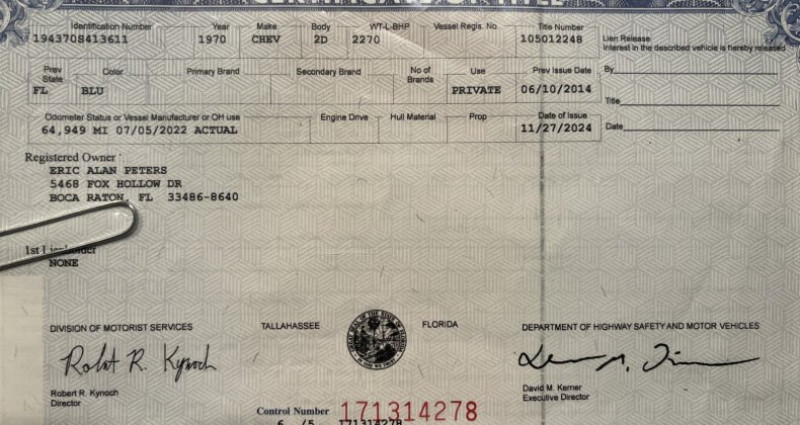 - Marque : Chevrolet - Modèle : Corvette - Année : 1970 - Kilométrage : 64 949 miles (titre circlé en rouge dans la photo) - Couleur : Originale - Intérieur : Originale, cuir ferme, sans déchirures/coupures/déchirures - Toit T-Top : Originale, avec stockage en cuir - Boîte de vitesses : Manuelle - Moteur : 350 - État : Garage-conservé, quelques blemishes (chips de peinture, chrome arrière à refaire, surface de roues et couvertures moteur rouillées). Provenance : Florida. Disponibilité : environ 7 semaines, clés en main. 22 500 € tout compris (importation, taxes, procédure d'immatriculation). Annonce publiée le 29/12/2025