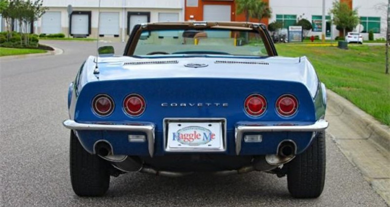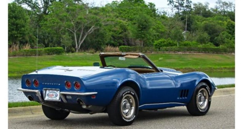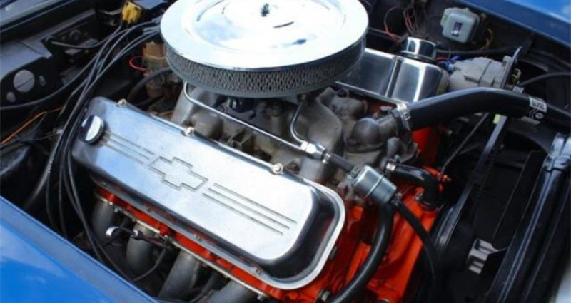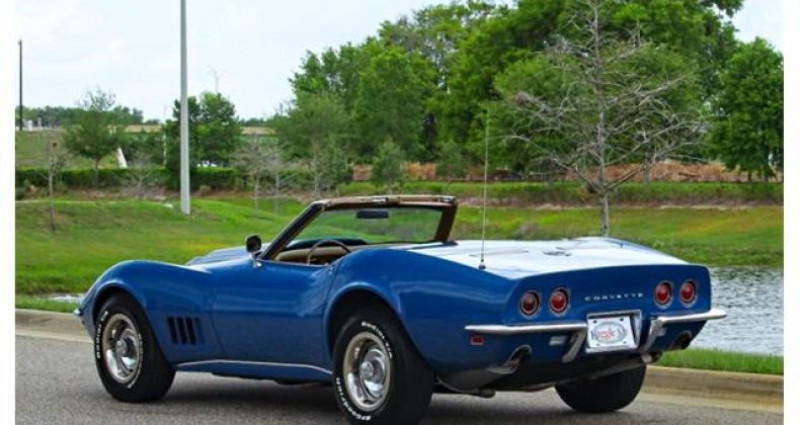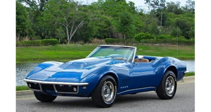 Cette Chevrolet Corvette décapotable de 1968, de couleur Targa Blue, est équipée d'un moteur V8 Big Block et d'une transmission manuelle à vitesses. Elle dispose également d'un différentiel arrière Posi Traction et d'un capot Stinger, indiquant un excellent état de conduite.