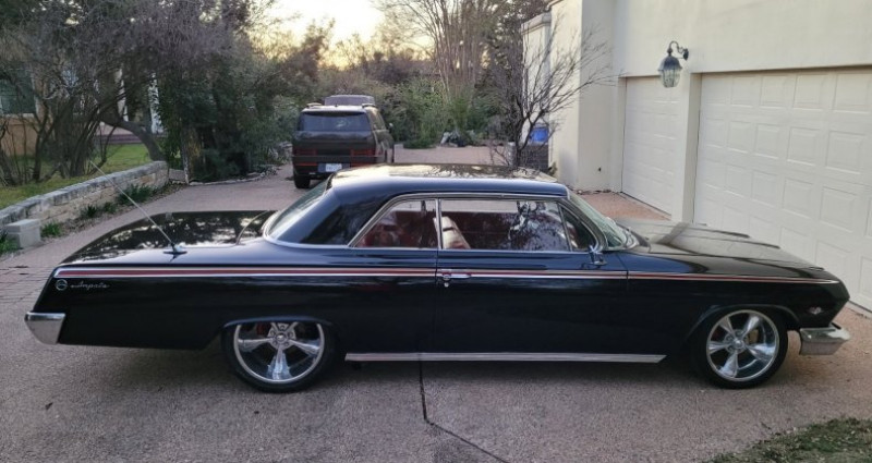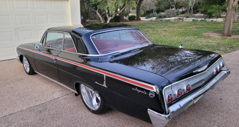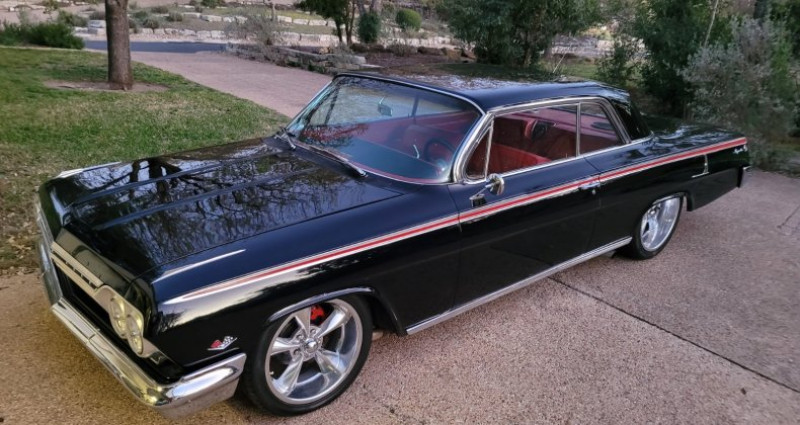 1962 Chevy Impala, Big Block 496 engine, 700R4 overdrive transmission, lowered suspension, 18x8 front wheels, 20x10 rear wheels, 4-wheel slotted disc brakes, A/C, aluminum radiator with dual electric fans, POSI rear end, tilt steering wheel with Ididit column, Holley Street Avenger 870 CFM 4-Barrel Carburetor, red interior, original straight stainless trim, Tuxedo black paint, dual side-pipe exhausts, electric vacuum pump w/ vacuum reservoir cannister, Interstate 800 CCA MTP-78 battery, Larger higher capacity alternator, Fitech GO EFI 30002 kit (included in sale, if asking price met). Provenance : Texas. Disponibilité : environ 7 semaines, clés en main. 42 000 € tout compris (importation, taxes, procédure d'immatriculation). Annonce publiée le 24/11/2025