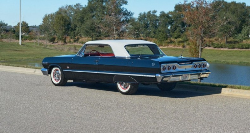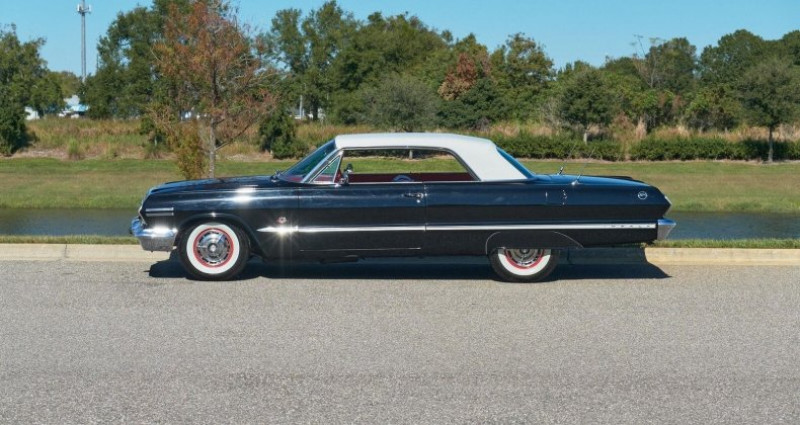 1963 Chevrolet Impala, 409 Big Block, 4 Speed Manual Transmission, RWD, Tuxedo Black exterior, Red interior, 425 HP, Factory Air Conditioning, Real 900 Paint Code, Correct Trim Code 874 Red Cloth Bench Seat. Provenance : Florida. Disponibilité : environ 7 semaines, clés en main. 63 500 € tout compris (importation, taxes, procédure d'immatriculation). Annonce publiée le 27/11/2025