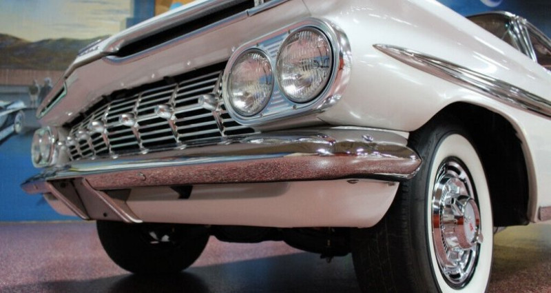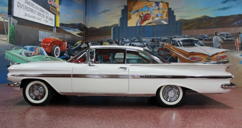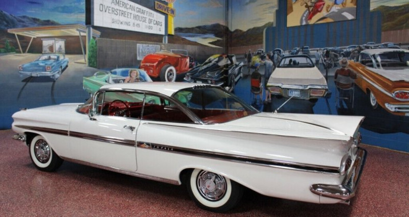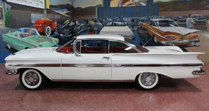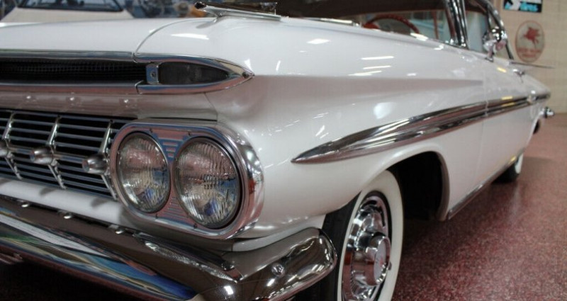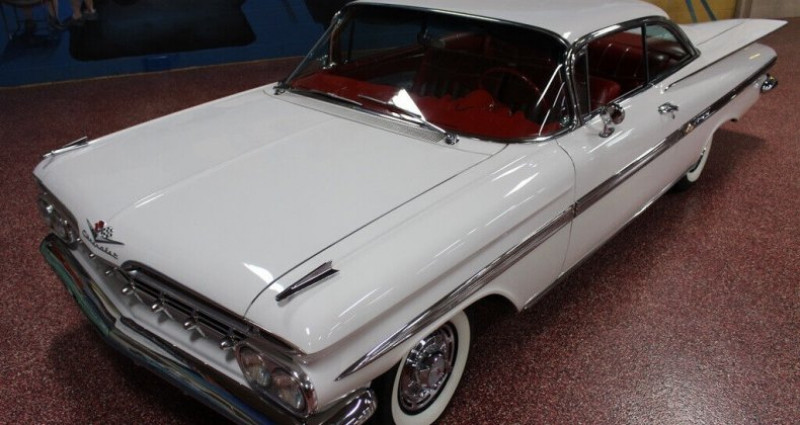 1959 Chevrolet Impala Coupe Sport, White exterior, Red interior, 409 V8, Manual 4-SPEED, Factory Air Conditioning, Power Steering, Power Brakes, Power Windows, Rotisserie body-off restoration, Crossed Flag Emblems, Centered Side Spear, Spinner Type Wheel Covers, Steel Wheels with Fresh Goodyear Radial Rubber, Bat-Wing Design Trunk Lid, Cats-Eye Taillights. Provenance : Missouri. Disponibilité : environ 7 semaines, clés en main. 146 000 € tout compris (importation, taxes, procédure d'immatriculation). Annonce publiée le 30/11/2025