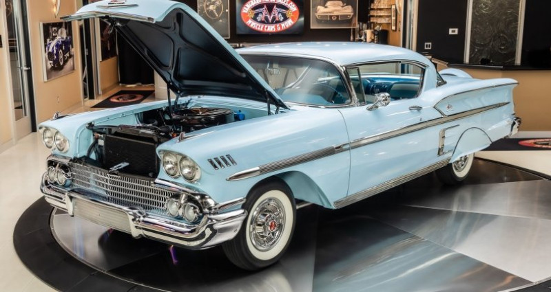 1958 Chevrolet Impala. Coupé. Moteur 348 V8. Boîte mécanique 2 vitesses automatique Type Powerglide. Intérieur triple tonalité bleu. Mileage 10, 505. Équipements : climatisation après-marché, freinage électrique, roues d'origine avec pneumatiques de chaussure blanche, suspenson à ressorts hélicoïdaux. Condition généralement bonne. Vidéo Description non fournie.. Provenance : Michigan. Disponibilité : environ 7 semaines, clés en main. 128 000 € tout compris (importation, taxes, procédure d'immatriculation). Annonce publiée le 01/12/2025