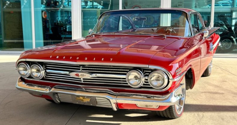 - 1960 Chevrolet Impala - Stock #: 2163-FL - Exterior Color: Red - Interior Color: Red - Body Type: Wagon - Transmission: automatic - Engine: 348 V8 - Mileage: 39, 150 - 348 Cubic Inch engine - Orange painted engine block and heads - New Edelbrock twin 4-barrel carbs - Polished intake - Polished Chevrolet scripted valve covers - Original factory air conditioning - Chrome finned open air cleaner - Factory cast iron exhaust manifolds - Power steering - Power brakes with front discs - Modified suspension with Air Ride - Polished 5-spoke mag wheel - Red Line tires - Red and white interior - Red custom steering wheel - Sporty pod-style gauges - Red carpeting - Matching door panels and headliner - Restored trunk with custom inserts - Re-Painted in red/white two-tone - Bubble top design - Wraparound rear window - Chrome bumpers - Massive tailfins - Jet airplane inspired white and chrome trim - Triple taillights. Provenance : Florida. Disponibilité : environ 7 semaines, clés en main. 72 000 € tout compris (importation, taxes, procédure d'immatriculation). Annonce publiée le 02/12/2025