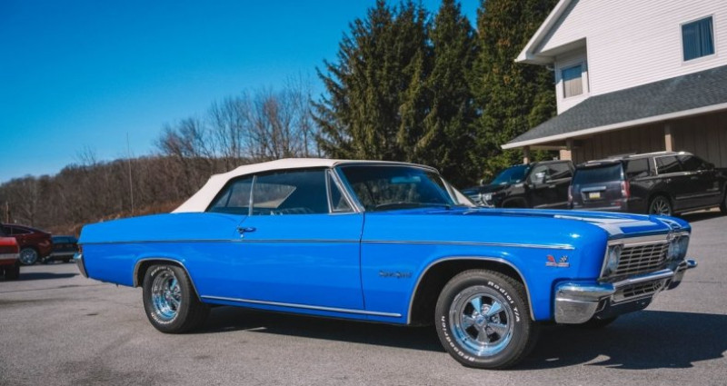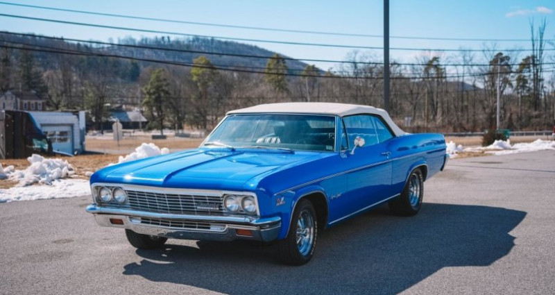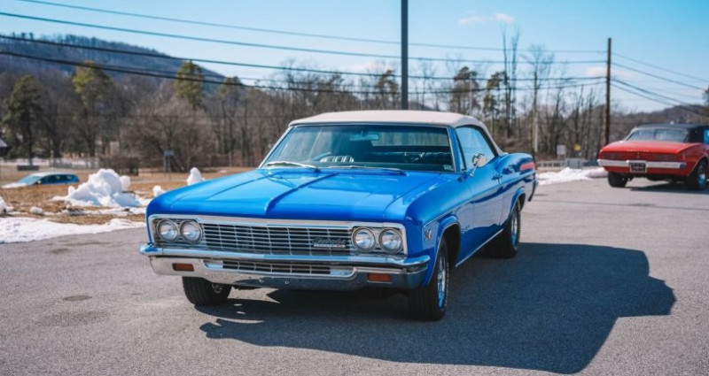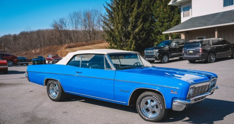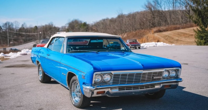 - Marque : Chevrolet - Modèle : Impala SS Convertible - Année : 1966 - Moteur : 427 V8, 335 ch - Boîte de vitesses : 4 vitesses manuelle Muncie M20 - Couleur extérieure : Bleu - Couleur intérieure : Noir - Kilométrage : 74 614 - Transmission de refroidissement : Radiateur aluminium Howe - Essieu arrière : 12-bolt - Roues : 15 pouces Cragar (nouvelles) - Toit : Power top blanc - Intérieur : Sièges en vinyle noir, console (code 813), avertisseurs de gaz, d'eau et d'ampères, disposition sportive - Système de climatisation : Vintage Air - Freins : Avant : disques de frein assistés, arrière : tambours de frein - Suspension : Suspension confortable - Localisation : Orwigsburg, Pennsylvanie, États-Unis. Provenance : Pennsylvania. Disponibilité : environ 7 semaines, clés en main. 49 500 € tout compris (importation, taxes, procédure d'immatriculation). Annonce publiée le 04/12/2025