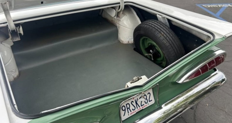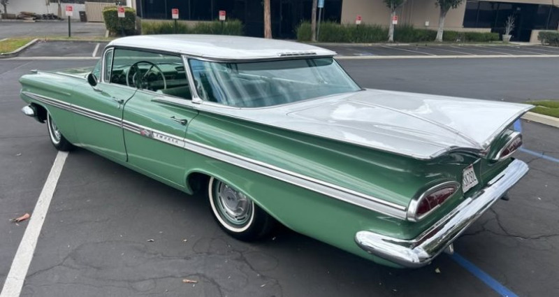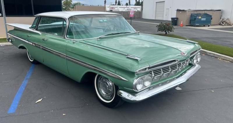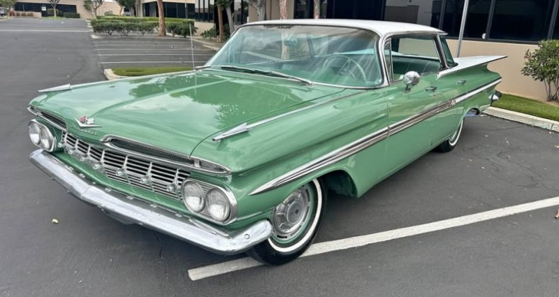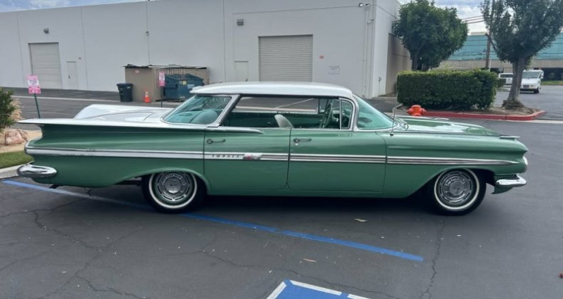 - Année : 1959 - Modèle : Chevrolet Impala - Type de carrosserie : Sport sedan à 4 portes - Moteur : 348ci V8 - Boîte de vitesses : Turboglide automatique - Couleur extérieure : Vert Highland Green (#953D) et blanc neige (Snowcrest White) - Intérieur : Tissu et cuir vert (#825) - État : 86 000 miles, 2 propriétaires, réaménagement de la peinture - Équipements : Freinage et direction assistés, roues de 14 pouces en acier, couvercles de roues polis, pneus neufs et pneu de rechange - État de fonctionnement : Démarre et roule bien. Provenance : California. Disponibilité : environ 7 semaines, clés en main. 58 000 € tout compris (importation, taxes, procédure d'immatriculation). Annonce publiée le 31/12/2025