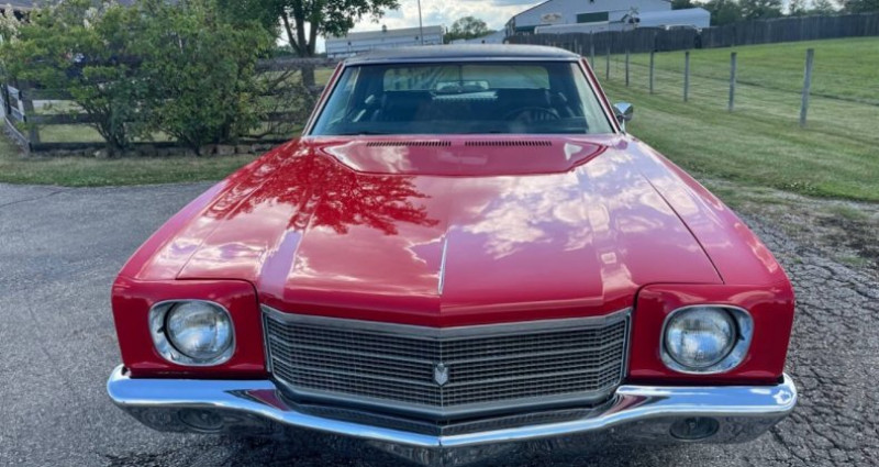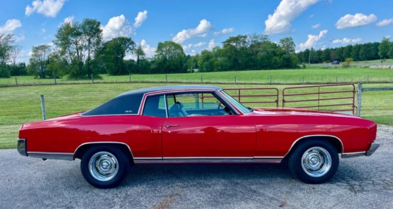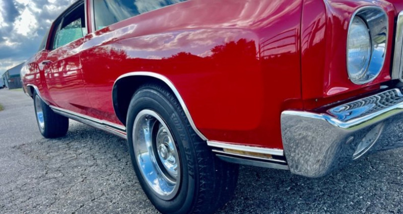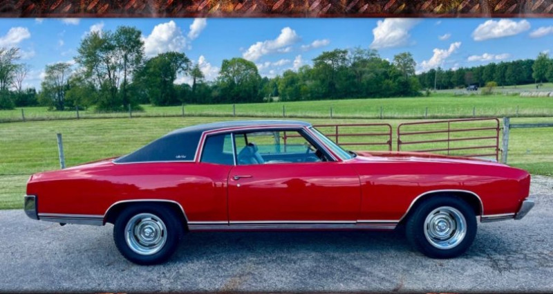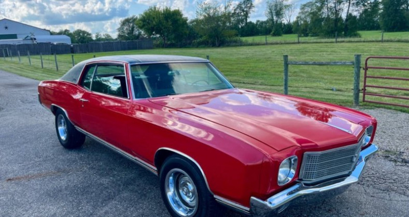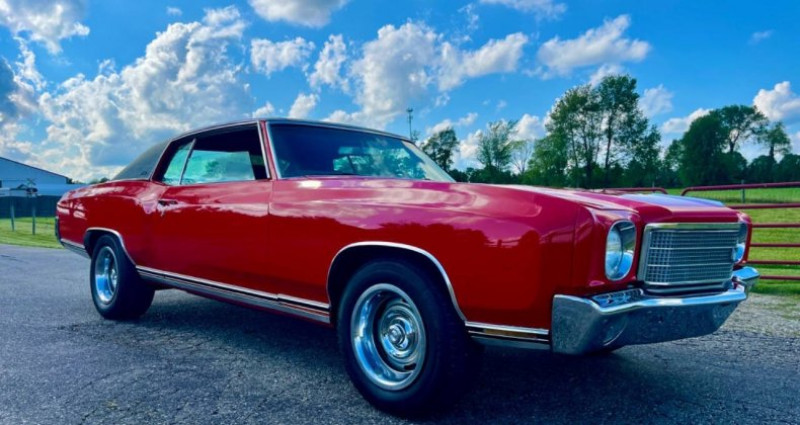 1970 Chevrolet Monte Carlo, Red, Black interior, Coupe, Automatic 3-Speed, Gasoline, V8 5.7L, Owned by 500 Classic Auto - Best to call (765) 345-5211, AC works but pump leaks, Power steering, Front power disc brakes, Bucket seats, Console, 1 repaint over 10 years ago, 1 Rust hole, New brakes, Rear drums, New booster, New A arm bushings, 2 dings on trunk lid, 1 crack on dashboard, Windows work, Black headliner, Stereo works, Spare and jack included, Trunk pan solid but could use respray, Clean Indiana title, Build sheet, Owners manual, Warranty card showing State of NC purchase in 1970.. Provenance : Indiana. Disponibilité : environ 7 semaines, clés en main. 32 500 € tout compris (importation, taxes, procédure d'immatriculation). Annonce publiée le 26/11/2025