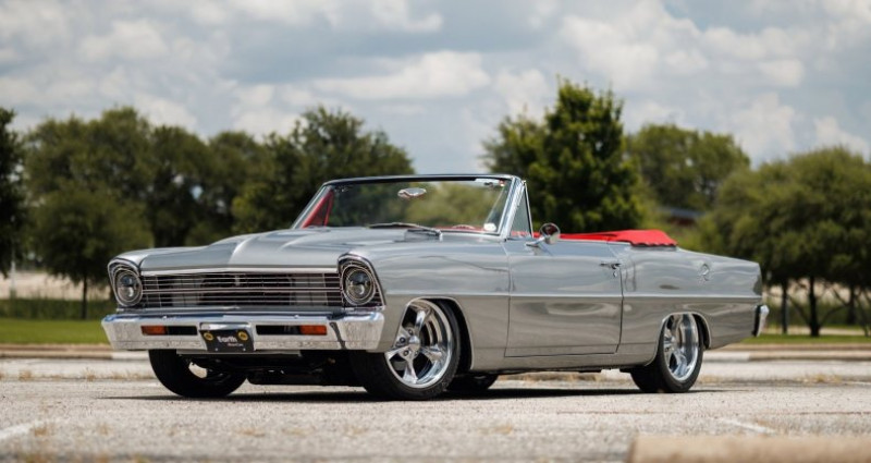 - Marque : Chevrolet - Modèle : Chevy II Nova - Type : Convertible - Année : 1967 - Couleur extérieure : Silver / Noir - Couleur intérieure : Rouge - Moteur : GM LS V8 - Boîte de vitesses : Automatique 4L60 - Suspension avant : Améliorée - Pneus : 225/45/17 Billet Specialties - Kilométrage : 985 miles - Toit : Convertible noir en bon état - Intérieur : Cuir récemment rafraîchi - Climatisation : Vintage Air A/C - Freins : Disques avant - Radiateur : 4-cœur aluminium - Direction : Manuelle - Options : Système audio Kenwood caché, fenêtres électriques, etc.. Provenance : Texas. Disponibilité : environ 7 semaines, clés en main. 76 000 € tout compris (importation, taxes, procédure d'immatriculation). Annonce publiée le 08/12/2025