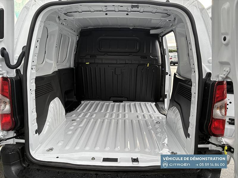 6 anneaux d'arrimage au sol dans la zone de chargement / Airbags conducteur et passager: frontaux, latéraux et rideaux / Boîte manuelle 6 vitesses / Capucine / Cloison pleine fixe / Commutation automatique des feux de route / Connect Box avec Pack SOS et assistance inclus / Contrôle de traction (TCS) / Côté passager: Boîte à gants fermée et réfrigérée en partie haute, Boîte à gant ouverte en partie basse / Détection de sous-gonflage / Essuie-vitres AV Magic Wash / Garnissage Tissus Curitiba Triton Meltem / Jantes tôle 15" grises avec pneumatiques 195/65 R15 90U / Kit de dépannage provisoire de pneumatiques / Pack Safety Alerte risque collision & Freinage d'urgence, Lecture des panneaux de vitesse, Détection & Alerte somnolence, Alerte franchissement de ligne avec correction / Portes AR battantes 60/40 tôlées avec ouverture à 180° / Preventive Maintenance (abonnement 4 ans inclus) Tableau de bord de la flotte, Alertes sur l'état du véhicule, Suivi de la maintenance (& calendrier), Envoi de rapports périodiques / Prise 12V sur planche de bord / Revêtement de sol en moquette dans l'habitacle / Siège conducteur avec réglage en longueur et dossier inclinable / Siège passager individuel réglable en inclinaison, appuis tête réglable en hauteur / Station d'accueil Smartphone, application radio avec streaming audio (2HP), Kit mains libres Bluetooth, 2 prises USB Type C (charge uniquement)